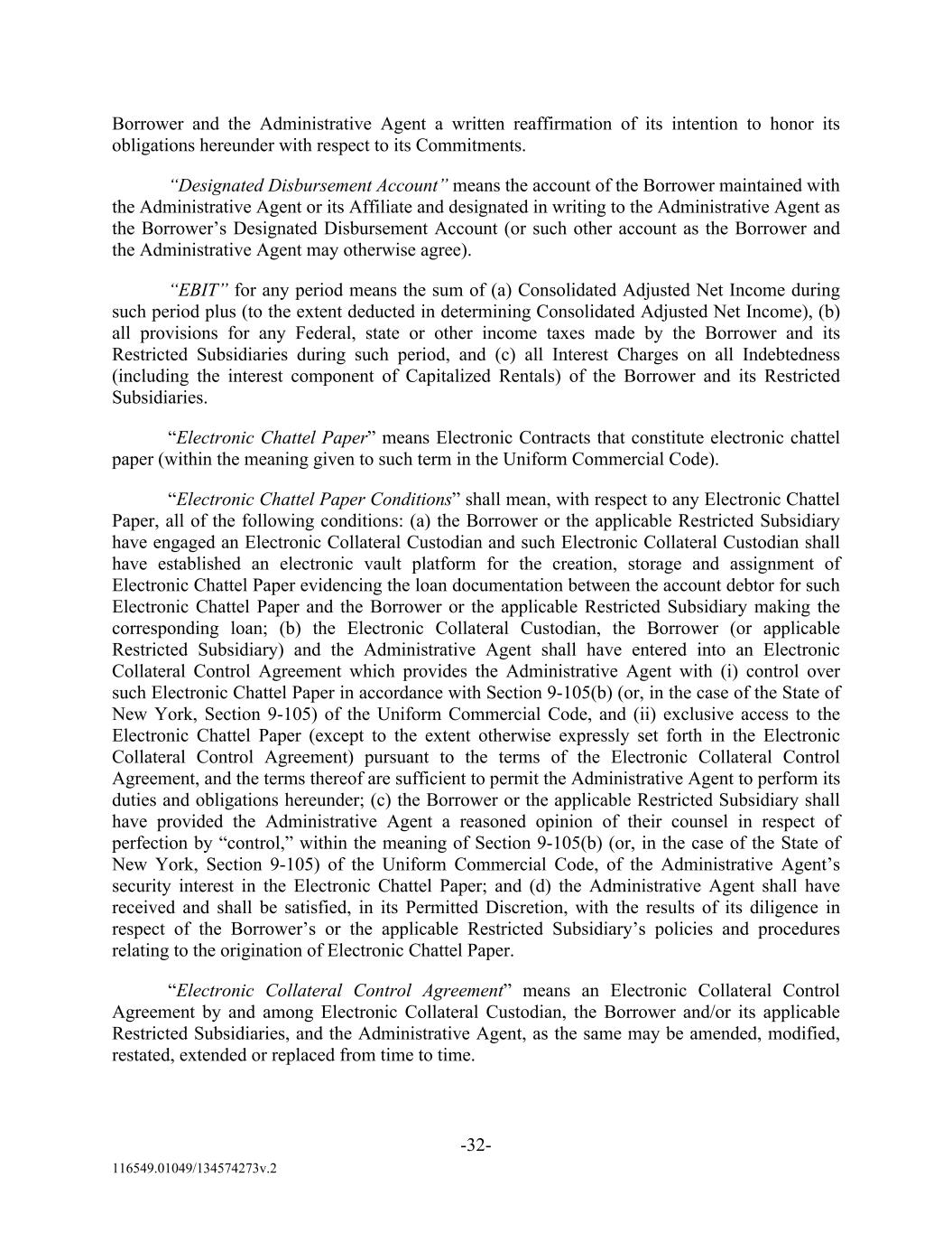 -32- 116549.01049/134574273v.2 Borrower and the Administrative Agent a written reaffirmation of its intention to honor its obligations hereunder with respect to its Commitments. “Designated Disbursement Account” means the account of the Borrower maintained with the Administrative Agent or its Affiliate and designated in writing to the Administrative Agent as the Borrower’s Designated Disbursement Account (or such other account as the Borrower and the Administrative Agent may otherwise agree). “EBIT” for any period means the sum of (a) Consolidated Adjusted Net Income during such period plus (to the extent deducted in determining Consolidated Adjusted Net Income), (b) all provisions for any Federal, state or other income taxes made by the Borrower and its Restricted Subsidiaries during such period, and (c) all Interest Charges on all Indebtedness (including the interest component of Capitalized Rentals) of the Borrower and its Restricted Subsidiaries. “Electronic Chattel Paper” means Electronic Contracts that constitute electronic chattel paper (within the meaning given to such term in the Uniform Commercial Code). “Electronic Chattel Paper Conditions” shall mean, with respect to any Electronic Chattel Paper, all of the following conditions: (a) the Borrower or the applicable Restricted Subsidiary have engaged an Electronic Collateral Custodian and such Electronic Collateral Custodian shall have established an electronic vault platform for the creation, storage and assignment of Electronic Chattel Paper evidencing the loan documentation between the account debtor for such Electronic Chattel Paper and the Borrower or the applicable Restricted Subsidiary making the corresponding loan; (b) the Electronic Collateral Custodian, the Borrower (or applicable Restricted Subsidiary) and the Administrative Agent shall have entered into an Electronic Collateral Control Agreement which provides the Administrative Agent with (i) control over such Electronic Chattel Paper in accordance with Section 9-105(b) (or, in the case of the State of New York, Section 9-105) of the Uniform Commercial Code, and (ii) exclusive access to the Electronic Chattel Paper (except to the extent otherwise expressly set forth in the Electronic Collateral Control Agreement) pursuant to the terms of the Electronic Collateral Control Agreement, and the terms thereof are sufficient to permit the Administrative Agent to perform its duties and obligations hereunder; (c) the Borrower or the applicable Restricted Subsidiary shall have provided the Administrative Agent a reasoned opinion of their counsel in respect of perfection by “control,” within the meaning of Section 9-105(b) (or, in the case of the State of New York, Section 9-105) of the Uniform Commercial Code, of the Administrative Agent’s security interest in the Electronic Chattel Paper; and (d) the Administrative Agent shall have received and shall be satisfied, in its Permitted Discretion, with the results of its diligence in respect of the Borrower’s or the applicable Restricted Subsidiary’s policies and procedures relating to the origination of Electronic Chattel Paper. “Electronic Collateral Control Agreement” means an Electronic Collateral Control Agreement by and among Electronic Collateral Custodian, the Borrower and/or its applicable Restricted Subsidiaries, and the Administrative Agent, as the same may be amended, modified, restated, extended or replaced from time to time.