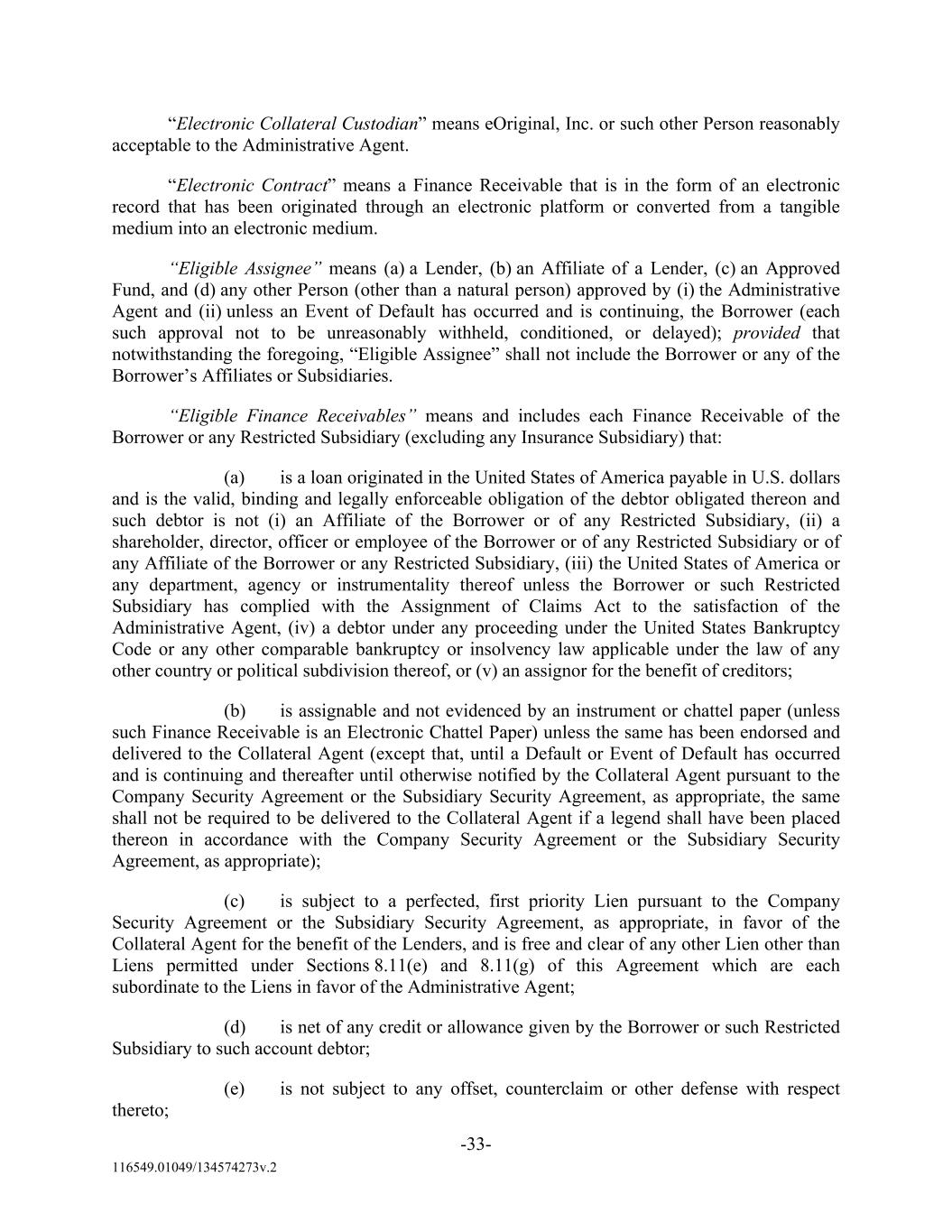 -33- 116549.01049/134574273v.2 “Electronic Collateral Custodian” means eOriginal, Inc. or such other Person reasonably acceptable to the Administrative Agent. “Electronic Contract” means a Finance Receivable that is in the form of an electronic record that has been originated through an electronic platform or converted from a tangible medium into an electronic medium. “Eligible Assignee” means (a) a Lender, (b) an Affiliate of a Lender, (c) an Approved Fund, and (d) any other Person (other than a natural person) approved by (i) the Administrative Agent and (ii) unless an Event of Default has occurred and is continuing, the Borrower (each such approval not to be unreasonably withheld, conditioned, or delayed); provided that notwithstanding the foregoing, “Eligible Assignee” shall not include the Borrower or any of the Borrower’s Affiliates or Subsidiaries. “Eligible Finance Receivables” means and includes each Finance Receivable of the Borrower or any Restricted Subsidiary (excluding any Insurance Subsidiary) that: (a) is a loan originated in the United States of America payable in U.S. dollars and is the valid, binding and legally enforceable obligation of the debtor obligated thereon and such debtor is not (i) an Affiliate of the Borrower or of any Restricted Subsidiary, (ii) a shareholder, director, officer or employee of the Borrower or of any Restricted Subsidiary or of any Affiliate of the Borrower or any Restricted Subsidiary, (iii) the United States of America or any department, agency or instrumentality thereof unless the Borrower or such Restricted Subsidiary has complied with the Assignment of Claims Act to the satisfaction of the Administrative Agent, (iv) a debtor under any proceeding under the United States Bankruptcy Code or any other comparable bankruptcy or insolvency law applicable under the law of any other country or political subdivision thereof, or (v) an assignor for the benefit of creditors; (b) is assignable and not evidenced by an instrument or chattel paper (unless such Finance Receivable is an Electronic Chattel Paper) unless the same has been endorsed and delivered to the Collateral Agent (except that, until a Default or Event of Default has occurred and is continuing and thereafter until otherwise notified by the Collateral Agent pursuant to the Company Security Agreement or the Subsidiary Security Agreement, as appropriate, the same shall not be required to be delivered to the Collateral Agent if a legend shall have been placed thereon in accordance with the Company Security Agreement or the Subsidiary Security Agreement, as appropriate); (c) is subject to a perfected, first priority Lien pursuant to the Company Security Agreement or the Subsidiary Security Agreement, as appropriate, in favor of the Collateral Agent for the benefit of the Lenders, and is free and clear of any other Lien other than Liens permitted under Sections 8.11(e) and 8.11(g) of this Agreement which are each subordinate to the Liens in favor of the Administrative Agent; (d) is net of any credit or allowance given by the Borrower or such Restricted Subsidiary to such account debtor; (e) is not subject to any offset, counterclaim or other defense with respect thereto;