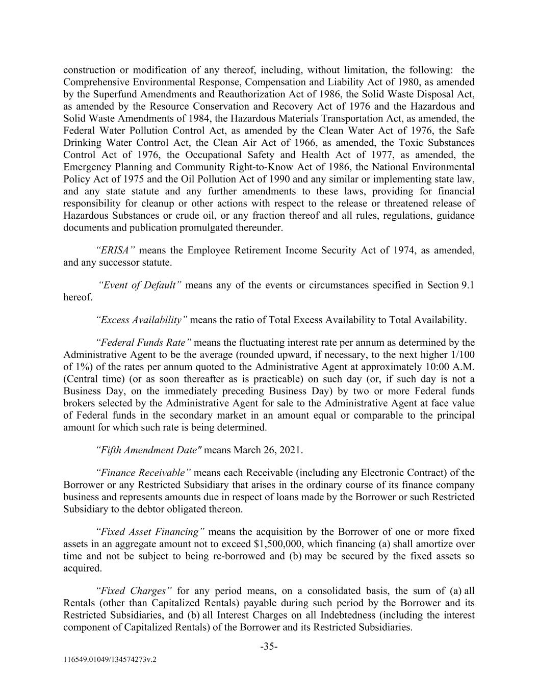 -35- 116549.01049/134574273v.2 construction or modification of any thereof, including, without limitation, the following: the Comprehensive Environmental Response, Compensation and Liability Act of 1980, as amended by the Superfund Amendments and Reauthorization Act of 1986, the Solid Waste Disposal Act, as amended by the Resource Conservation and Recovery Act of 1976 and the Hazardous and Solid Waste Amendments of 1984, the Hazardous Materials Transportation Act, as amended, the Federal Water Pollution Control Act, as amended by the Clean Water Act of 1976, the Safe Drinking Water Control Act, the Clean Air Act of 1966, as amended, the Toxic Substances Control Act of 1976, the Occupational Safety and Health Act of 1977, as amended, the Emergency Planning and Community Right-to-Know Act of 1986, the National Environmental Policy Act of 1975 and the Oil Pollution Act of 1990 and any similar or implementing state law, and any state statute and any further amendments to these laws, providing for financial responsibility for cleanup or other actions with respect to the release or threatened release of Hazardous Substances or crude oil, or any fraction thereof and all rules, regulations, guidance documents and publication promulgated thereunder. “ERISA” means the Employee Retirement Income Security Act of 1974, as amended, and any successor statute. “Event of Default” means any of the events or circumstances specified in Section 9.1 hereof. “Excess Availability” means the ratio of Total Excess Availability to Total Availability. “Federal Funds Rate” means the fluctuating interest rate per annum as determined by the Administrative Agent to be the average (rounded upward, if necessary, to the next higher 1/100 of 1%) of the rates per annum quoted to the Administrative Agent at approximately 10:00 A.M. (Central time) (or as soon thereafter as is practicable) on such day (or, if such day is not a Business Day, on the immediately preceding Business Day) by two or more Federal funds brokers selected by the Administrative Agent for sale to the Administrative Agent at face value of Federal funds in the secondary market in an amount equal or comparable to the principal amount for which such rate is being determined. “Fifth Amendment Date" means March 26, 2021. “Finance Receivable” means each Receivable (including any Electronic Contract) of the Borrower or any Restricted Subsidiary that arises in the ordinary course of its finance company business and represents amounts due in respect of loans made by the Borrower or such Restricted Subsidiary to the debtor obligated thereon. “Fixed Asset Financing” means the acquisition by the Borrower of one or more fixed assets in an aggregate amount not to exceed $1,500,000, which financing (a) shall amortize over time and not be subject to being re-borrowed and (b) may be secured by the fixed assets so acquired. “Fixed Charges” for any period means, on a consolidated basis, the sum of (a) all Rentals (other than Capitalized Rentals) payable during such period by the Borrower and its Restricted Subsidiaries, and (b) all Interest Charges on all Indebtedness (including the interest component of Capitalized Rentals) of the Borrower and its Restricted Subsidiaries.