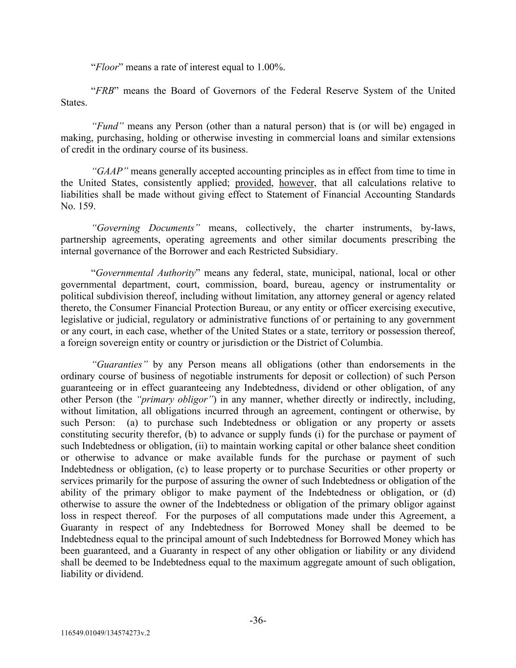 -36- 116549.01049/134574273v.2 “Floor” means a rate of interest equal to 1.00%. “FRB” means the Board of Governors of the Federal Reserve System of the United States. “Fund” means any Person (other than a natural person) that is (or will be) engaged in making, purchasing, holding or otherwise investing in commercial loans and similar extensions of credit in the ordinary course of its business. “GAAP” means generally accepted accounting principles as in effect from time to time in the United States, consistently applied; provided, however, that all calculations relative to liabilities shall be made without giving effect to Statement of Financial Accounting Standards No. 159. “Governing Documents” means, collectively, the charter instruments, by-laws, partnership agreements, operating agreements and other similar documents prescribing the internal governance of the Borrower and each Restricted Subsidiary. “Governmental Authority” means any federal, state, municipal, national, local or other governmental department, court, commission, board, bureau, agency or instrumentality or political subdivision thereof, including without limitation, any attorney general or agency related thereto, the Consumer Financial Protection Bureau, or any entity or officer exercising executive, legislative or judicial, regulatory or administrative functions of or pertaining to any government or any court, in each case, whether of the United States or a state, territory or possession thereof, a foreign sovereign entity or country or jurisdiction or the District of Columbia. “Guaranties” by any Person means all obligations (other than endorsements in the ordinary course of business of negotiable instruments for deposit or collection) of such Person guaranteeing or in effect guaranteeing any Indebtedness, dividend or other obligation, of any other Person (the “primary obligor”) in any manner, whether directly or indirectly, including, without limitation, all obligations incurred through an agreement, contingent or otherwise, by such Person: (a) to purchase such Indebtedness or obligation or any property or assets constituting security therefor, (b) to advance or supply funds (i) for the purchase or payment of such Indebtedness or obligation, (ii) to maintain working capital or other balance sheet condition or otherwise to advance or make available funds for the purchase or payment of such Indebtedness or obligation, (c) to lease property or to purchase Securities or other property or services primarily for the purpose of assuring the owner of such Indebtedness or obligation of the ability of the primary obligor to make payment of the Indebtedness or obligation, or (d) otherwise to assure the owner of the Indebtedness or obligation of the primary obligor against loss in respect thereof. For the purposes of all computations made under this Agreement, a Guaranty in respect of any Indebtedness for Borrowed Money shall be deemed to be Indebtedness equal to the principal amount of such Indebtedness for Borrowed Money which has been guaranteed, and a Guaranty in respect of any other obligation or liability or any dividend shall be deemed to be Indebtedness equal to the maximum aggregate amount of such obligation, liability or dividend.