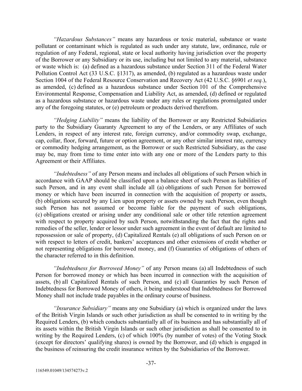 -37- 116549.01049/134574273v.2 “Hazardous Substances” means any hazardous or toxic material, substance or waste pollutant or contaminant which is regulated as such under any statute, law, ordinance, rule or regulation of any Federal, regional, state or local authority having jurisdiction over the property of the Borrower or any Subsidiary or its use, including but not limited to any material, substance or waste which is: (a) defined as a hazardous substance under Section 311 of the Federal Water Pollution Control Act (33 U.S.C. §1317), as amended, (b) regulated as a hazardous waste under Section 1004 of the Federal Resource Conservation and Recovery Act (42 U.S.C. §6901 et seq.), as amended, (c) defined as a hazardous substance under Section 101 of the Comprehensive Environmental Response, Compensation and Liability Act, as amended, (d) defined or regulated as a hazardous substance or hazardous waste under any rules or regulations promulgated under any of the foregoing statutes, or (e) petroleum or products derived therefrom. “Hedging Liability” means the liability of the Borrower or any Restricted Subsidiaries party to the Subsidiary Guaranty Agreement to any of the Lenders, or any Affiliates of such Lenders, in respect of any interest rate, foreign currency, and/or commodity swap, exchange, cap, collar, floor, forward, future or option agreement, or any other similar interest rate, currency or commodity hedging arrangement, as the Borrower or such Restricted Subsidiary, as the case may be, may from time to time enter into with any one or more of the Lenders party to this Agreement or their Affiliates. “Indebtedness” of any Person means and includes all obligations of such Person which in accordance with GAAP should be classified upon a balance sheet of such Person as liabilities of such Person, and in any event shall include all (a) obligations of such Person for borrowed money or which have been incurred in connection with the acquisition of property or assets, (b) obligations secured by any Lien upon property or assets owned by such Person, even though such Person has not assumed or become liable for the payment of such obligations, (c) obligations created or arising under any conditional sale or other title retention agreement with respect to property acquired by such Person, notwithstanding the fact that the rights and remedies of the seller, lender or lessor under such agreement in the event of default are limited to repossession or sale of property, (d) Capitalized Rentals (e) all obligations of such Person on or with respect to letters of credit, bankers’ acceptances and other extensions of credit whether or not representing obligations for borrowed money, and (f) Guaranties of obligations of others of the character referred to in this definition. “Indebtedness for Borrowed Money” of any Person means (a) all Indebtedness of such Person for borrowed money or which has been incurred in connection with the acquisition of assets, (b) all Capitalized Rentals of such Person, and (c) all Guaranties by such Person of Indebtedness for Borrowed Money of others, it being understood that Indebtedness for Borrowed Money shall not include trade payables in the ordinary course of business. “Insurance Subsidiary” means any one Subsidiary (a) which is organized under the laws of the British Virgin Islands or such other jurisdiction as shall be consented to in writing by the Required Lenders, (b) which conducts substantially all of its business and has substantially all of its assets within the British Virgin Islands or such other jurisdiction as shall be consented to in writing by the Required Lenders, (c) of which 100% (by number of votes) of the Voting Stock (except for directors’ qualifying shares) is owned by the Borrower, and (d) which is engaged in the business of reinsuring the credit insurance written by the Subsidiaries of the Borrower.
