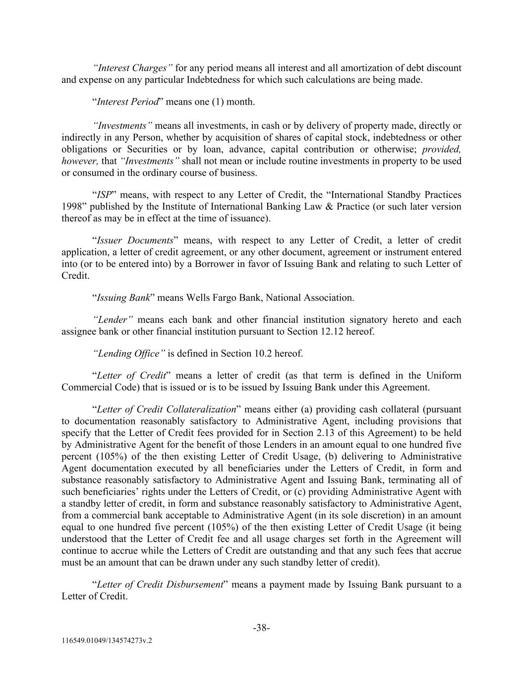 -38- 116549.01049/134574273v.2 “Interest Charges” for any period means all interest and all amortization of debt discount and expense on any particular Indebtedness for which such calculations are being made. “Interest Period” means one (1) month. “Investments” means all investments, in cash or by delivery of property made, directly or indirectly in any Person, whether by acquisition of shares of capital stock, indebtedness or other obligations or Securities or by loan, advance, capital contribution or otherwise; provided, however, that “Investments” shall not mean or include routine investments in property to be used or consumed in the ordinary course of business. “ISP” means, with respect to any Letter of Credit, the “International Standby Practices 1998” published by the Institute of International Banking Law & Practice (or such later version thereof as may be in effect at the time of issuance). “Issuer Documents” means, with respect to any Letter of Credit, a letter of credit application, a letter of credit agreement, or any other document, agreement or instrument entered into (or to be entered into) by a Borrower in favor of Issuing Bank and relating to such Letter of Credit. “Issuing Bank” means Wells Fargo Bank, National Association. “Lender” means each bank and other financial institution signatory hereto and each assignee bank or other financial institution pursuant to Section 12.12 hereof. “Lending Office” is defined in Section 10.2 hereof. “Letter of Credit” means a letter of credit (as that term is defined in the Uniform Commercial Code) that is issued or is to be issued by Issuing Bank under this Agreement. “Letter of Credit Collateralization” means either (a) providing cash collateral (pursuant to documentation reasonably satisfactory to Administrative Agent, including provisions that specify that the Letter of Credit fees provided for in Section 2.13 of this Agreement) to be held by Administrative Agent for the benefit of those Lenders in an amount equal to one hundred five percent (105%) of the then existing Letter of Credit Usage, (b) delivering to Administrative Agent documentation executed by all beneficiaries under the Letters of Credit, in form and substance reasonably satisfactory to Administrative Agent and Issuing Bank, terminating all of such beneficiaries’ rights under the Letters of Credit, or (c) providing Administrative Agent with a standby letter of credit, in form and substance reasonably satisfactory to Administrative Agent, from a commercial bank acceptable to Administrative Agent (in its sole discretion) in an amount equal to one hundred five percent (105%) of the then existing Letter of Credit Usage (it being understood that the Letter of Credit fee and all usage charges set forth in the Agreement will continue to accrue while the Letters of Credit are outstanding and that any such fees that accrue must be an amount that can be drawn under any such standby letter of credit). “Letter of Credit Disbursement” means a payment made by Issuing Bank pursuant to a Letter of Credit.