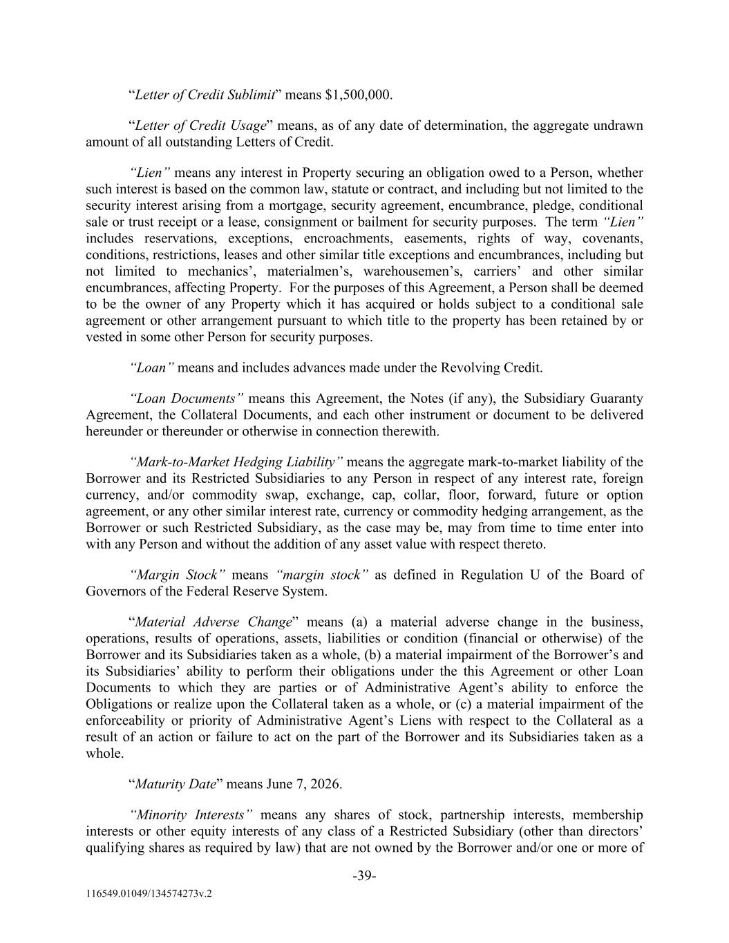 -39- 116549.01049/134574273v.2 “Letter of Credit Sublimit” means $1,500,000. “Letter of Credit Usage” means, as of any date of determination, the aggregate undrawn amount of all outstanding Letters of Credit. “Lien” means any interest in Property securing an obligation owed to a Person, whether such interest is based on the common law, statute or contract, and including but not limited to the security interest arising from a mortgage, security agreement, encumbrance, pledge, conditional sale or trust receipt or a lease, consignment or bailment for security purposes. The term “Lien” includes reservations, exceptions, encroachments, easements, rights of way, covenants, conditions, restrictions, leases and other similar title exceptions and encumbrances, including but not limited to mechanics’, materialmen’s, warehousemen’s, carriers’ and other similar encumbrances, affecting Property. For the purposes of this Agreement, a Person shall be deemed to be the owner of any Property which it has acquired or holds subject to a conditional sale agreement or other arrangement pursuant to which title to the property has been retained by or vested in some other Person for security purposes. “Loan” means and includes advances made under the Revolving Credit. “Loan Documents” means this Agreement, the Notes (if any), the Subsidiary Guaranty Agreement, the Collateral Documents, and each other instrument or document to be delivered hereunder or thereunder or otherwise in connection therewith. “Mark-to-Market Hedging Liability” means the aggregate mark-to-market liability of the Borrower and its Restricted Subsidiaries to any Person in respect of any interest rate, foreign currency, and/or commodity swap, exchange, cap, collar, floor, forward, future or option agreement, or any other similar interest rate, currency or commodity hedging arrangement, as the Borrower or such Restricted Subsidiary, as the case may be, may from time to time enter into with any Person and without the addition of any asset value with respect thereto. “Margin Stock” means “margin stock” as defined in Regulation U of the Board of Governors of the Federal Reserve System. “Material Adverse Change” means (a) a material adverse change in the business, operations, results of operations, assets, liabilities or condition (financial or otherwise) of the Borrower and its Subsidiaries taken as a whole, (b) a material impairment of the Borrower’s and its Subsidiaries’ ability to perform their obligations under the this Agreement or other Loan Documents to which they are parties or of Administrative Agent’s ability to enforce the Obligations or realize upon the Collateral taken as a whole, or (c) a material impairment of the enforceability or priority of Administrative Agent’s Liens with respect to the Collateral as a result of an action or failure to act on the part of the Borrower and its Subsidiaries taken as a whole. “Maturity Date” means June 7, 2026. “Minority Interests” means any shares of stock, partnership interests, membership interests or other equity interests of any class of a Restricted Subsidiary (other than directors’ qualifying shares as required by law) that are not owned by the Borrower and/or one or more of