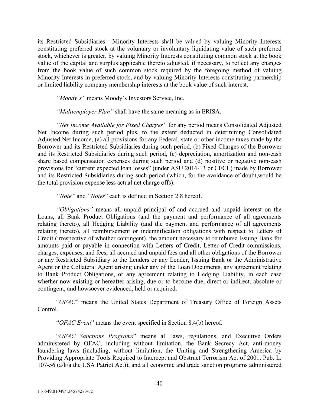 -40- 116549.01049/134574273v.2 its Restricted Subsidiaries. Minority Interests shall be valued by valuing Minority Interests constituting preferred stock at the voluntary or involuntary liquidating value of such preferred stock, whichever is greater, by valuing Minority Interests constituting common stock at the book value of the capital and surplus applicable thereto adjusted, if necessary, to reflect any changes from the book value of such common stock required by the foregoing method of valuing Minority Interests in preferred stock, and by valuing Minority Interests constituting partnership or limited liability company membership interests at the book value of such interest. “Moody’s” means Moody’s Investors Service, Inc. “Multiemployer Plan” shall have the same meaning as in ERISA. “Net Income Available for Fixed Charges” for any period means Consolidated Adjusted Net Income during such period plus, to the extent deducted in determining Consolidated Adjusted Net Income, (a) all provisions for any Federal, state or other income taxes made by the Borrower and its Restricted Subsidiaries during such period, (b) Fixed Charges of the Borrower and its Restricted Subsidiaries during such period, (c) depreciation, amortization and non-cash share based compensation expenses during such period and (d) positive or negative non-cash provisions for “current expected loan losses” (under ASU 2016-13 or CECL) made by Borrower and its Restricted Subsidiaries during such period (which, for the avoidance of doubt,would be the total provision expense less actual net charge offs). “Note” and “Notes” each is defined in Section 2.8 hereof. “Obligations” means all unpaid principal of and accrued and unpaid interest on the Loans, all Bank Product Obligations (and the payment and performance of all agreements relating thereto), all Hedging Liability (and the payment and performance of all agreements relating thereto), all reimbursement or indemnification obligations with respect to Letters of Credit (irrespective of whether contingent), the amount necessary to reimburse Issuing Bank for amounts paid or payable in connection with Letters of Credit, Letter of Credit commissions, charges, expenses, and fees, all accrued and unpaid fees and all other obligations of the Borrower or any Restricted Subsidiary to the Lenders or any Lender, Issuing Bank or the Administrative Agent or the Collateral Agent arising under any of the Loan Documents, any agreement relating to Bank Product Obligations, or any agreement relating to Hedging Liability, in each case whether now existing or hereafter arising, due or to become due, direct or indirect, absolute or contingent, and howsoever evidenced, held or acquired. “OFAC” means the United States Department of Treasury Office of Foreign Assets Control. “OFAC Event” means the event specified in Section 8.4(b) hereof. “OFAC Sanctions Programs” means all laws, regulations, and Executive Orders administered by OFAC, including without limitation, the Bank Secrecy Act, anti-money laundering laws (including, without limitation, the Uniting and Strengthening America by Providing Appropriate Tools Required to Intercept and Obstruct Terrorism Act of 2001, Pub. L. 107-56 (a/k/a the USA Patriot Act)), and all economic and trade sanction programs administered