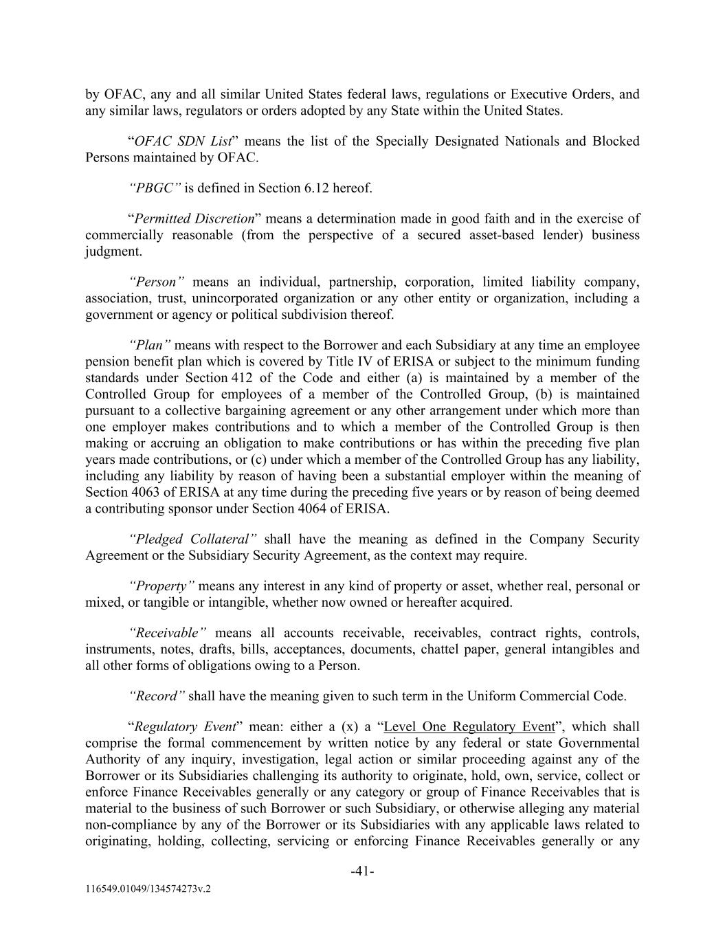 -41- 116549.01049/134574273v.2 by OFAC, any and all similar United States federal laws, regulations or Executive Orders, and any similar laws, regulators or orders adopted by any State within the United States. “OFAC SDN List” means the list of the Specially Designated Nationals and Blocked Persons maintained by OFAC. “PBGC” is defined in Section 6.12 hereof. “Permitted Discretion” means a determination made in good faith and in the exercise of commercially reasonable (from the perspective of a secured asset-based lender) business judgment. “Person” means an individual, partnership, corporation, limited liability company, association, trust, unincorporated organization or any other entity or organization, including a government or agency or political subdivision thereof. “Plan” means with respect to the Borrower and each Subsidiary at any time an employee pension benefit plan which is covered by Title IV of ERISA or subject to the minimum funding standards under Section 412 of the Code and either (a) is maintained by a member of the Controlled Group for employees of a member of the Controlled Group, (b) is maintained pursuant to a collective bargaining agreement or any other arrangement under which more than one employer makes contributions and to which a member of the Controlled Group is then making or accruing an obligation to make contributions or has within the preceding five plan years made contributions, or (c) under which a member of the Controlled Group has any liability, including any liability by reason of having been a substantial employer within the meaning of Section 4063 of ERISA at any time during the preceding five years or by reason of being deemed a contributing sponsor under Section 4064 of ERISA. “Pledged Collateral” shall have the meaning as defined in the Company Security Agreement or the Subsidiary Security Agreement, as the context may require. “Property” means any interest in any kind of property or asset, whether real, personal or mixed, or tangible or intangible, whether now owned or hereafter acquired. “Receivable” means all accounts receivable, receivables, contract rights, controls, instruments, notes, drafts, bills, acceptances, documents, chattel paper, general intangibles and all other forms of obligations owing to a Person. “Record” shall have the meaning given to such term in the Uniform Commercial Code. “Regulatory Event” mean: either a (x) a “Level One Regulatory Event”, which shall comprise the formal commencement by written notice by any federal or state Governmental Authority of any inquiry, investigation, legal action or similar proceeding against any of the Borrower or its Subsidiaries challenging its authority to originate, hold, own, service, collect or enforce Finance Receivables generally or any category or group of Finance Receivables that is material to the business of such Borrower or such Subsidiary, or otherwise alleging any material non-compliance by any of the Borrower or its Subsidiaries with any applicable laws related to originating, holding, collecting, servicing or enforcing Finance Receivables generally or any