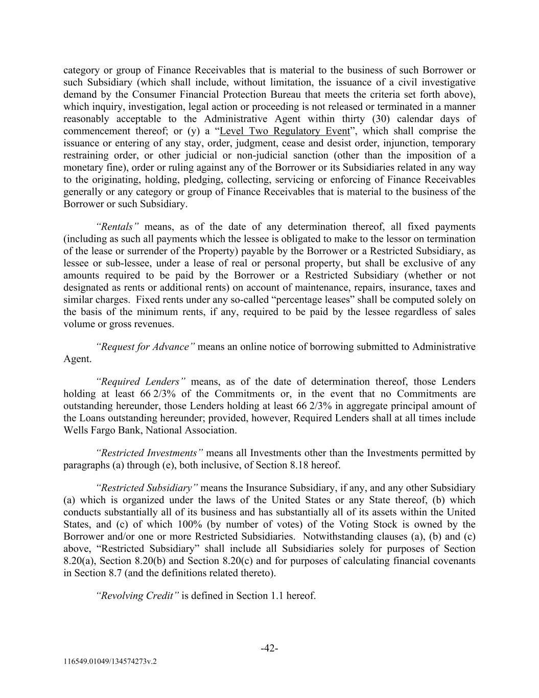 -42- 116549.01049/134574273v.2 category or group of Finance Receivables that is material to the business of such Borrower or such Subsidiary (which shall include, without limitation, the issuance of a civil investigative demand by the Consumer Financial Protection Bureau that meets the criteria set forth above), which inquiry, investigation, legal action or proceeding is not released or terminated in a manner reasonably acceptable to the Administrative Agent within thirty (30) calendar days of commencement thereof; or (y) a “Level Two Regulatory Event”, which shall comprise the issuance or entering of any stay, order, judgment, cease and desist order, injunction, temporary restraining order, or other judicial or non-judicial sanction (other than the imposition of a monetary fine), order or ruling against any of the Borrower or its Subsidiaries related in any way to the originating, holding, pledging, collecting, servicing or enforcing of Finance Receivables generally or any category or group of Finance Receivables that is material to the business of the Borrower or such Subsidiary. “Rentals” means, as of the date of any determination thereof, all fixed payments (including as such all payments which the lessee is obligated to make to the lessor on termination of the lease or surrender of the Property) payable by the Borrower or a Restricted Subsidiary, as lessee or sub-lessee, under a lease of real or personal property, but shall be exclusive of any amounts required to be paid by the Borrower or a Restricted Subsidiary (whether or not designated as rents or additional rents) on account of maintenance, repairs, insurance, taxes and similar charges. Fixed rents under any so-called “percentage leases” shall be computed solely on the basis of the minimum rents, if any, required to be paid by the lessee regardless of sales volume or gross revenues. “Request for Advance” means an online notice of borrowing submitted to Administrative Agent. “Required Lenders” means, as of the date of determination thereof, those Lenders holding at least 66 2/3% of the Commitments or, in the event that no Commitments are outstanding hereunder, those Lenders holding at least 66 2/3% in aggregate principal amount of the Loans outstanding hereunder; provided, however, Required Lenders shall at all times include Wells Fargo Bank, National Association. “Restricted Investments” means all Investments other than the Investments permitted by paragraphs (a) through (e), both inclusive, of Section 8.18 hereof. “Restricted Subsidiary” means the Insurance Subsidiary, if any, and any other Subsidiary (a) which is organized under the laws of the United States or any State thereof, (b) which conducts substantially all of its business and has substantially all of its assets within the United States, and (c) of which 100% (by number of votes) of the Voting Stock is owned by the Borrower and/or one or more Restricted Subsidiaries. Notwithstanding clauses (a), (b) and (c) above, “Restricted Subsidiary” shall include all Subsidiaries solely for purposes of Section 8.20(a), Section 8.20(b) and Section 8.20(c) and for purposes of calculating financial covenants in Section 8.7 (and the definitions related thereto). “Revolving Credit” is defined in Section 1.1 hereof.