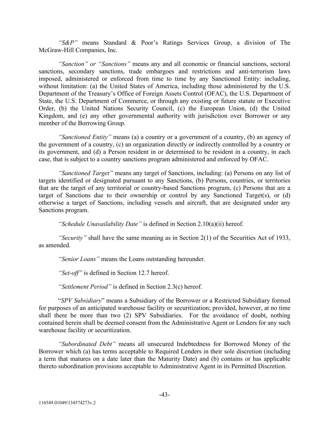 -43- 116549.01049/134574273v.2 “S&P” means Standard & Poor’s Ratings Services Group, a division of The McGraw-Hill Companies, Inc. “Sanction” or “Sanctions” means any and all economic or financial sanctions, sectoral sanctions, secondary sanctions, trade embargoes and restrictions and anti-terrorism laws imposed, administered or enforced from time to time by any Sanctioned Entity: including, without limitation: (a) the United States of America, including those administered by the U.S. Department of the Treasury’s Office of Foreign Assets Control (OFAC), the U.S. Department of State, the U.S. Department of Commerce, or through any existing or future statute or Executive Order, (b) the United Nations Security Council, (c) the European Union, (d) the United Kingdom, and (e) any other governmental authority with jurisdiction over Borrower or any member of the Borrowing Group. “Sanctioned Entity” means (a) a country or a government of a country, (b) an agency of the government of a country, (c) an organization directly or indirectly controlled by a country or its government, and (d) a Person resident in or determined to be resident in a country, in each case, that is subject to a country sanctions program administered and enforced by OFAC. “Sanctioned Target” means any target of Sanctions, including: (a) Persons on any list of targets identified or designated pursuant to any Sanctions, (b) Persons, countries, or territories that are the target of any territorial or country-based Sanctions program, (c) Persons that are a target of Sanctions due to their ownership or control by any Sanctioned Target(s), or (d) otherwise a target of Sanctions, including vessels and aircraft, that are designated under any Sanctions program. “Schedule Unavailability Date” is defined in Section 2.10(a)(ii) hereof. “Security” shall have the same meaning as in Section 2(1) of the Securities Act of 1933, as amended. “Senior Loans” means the Loans outstanding hereunder. “Set-off” is defined in Section 12.7 hereof. “Settlement Period” is defined in Section 2.3(c) hereof. “SPV Subsidiary” means a Subsidiary of the Borrower or a Restricted Subsidiary formed for purposes of an anticipated warehouse facility or securitization; provided, however, at no time shall there be more than two (2) SPV Subsidiaries. For the avoidance of doubt, nothing contained herein shall be deemed consent from the Administrative Agent or Lenders for any such warehouse facility or securitization. “Subordinated Debt” means all unsecured Indebtedness for Borrowed Money of the Borrower which (a) has terms acceptable to Required Lenders in their sole discretion (including a term that matures on a date later than the Maturity Date) and (b) contains or has applicable thereto subordination provisions acceptable to Administrative Agent in its Permitted Discretion.
