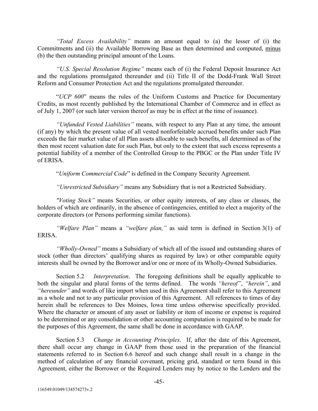 -45- 116549.01049/134574273v.2 “Total Excess Availability” means an amount equal to (a) the lesser of (i) the Commitments and (ii) the Available Borrowing Base as then determined and computed, minus (b) the then outstanding principal amount of the Loans. “U.S. Special Resolution Regime” means each of (i) the Federal Deposit Insurance Act and the regulations promulgated thereunder and (ii) Title II of the Dodd-Frank Wall Street Reform and Consumer Protection Act and the regulations promulgated thereunder. “UCP 600” means the rules of the Uniform Customs and Practice for Documentary Credits, as most recently published by the International Chamber of Commerce and in effect as of July 1, 2007 (or such later version thereof as may be in effect at the time of issuance). “Unfunded Vested Liabilities” means, with respect to any Plan at any time, the amount (if any) by which the present value of all vested nonforfeitable accrued benefits under such Plan exceeds the fair market value of all Plan assets allocable to such benefits, all determined as of the then most recent valuation date for such Plan, but only to the extent that such excess represents a potential liability of a member of the Controlled Group to the PBGC or the Plan under Title IV of ERISA. “Uniform Commercial Code” is defined in the Company Security Agreement. “Unrestricted Subsidiary” means any Subsidiary that is not a Restricted Subsidiary. "Voting Stock” means Securities, or other equity interests, of any class or classes, the holders of which are ordinarily, in the absence of contingencies, entitled to elect a majority of the corporate directors (or Persons performing similar functions). “Welfare Plan” means a “welfare plan,” as said term is defined in Section 3(1) of ERISA. “Wholly-Owned” means a Subsidiary of which all of the issued and outstanding shares of stock (other than directors’ qualifying shares as required by law) or other comparable equity interests shall be owned by the Borrower and/or one or more of its Wholly-Owned Subsidiaries. Section 5.2 Interpretation. The foregoing definitions shall be equally applicable to both the singular and plural forms of the terms defined. The words “hereof”, “herein”, and “hereunder” and words of like import when used in this Agreement shall refer to this Agreement as a whole and not to any particular provision of this Agreement. All references to times of day herein shall be references to Des Moines, Iowa time unless otherwise specifically provided. Where the character or amount of any asset or liability or item of income or expense is required to be determined or any consolidation or other accounting computation is required to be made for the purposes of this Agreement, the same shall be done in accordance with GAAP. Section 5.3 Change in Accounting Principles. If, after the date of this Agreement, there shall occur any change in GAAP from those used in the preparation of the financial statements referred to in Section 6.6 hereof and such change shall result in a change in the method of calculation of any financial covenant, pricing grid, standard or term found in this Agreement, either the Borrower or the Required Lenders may by notice to the Lenders and the
