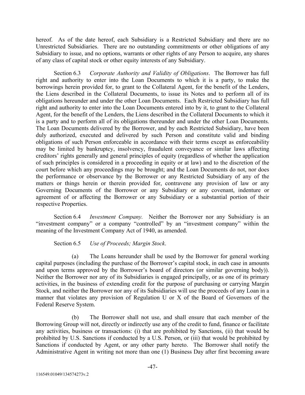 -47- 116549.01049/134574273v.2 hereof. As of the date hereof, each Subsidiary is a Restricted Subsidiary and there are no Unrestricted Subsidiaries. There are no outstanding commitments or other obligations of any Subsidiary to issue, and no options, warrants or other rights of any Person to acquire, any shares of any class of capital stock or other equity interests of any Subsidiary. Section 6.3 Corporate Authority and Validity of Obligations. The Borrower has full right and authority to enter into the Loan Documents to which it is a party, to make the borrowings herein provided for, to grant to the Collateral Agent, for the benefit of the Lenders, the Liens described in the Collateral Documents, to issue its Notes and to perform all of its obligations hereunder and under the other Loan Documents. Each Restricted Subsidiary has full right and authority to enter into the Loan Documents entered into by it, to grant to the Collateral Agent, for the benefit of the Lenders, the Liens described in the Collateral Documents to which it is a party and to perform all of its obligations thereunder and under the other Loan Documents. The Loan Documents delivered by the Borrower, and by each Restricted Subsidiary, have been duly authorized, executed and delivered by such Person and constitute valid and binding obligations of such Person enforceable in accordance with their terms except as enforceability may be limited by bankruptcy, insolvency, fraudulent conveyance or similar laws affecting creditors’ rights generally and general principles of equity (regardless of whether the application of such principles is considered in a proceeding in equity or at law) and to the discretion of the court before which any proceedings may be brought; and the Loan Documents do not, nor does the performance or observance by the Borrower or any Restricted Subsidiary of any of the matters or things herein or therein provided for, contravene any provision of law or any Governing Documents of the Borrower or any Subsidiary or any covenant, indenture or agreement of or affecting the Borrower or any Subsidiary or a substantial portion of their respective Properties. Section 6.4 Investment Company. Neither the Borrower nor any Subsidiary is an “investment company” or a company “controlled” by an “investment company” within the meaning of the Investment Company Act of 1940, as amended. Section 6.5 Use of Proceeds; Margin Stock. (a) The Loans hereunder shall be used by the Borrower for general working capital purposes (including the purchase of the Borrower’s capital stock, in each case in amounts and upon terms approved by the Borrower’s board of directors (or similar governing body)). Neither the Borrower nor any of its Subsidiaries is engaged principally, or as one of its primary activities, in the business of extending credit for the purpose of purchasing or carrying Margin Stock, and neither the Borrower nor any of its Subsidiaries will use the proceeds of any Loan in a manner that violates any provision of Regulation U or X of the Board of Governors of the Federal Reserve System. (b) The Borrower shall not use, and shall ensure that each member of the Borrowing Group will not, directly or indirectly use any of the credit to fund, finance or facilitate any activities, business or transactions: (i) that are prohibited by Sanctions, (ii) that would be prohibited by U.S. Sanctions if conducted by a U.S. Person, or (iii) that would be prohibited by Sanctions if conducted by Agent, or any other party hereto. The Borrower shall notify the Administrative Agent in writing not more than one (1) Business Day after first becoming aware