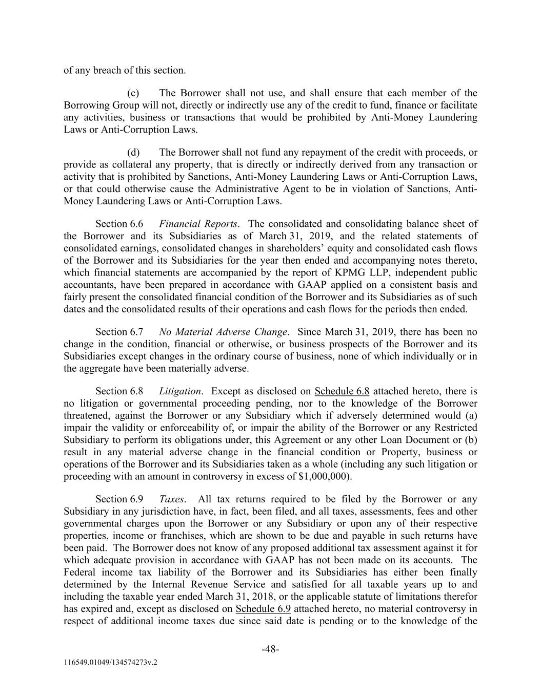 -48- 116549.01049/134574273v.2 of any breach of this section. (c) The Borrower shall not use, and shall ensure that each member of the Borrowing Group will not, directly or indirectly use any of the credit to fund, finance or facilitate any activities, business or transactions that would be prohibited by Anti-Money Laundering Laws or Anti-Corruption Laws. (d) The Borrower shall not fund any repayment of the credit with proceeds, or provide as collateral any property, that is directly or indirectly derived from any transaction or activity that is prohibited by Sanctions, Anti-Money Laundering Laws or Anti-Corruption Laws, or that could otherwise cause the Administrative Agent to be in violation of Sanctions, Anti- Money Laundering Laws or Anti-Corruption Laws. Section 6.6 Financial Reports. The consolidated and consolidating balance sheet of the Borrower and its Subsidiaries as of March 31, 2019, and the related statements of consolidated earnings, consolidated changes in shareholders’ equity and consolidated cash flows of the Borrower and its Subsidiaries for the year then ended and accompanying notes thereto, which financial statements are accompanied by the report of KPMG LLP, independent public accountants, have been prepared in accordance with GAAP applied on a consistent basis and fairly present the consolidated financial condition of the Borrower and its Subsidiaries as of such dates and the consolidated results of their operations and cash flows for the periods then ended. Section 6.7 No Material Adverse Change. Since March 31, 2019, there has been no change in the condition, financial or otherwise, or business prospects of the Borrower and its Subsidiaries except changes in the ordinary course of business, none of which individually or in the aggregate have been materially adverse. Section 6.8 Litigation. Except as disclosed on Schedule 6.8 attached hereto, there is no litigation or governmental proceeding pending, nor to the knowledge of the Borrower threatened, against the Borrower or any Subsidiary which if adversely determined would (a) impair the validity or enforceability of, or impair the ability of the Borrower or any Restricted Subsidiary to perform its obligations under, this Agreement or any other Loan Document or (b) result in any material adverse change in the financial condition or Property, business or operations of the Borrower and its Subsidiaries taken as a whole (including any such litigation or proceeding with an amount in controversy in excess of $1,000,000). Section 6.9 Taxes. All tax returns required to be filed by the Borrower or any Subsidiary in any jurisdiction have, in fact, been filed, and all taxes, assessments, fees and other governmental charges upon the Borrower or any Subsidiary or upon any of their respective properties, income or franchises, which are shown to be due and payable in such returns have been paid. The Borrower does not know of any proposed additional tax assessment against it for which adequate provision in accordance with GAAP has not been made on its accounts. The Federal income tax liability of the Borrower and its Subsidiaries has either been finally determined by the Internal Revenue Service and satisfied for all taxable years up to and including the taxable year ended March 31, 2018, or the applicable statute of limitations therefor has expired and, except as disclosed on Schedule 6.9 attached hereto, no material controversy in respect of additional income taxes due since said date is pending or to the knowledge of the