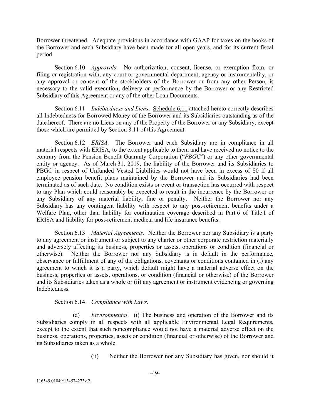 -49- 116549.01049/134574273v.2 Borrower threatened. Adequate provisions in accordance with GAAP for taxes on the books of the Borrower and each Subsidiary have been made for all open years, and for its current fiscal period. Section 6.10 Approvals. No authorization, consent, license, or exemption from, or filing or registration with, any court or governmental department, agency or instrumentality, or any approval or consent of the stockholders of the Borrower or from any other Person, is necessary to the valid execution, delivery or performance by the Borrower or any Restricted Subsidiary of this Agreement or any of the other Loan Documents. Section 6.11 Indebtedness and Liens. Schedule 6.11 attached hereto correctly describes all Indebtedness for Borrowed Money of the Borrower and its Subsidiaries outstanding as of the date hereof. There are no Liens on any of the Property of the Borrower or any Subsidiary, except those which are permitted by Section 8.11 of this Agreement. Section 6.12 ERISA. The Borrower and each Subsidiary are in compliance in all material respects with ERISA, to the extent applicable to them and have received no notice to the contrary from the Pension Benefit Guaranty Corporation (“PBGC”) or any other governmental entity or agency. As of March 31, 2019, the liability of the Borrower and its Subsidiaries to PBGC in respect of Unfunded Vested Liabilities would not have been in excess of $0 if all employee pension benefit plans maintained by the Borrower and its Subsidiaries had been terminated as of such date. No condition exists or event or transaction has occurred with respect to any Plan which could reasonably be expected to result in the incurrence by the Borrower or any Subsidiary of any material liability, fine or penalty. Neither the Borrower nor any Subsidiary has any contingent liability with respect to any post-retirement benefits under a Welfare Plan, other than liability for continuation coverage described in Part 6 of Title I of ERISA and liability for post-retirement medical and life insurance benefits. Section 6.13 Material Agreements. Neither the Borrower nor any Subsidiary is a party to any agreement or instrument or subject to any charter or other corporate restriction materially and adversely affecting its business, properties or assets, operations or condition (financial or otherwise). Neither the Borrower nor any Subsidiary is in default in the performance, observance or fulfillment of any of the obligations, covenants or conditions contained in (i) any agreement to which it is a party, which default might have a material adverse effect on the business, properties or assets, operations, or condition (financial or otherwise) of the Borrower and its Subsidiaries taken as a whole or (ii) any agreement or instrument evidencing or governing Indebtedness. Section 6.14 Compliance with Laws. (a) Environmental. (i) The business and operation of the Borrower and its Subsidiaries comply in all respects with all applicable Environmental Legal Requirements, except to the extent that such noncompliance would not have a material adverse effect on the business, operations, properties, assets or condition (financial or otherwise) of the Borrower and its Subsidiaries taken as a whole. (ii) Neither the Borrower nor any Subsidiary has given, nor should it