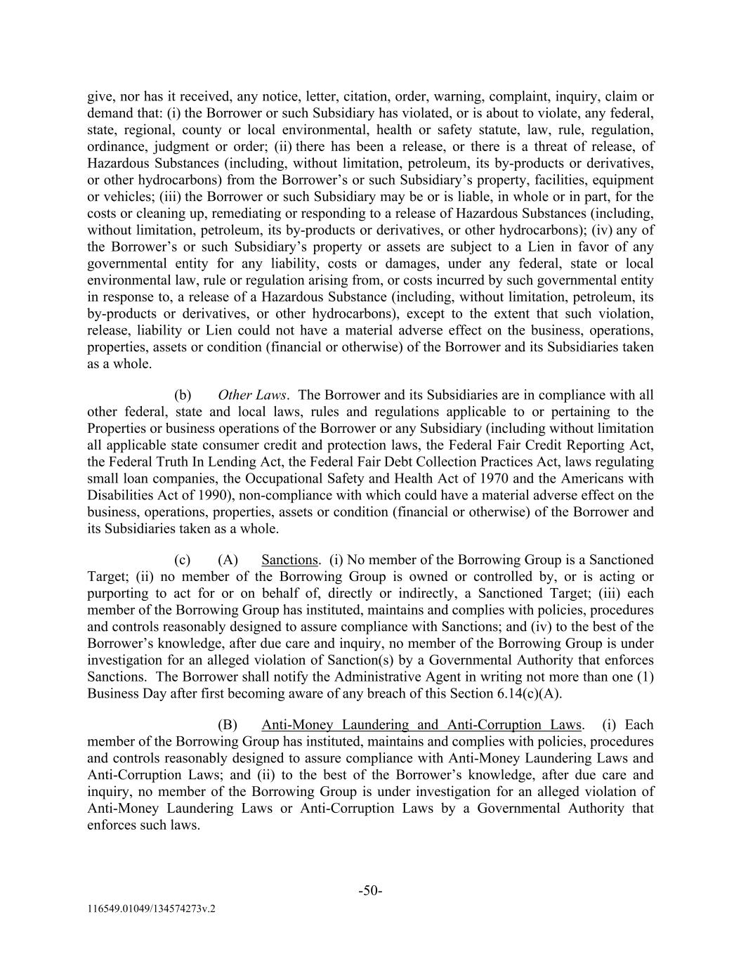 -50- 116549.01049/134574273v.2 give, nor has it received, any notice, letter, citation, order, warning, complaint, inquiry, claim or demand that: (i) the Borrower or such Subsidiary has violated, or is about to violate, any federal, state, regional, county or local environmental, health or safety statute, law, rule, regulation, ordinance, judgment or order; (ii) there has been a release, or there is a threat of release, of Hazardous Substances (including, without limitation, petroleum, its by-products or derivatives, or other hydrocarbons) from the Borrower’s or such Subsidiary’s property, facilities, equipment or vehicles; (iii) the Borrower or such Subsidiary may be or is liable, in whole or in part, for the costs or cleaning up, remediating or responding to a release of Hazardous Substances (including, without limitation, petroleum, its by-products or derivatives, or other hydrocarbons); (iv) any of the Borrower’s or such Subsidiary’s property or assets are subject to a Lien in favor of any governmental entity for any liability, costs or damages, under any federal, state or local environmental law, rule or regulation arising from, or costs incurred by such governmental entity in response to, a release of a Hazardous Substance (including, without limitation, petroleum, its by-products or derivatives, or other hydrocarbons), except to the extent that such violation, release, liability or Lien could not have a material adverse effect on the business, operations, properties, assets or condition (financial or otherwise) of the Borrower and its Subsidiaries taken as a whole. (b) Other Laws. The Borrower and its Subsidiaries are in compliance with all other federal, state and local laws, rules and regulations applicable to or pertaining to the Properties or business operations of the Borrower or any Subsidiary (including without limitation all applicable state consumer credit and protection laws, the Federal Fair Credit Reporting Act, the Federal Truth In Lending Act, the Federal Fair Debt Collection Practices Act, laws regulating small loan companies, the Occupational Safety and Health Act of 1970 and the Americans with Disabilities Act of 1990), non-compliance with which could have a material adverse effect on the business, operations, properties, assets or condition (financial or otherwise) of the Borrower and its Subsidiaries taken as a whole. (c) (A) Sanctions. (i) No member of the Borrowing Group is a Sanctioned Target; (ii) no member of the Borrowing Group is owned or controlled by, or is acting or purporting to act for or on behalf of, directly or indirectly, a Sanctioned Target; (iii) each member of the Borrowing Group has instituted, maintains and complies with policies, procedures and controls reasonably designed to assure compliance with Sanctions; and (iv) to the best of the Borrower’s knowledge, after due care and inquiry, no member of the Borrowing Group is under investigation for an alleged violation of Sanction(s) by a Governmental Authority that enforces Sanctions. The Borrower shall notify the Administrative Agent in writing not more than one (1) Business Day after first becoming aware of any breach of this Section 6.14(c)(A). (B) Anti-Money Laundering and Anti-Corruption Laws. (i) Each member of the Borrowing Group has instituted, maintains and complies with policies, procedures and controls reasonably designed to assure compliance with Anti-Money Laundering Laws and Anti-Corruption Laws; and (ii) to the best of the Borrower’s knowledge, after due care and inquiry, no member of the Borrowing Group is under investigation for an alleged violation of Anti-Money Laundering Laws or Anti-Corruption Laws by a Governmental Authority that enforces such laws.