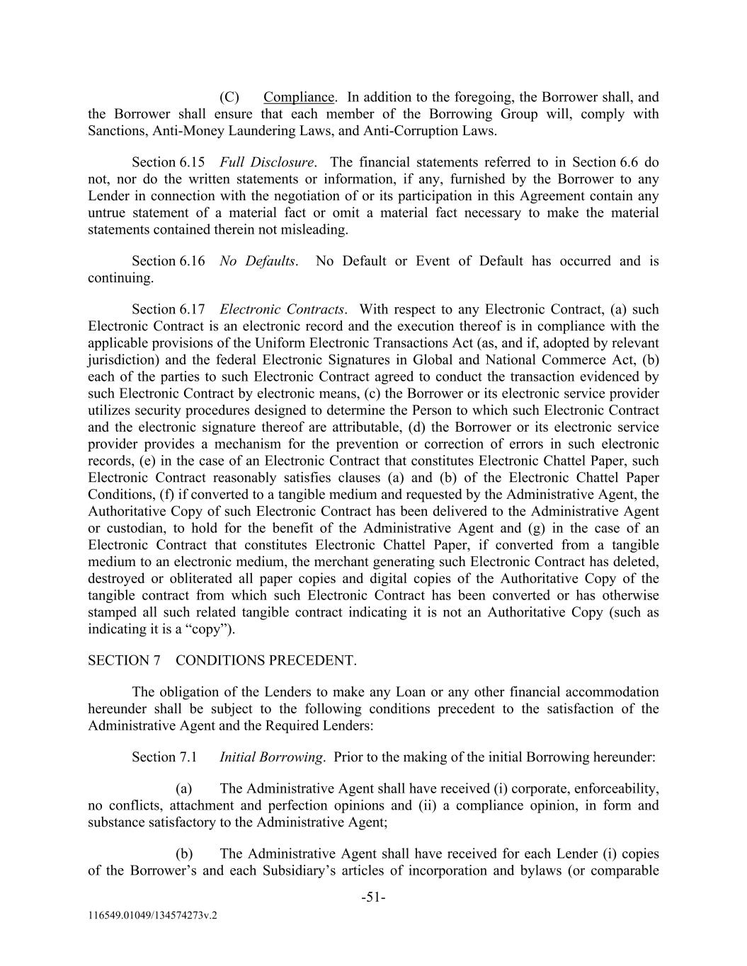 -51- 116549.01049/134574273v.2 (C) Compliance. In addition to the foregoing, the Borrower shall, and the Borrower shall ensure that each member of the Borrowing Group will, comply with Sanctions, Anti-Money Laundering Laws, and Anti-Corruption Laws. Section 6.15 Full Disclosure. The financial statements referred to in Section 6.6 do not, nor do the written statements or information, if any, furnished by the Borrower to any Lender in connection with the negotiation of or its participation in this Agreement contain any untrue statement of a material fact or omit a material fact necessary to make the material statements contained therein not misleading. Section 6.16 No Defaults. No Default or Event of Default has occurred and is continuing. Section 6.17 Electronic Contracts. With respect to any Electronic Contract, (a) such Electronic Contract is an electronic record and the execution thereof is in compliance with the applicable provisions of the Uniform Electronic Transactions Act (as, and if, adopted by relevant jurisdiction) and the federal Electronic Signatures in Global and National Commerce Act, (b) each of the parties to such Electronic Contract agreed to conduct the transaction evidenced by such Electronic Contract by electronic means, (c) the Borrower or its electronic service provider utilizes security procedures designed to determine the Person to which such Electronic Contract and the electronic signature thereof are attributable, (d) the Borrower or its electronic service provider provides a mechanism for the prevention or correction of errors in such electronic records, (e) in the case of an Electronic Contract that constitutes Electronic Chattel Paper, such Electronic Contract reasonably satisfies clauses (a) and (b) of the Electronic Chattel Paper Conditions, (f) if converted to a tangible medium and requested by the Administrative Agent, the Authoritative Copy of such Electronic Contract has been delivered to the Administrative Agent or custodian, to hold for the benefit of the Administrative Agent and (g) in the case of an Electronic Contract that constitutes Electronic Chattel Paper, if converted from a tangible medium to an electronic medium, the merchant generating such Electronic Contract has deleted, destroyed or obliterated all paper copies and digital copies of the Authoritative Copy of the tangible contract from which such Electronic Contract has been converted or has otherwise stamped all such related tangible contract indicating it is not an Authoritative Copy (such as indicating it is a “copy”). SECTION 7 CONDITIONS PRECEDENT. The obligation of the Lenders to make any Loan or any other financial accommodation hereunder shall be subject to the following conditions precedent to the satisfaction of the Administrative Agent and the Required Lenders: Section 7.1 Initial Borrowing. Prior to the making of the initial Borrowing hereunder: (a) The Administrative Agent shall have received (i) corporate, enforceability, no conflicts, attachment and perfection opinions and (ii) a compliance opinion, in form and substance satisfactory to the Administrative Agent; (b) The Administrative Agent shall have received for each Lender (i) copies of the Borrower’s and each Subsidiary’s articles of incorporation and bylaws (or comparable
