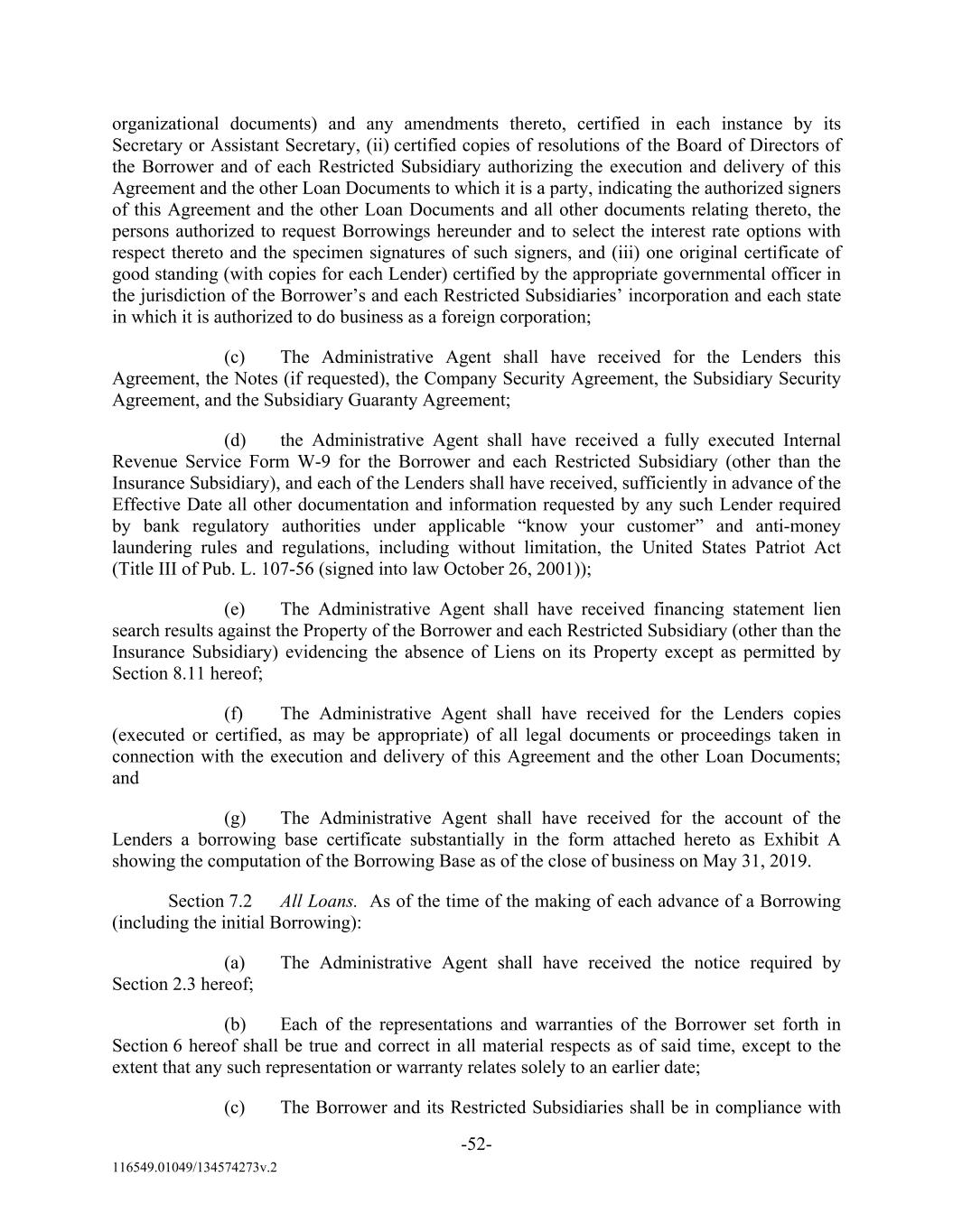 -52- 116549.01049/134574273v.2 organizational documents) and any amendments thereto, certified in each instance by its Secretary or Assistant Secretary, (ii) certified copies of resolutions of the Board of Directors of the Borrower and of each Restricted Subsidiary authorizing the execution and delivery of this Agreement and the other Loan Documents to which it is a party, indicating the authorized signers of this Agreement and the other Loan Documents and all other documents relating thereto, the persons authorized to request Borrowings hereunder and to select the interest rate options with respect thereto and the specimen signatures of such signers, and (iii) one original certificate of good standing (with copies for each Lender) certified by the appropriate governmental officer in the jurisdiction of the Borrower’s and each Restricted Subsidiaries’ incorporation and each state in which it is authorized to do business as a foreign corporation; (c) The Administrative Agent shall have received for the Lenders this Agreement, the Notes (if requested), the Company Security Agreement, the Subsidiary Security Agreement, and the Subsidiary Guaranty Agreement; (d) the Administrative Agent shall have received a fully executed Internal Revenue Service Form W-9 for the Borrower and each Restricted Subsidiary (other than the Insurance Subsidiary), and each of the Lenders shall have received, sufficiently in advance of the Effective Date all other documentation and information requested by any such Lender required by bank regulatory authorities under applicable “know your customer” and anti-money laundering rules and regulations, including without limitation, the United States Patriot Act (Title III of Pub. L. 107-56 (signed into law October 26, 2001)); (e) The Administrative Agent shall have received financing statement lien search results against the Property of the Borrower and each Restricted Subsidiary (other than the Insurance Subsidiary) evidencing the absence of Liens on its Property except as permitted by Section 8.11 hereof; (f) The Administrative Agent shall have received for the Lenders copies (executed or certified, as may be appropriate) of all legal documents or proceedings taken in connection with the execution and delivery of this Agreement and the other Loan Documents; and (g) The Administrative Agent shall have received for the account of the Lenders a borrowing base certificate substantially in the form attached hereto as Exhibit A showing the computation of the Borrowing Base as of the close of business on May 31, 2019. Section 7.2 All Loans. As of the time of the making of each advance of a Borrowing (including the initial Borrowing): (a) The Administrative Agent shall have received the notice required by Section 2.3 hereof; (b) Each of the representations and warranties of the Borrower set forth in Section 6 hereof shall be true and correct in all material respects as of said time, except to the extent that any such representation or warranty relates solely to an earlier date; (c) The Borrower and its Restricted Subsidiaries shall be in compliance with