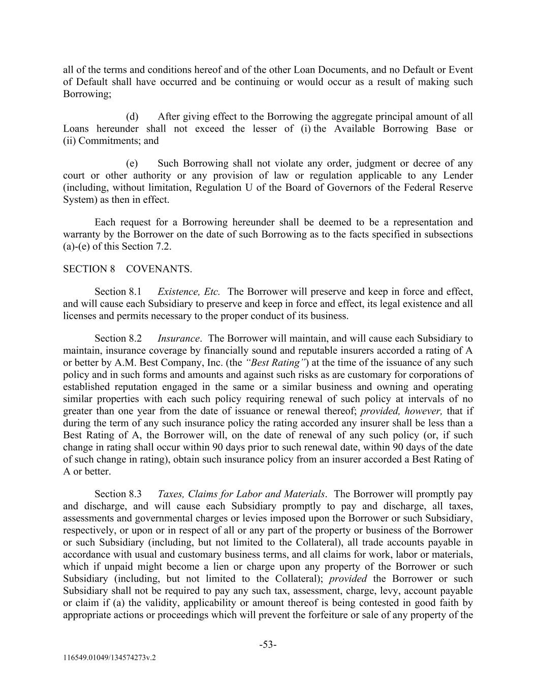 -53- 116549.01049/134574273v.2 all of the terms and conditions hereof and of the other Loan Documents, and no Default or Event of Default shall have occurred and be continuing or would occur as a result of making such Borrowing; (d) After giving effect to the Borrowing the aggregate principal amount of all Loans hereunder shall not exceed the lesser of (i) the Available Borrowing Base or (ii) Commitments; and (e) Such Borrowing shall not violate any order, judgment or decree of any court or other authority or any provision of law or regulation applicable to any Lender (including, without limitation, Regulation U of the Board of Governors of the Federal Reserve System) as then in effect. Each request for a Borrowing hereunder shall be deemed to be a representation and warranty by the Borrower on the date of such Borrowing as to the facts specified in subsections (a)-(e) of this Section 7.2. SECTION 8 COVENANTS. Section 8.1 Existence, Etc. The Borrower will preserve and keep in force and effect, and will cause each Subsidiary to preserve and keep in force and effect, its legal existence and all licenses and permits necessary to the proper conduct of its business. Section 8.2 Insurance. The Borrower will maintain, and will cause each Subsidiary to maintain, insurance coverage by financially sound and reputable insurers accorded a rating of A or better by A.M. Best Company, Inc. (the “Best Rating”) at the time of the issuance of any such policy and in such forms and amounts and against such risks as are customary for corporations of established reputation engaged in the same or a similar business and owning and operating similar properties with each such policy requiring renewal of such policy at intervals of no greater than one year from the date of issuance or renewal thereof; provided, however, that if during the term of any such insurance policy the rating accorded any insurer shall be less than a Best Rating of A, the Borrower will, on the date of renewal of any such policy (or, if such change in rating shall occur within 90 days prior to such renewal date, within 90 days of the date of such change in rating), obtain such insurance policy from an insurer accorded a Best Rating of A or better. Section 8.3 Taxes, Claims for Labor and Materials. The Borrower will promptly pay and discharge, and will cause each Subsidiary promptly to pay and discharge, all taxes, assessments and governmental charges or levies imposed upon the Borrower or such Subsidiary, respectively, or upon or in respect of all or any part of the property or business of the Borrower or such Subsidiary (including, but not limited to the Collateral), all trade accounts payable in accordance with usual and customary business terms, and all claims for work, labor or materials, which if unpaid might become a lien or charge upon any property of the Borrower or such Subsidiary (including, but not limited to the Collateral); provided the Borrower or such Subsidiary shall not be required to pay any such tax, assessment, charge, levy, account payable or claim if (a) the validity, applicability or amount thereof is being contested in good faith by appropriate actions or proceedings which will prevent the forfeiture or sale of any property of the