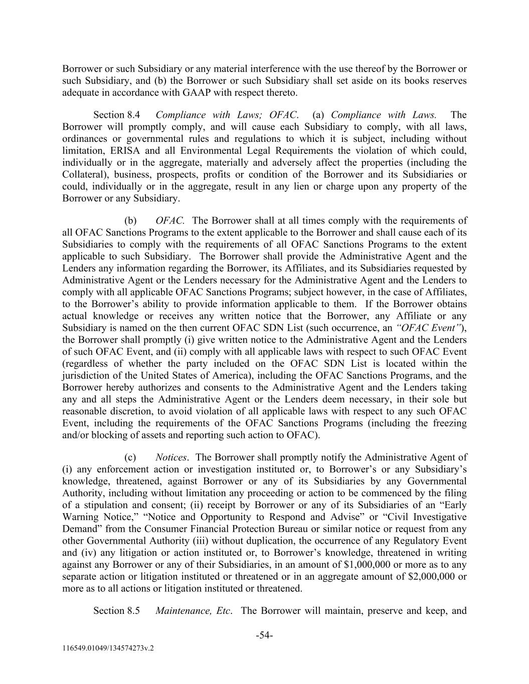 -54- 116549.01049/134574273v.2 Borrower or such Subsidiary or any material interference with the use thereof by the Borrower or such Subsidiary, and (b) the Borrower or such Subsidiary shall set aside on its books reserves adequate in accordance with GAAP with respect thereto. Section 8.4 Compliance with Laws; OFAC. (a) Compliance with Laws. The Borrower will promptly comply, and will cause each Subsidiary to comply, with all laws, ordinances or governmental rules and regulations to which it is subject, including without limitation, ERISA and all Environmental Legal Requirements the violation of which could, individually or in the aggregate, materially and adversely affect the properties (including the Collateral), business, prospects, profits or condition of the Borrower and its Subsidiaries or could, individually or in the aggregate, result in any lien or charge upon any property of the Borrower or any Subsidiary. (b) OFAC. The Borrower shall at all times comply with the requirements of all OFAC Sanctions Programs to the extent applicable to the Borrower and shall cause each of its Subsidiaries to comply with the requirements of all OFAC Sanctions Programs to the extent applicable to such Subsidiary. The Borrower shall provide the Administrative Agent and the Lenders any information regarding the Borrower, its Affiliates, and its Subsidiaries requested by Administrative Agent or the Lenders necessary for the Administrative Agent and the Lenders to comply with all applicable OFAC Sanctions Programs; subject however, in the case of Affiliates, to the Borrower’s ability to provide information applicable to them. If the Borrower obtains actual knowledge or receives any written notice that the Borrower, any Affiliate or any Subsidiary is named on the then current OFAC SDN List (such occurrence, an “OFAC Event”), the Borrower shall promptly (i) give written notice to the Administrative Agent and the Lenders of such OFAC Event, and (ii) comply with all applicable laws with respect to such OFAC Event (regardless of whether the party included on the OFAC SDN List is located within the jurisdiction of the United States of America), including the OFAC Sanctions Programs, and the Borrower hereby authorizes and consents to the Administrative Agent and the Lenders taking any and all steps the Administrative Agent or the Lenders deem necessary, in their sole but reasonable discretion, to avoid violation of all applicable laws with respect to any such OFAC Event, including the requirements of the OFAC Sanctions Programs (including the freezing and/or blocking of assets and reporting such action to OFAC). (c) Notices. The Borrower shall promptly notify the Administrative Agent of (i) any enforcement action or investigation instituted or, to Borrower’s or any Subsidiary’s knowledge, threatened, against Borrower or any of its Subsidiaries by any Governmental Authority, including without limitation any proceeding or action to be commenced by the filing of a stipulation and consent; (ii) receipt by Borrower or any of its Subsidiaries of an “Early Warning Notice,” “Notice and Opportunity to Respond and Advise” or “Civil Investigative Demand” from the Consumer Financial Protection Bureau or similar notice or request from any other Governmental Authority (iii) without duplication, the occurrence of any Regulatory Event and (iv) any litigation or action instituted or, to Borrower’s knowledge, threatened in writing against any Borrower or any of their Subsidiaries, in an amount of $1,000,000 or more as to any separate action or litigation instituted or threatened or in an aggregate amount of $2,000,000 or more as to all actions or litigation instituted or threatened. Section 8.5 Maintenance, Etc. The Borrower will maintain, preserve and keep, and