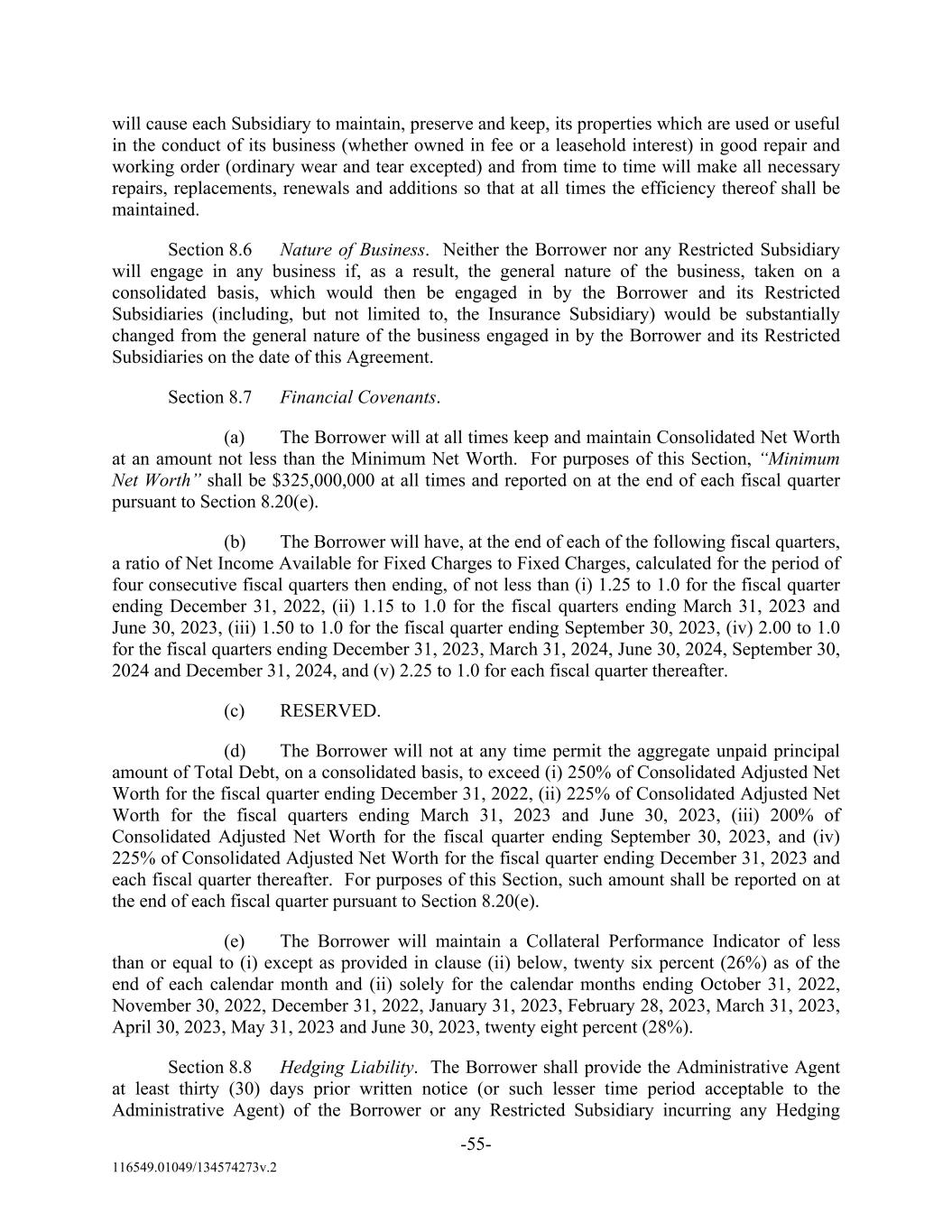 -55- 116549.01049/134574273v.2 will cause each Subsidiary to maintain, preserve and keep, its properties which are used or useful in the conduct of its business (whether owned in fee or a leasehold interest) in good repair and working order (ordinary wear and tear excepted) and from time to time will make all necessary repairs, replacements, renewals and additions so that at all times the efficiency thereof shall be maintained. Section 8.6 Nature of Business. Neither the Borrower nor any Restricted Subsidiary will engage in any business if, as a result, the general nature of the business, taken on a consolidated basis, which would then be engaged in by the Borrower and its Restricted Subsidiaries (including, but not limited to, the Insurance Subsidiary) would be substantially changed from the general nature of the business engaged in by the Borrower and its Restricted Subsidiaries on the date of this Agreement. Section 8.7 Financial Covenants. (a) The Borrower will at all times keep and maintain Consolidated Net Worth at an amount not less than the Minimum Net Worth. For purposes of this Section, “Minimum Net Worth” shall be $325,000,000 at all times and reported on at the end of each fiscal quarter pursuant to Section 8.20(e). (b) The Borrower will have, at the end of each of the following fiscal quarters, a ratio of Net Income Available for Fixed Charges to Fixed Charges, calculated for the period of four consecutive fiscal quarters then ending, of not less than (i) 1.25 to 1.0 for the fiscal quarter ending December 31, 2022, (ii) 1.15 to 1.0 for the fiscal quarters ending March 31, 2023 and June 30, 2023, (iii) 1.50 to 1.0 for the fiscal quarter ending September 30, 2023, (iv) 2.00 to 1.0 for the fiscal quarters ending December 31, 2023, March 31, 2024, June 30, 2024, September 30, 2024 and December 31, 2024, and (v) 2.25 to 1.0 for each fiscal quarter thereafter. (c) RESERVED. (d) The Borrower will not at any time permit the aggregate unpaid principal amount of Total Debt, on a consolidated basis, to exceed (i) 250% of Consolidated Adjusted Net Worth for the fiscal quarter ending December 31, 2022, (ii) 225% of Consolidated Adjusted Net Worth for the fiscal quarters ending March 31, 2023 and June 30, 2023, (iii) 200% of Consolidated Adjusted Net Worth for the fiscal quarter ending September 30, 2023, and (iv) 225% of Consolidated Adjusted Net Worth for the fiscal quarter ending December 31, 2023 and each fiscal quarter thereafter. For purposes of this Section, such amount shall be reported on at the end of each fiscal quarter pursuant to Section 8.20(e). (e) The Borrower will maintain a Collateral Performance Indicator of less than or equal to (i) except as provided in clause (ii) below, twenty six percent (26%) as of the end of each calendar month and (ii) solely for the calendar months ending October 31, 2022, November 30, 2022, December 31, 2022, January 31, 2023, February 28, 2023, March 31, 2023, April 30, 2023, May 31, 2023 and June 30, 2023, twenty eight percent (28%). Section 8.8 Hedging Liability. The Borrower shall provide the Administrative Agent at least thirty (30) days prior written notice (or such lesser time period acceptable to the Administrative Agent) of the Borrower or any Restricted Subsidiary incurring any Hedging