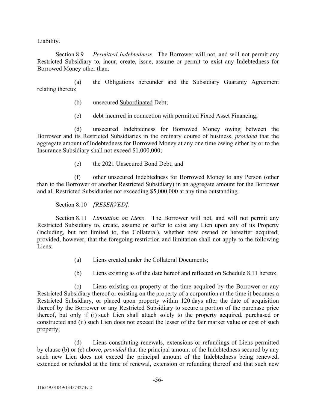 -56- 116549.01049/134574273v.2 Liability. Section 8.9 Permitted Indebtedness. The Borrower will not, and will not permit any Restricted Subsidiary to, incur, create, issue, assume or permit to exist any Indebtedness for Borrowed Money other than: (a) the Obligations hereunder and the Subsidiary Guaranty Agreement relating thereto; (b) unsecured Subordinated Debt; (c) debt incurred in connection with permitted Fixed Asset Financing; (d) unsecured Indebtedness for Borrowed Money owing between the Borrower and its Restricted Subsidiaries in the ordinary course of business, provided that the aggregate amount of Indebtedness for Borrowed Money at any one time owing either by or to the Insurance Subsidiary shall not exceed $1,000,000; (e) the 2021 Unsecured Bond Debt; and (f) other unsecured Indebtedness for Borrowed Money to any Person (other than to the Borrower or another Restricted Subsidiary) in an aggregate amount for the Borrower and all Restricted Subsidiaries not exceeding $5,000,000 at any time outstanding. Section 8.10 [RESERVED]. Section 8.11 Limitation on Liens. The Borrower will not, and will not permit any Restricted Subsidiary to, create, assume or suffer to exist any Lien upon any of its Property (including, but not limited to, the Collateral), whether now owned or hereafter acquired; provided, however, that the foregoing restriction and limitation shall not apply to the following Liens: (a) Liens created under the Collateral Documents; (b) Liens existing as of the date hereof and reflected on Schedule 8.11 hereto; (c) Liens existing on property at the time acquired by the Borrower or any Restricted Subsidiary thereof or existing on the property of a corporation at the time it becomes a Restricted Subsidiary, or placed upon property within 120 days after the date of acquisition thereof by the Borrower or any Restricted Subsidiary to secure a portion of the purchase price thereof, but only if (i) such Lien shall attach solely to the property acquired, purchased or constructed and (ii) such Lien does not exceed the lesser of the fair market value or cost of such property; (d) Liens constituting renewals, extensions or refundings of Liens permitted by clause (b) or (c) above, provided that the principal amount of the Indebtedness secured by any such new Lien does not exceed the principal amount of the Indebtedness being renewed, extended or refunded at the time of renewal, extension or refunding thereof and that such new