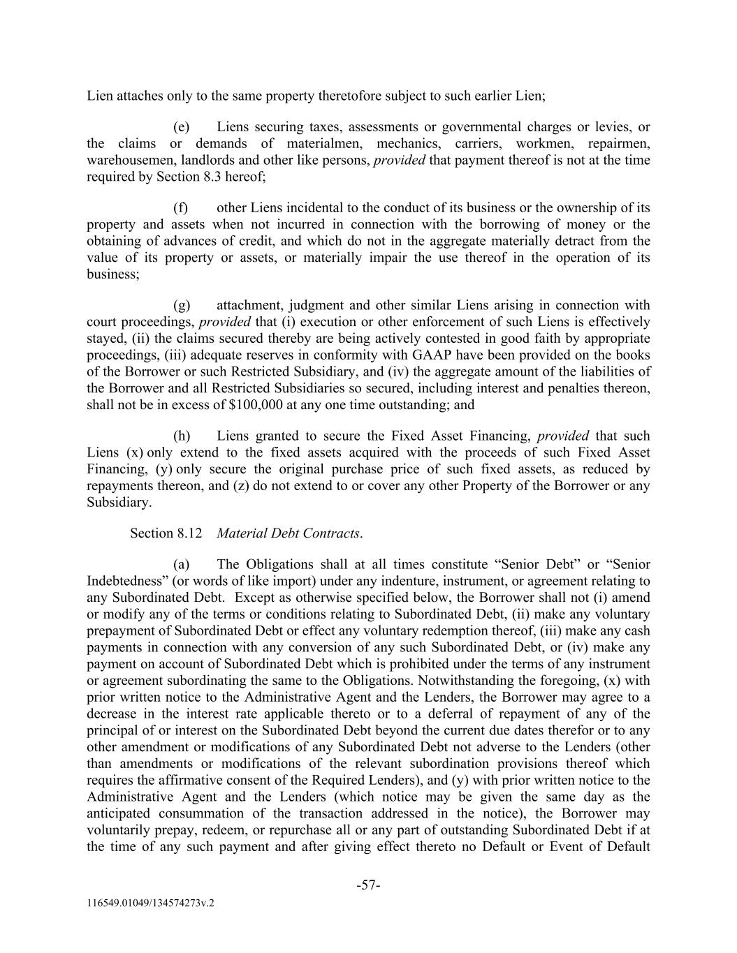 -57- 116549.01049/134574273v.2 Lien attaches only to the same property theretofore subject to such earlier Lien; (e) Liens securing taxes, assessments or governmental charges or levies, or the claims or demands of materialmen, mechanics, carriers, workmen, repairmen, warehousemen, landlords and other like persons, provided that payment thereof is not at the time required by Section 8.3 hereof; (f) other Liens incidental to the conduct of its business or the ownership of its property and assets when not incurred in connection with the borrowing of money or the obtaining of advances of credit, and which do not in the aggregate materially detract from the value of its property or assets, or materially impair the use thereof in the operation of its business; (g) attachment, judgment and other similar Liens arising in connection with court proceedings, provided that (i) execution or other enforcement of such Liens is effectively stayed, (ii) the claims secured thereby are being actively contested in good faith by appropriate proceedings, (iii) adequate reserves in conformity with GAAP have been provided on the books of the Borrower or such Restricted Subsidiary, and (iv) the aggregate amount of the liabilities of the Borrower and all Restricted Subsidiaries so secured, including interest and penalties thereon, shall not be in excess of $100,000 at any one time outstanding; and (h) Liens granted to secure the Fixed Asset Financing, provided that such Liens (x) only extend to the fixed assets acquired with the proceeds of such Fixed Asset Financing, (y) only secure the original purchase price of such fixed assets, as reduced by repayments thereon, and (z) do not extend to or cover any other Property of the Borrower or any Subsidiary. Section 8.12 Material Debt Contracts. (a) The Obligations shall at all times constitute “Senior Debt” or “Senior Indebtedness” (or words of like import) under any indenture, instrument, or agreement relating to any Subordinated Debt. Except as otherwise specified below, the Borrower shall not (i) amend or modify any of the terms or conditions relating to Subordinated Debt, (ii) make any voluntary prepayment of Subordinated Debt or effect any voluntary redemption thereof, (iii) make any cash payments in connection with any conversion of any such Subordinated Debt, or (iv) make any payment on account of Subordinated Debt which is prohibited under the terms of any instrument or agreement subordinating the same to the Obligations. Notwithstanding the foregoing, (x) with prior written notice to the Administrative Agent and the Lenders, the Borrower may agree to a decrease in the interest rate applicable thereto or to a deferral of repayment of any of the principal of or interest on the Subordinated Debt beyond the current due dates therefor or to any other amendment or modifications of any Subordinated Debt not adverse to the Lenders (other than amendments or modifications of the relevant subordination provisions thereof which requires the affirmative consent of the Required Lenders), and (y) with prior written notice to the Administrative Agent and the Lenders (which notice may be given the same day as the anticipated consummation of the transaction addressed in the notice), the Borrower may voluntarily prepay, redeem, or repurchase all or any part of outstanding Subordinated Debt if at the time of any such payment and after giving effect thereto no Default or Event of Default