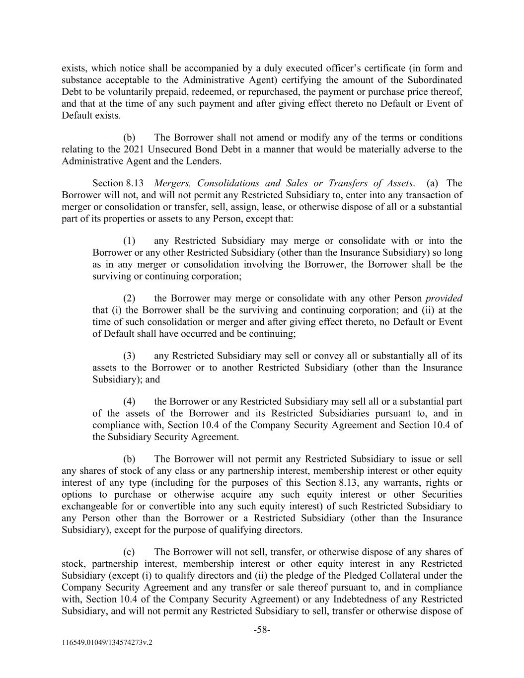 -58- 116549.01049/134574273v.2 exists, which notice shall be accompanied by a duly executed officer’s certificate (in form and substance acceptable to the Administrative Agent) certifying the amount of the Subordinated Debt to be voluntarily prepaid, redeemed, or repurchased, the payment or purchase price thereof, and that at the time of any such payment and after giving effect thereto no Default or Event of Default exists. (b) The Borrower shall not amend or modify any of the terms or conditions relating to the 2021 Unsecured Bond Debt in a manner that would be materially adverse to the Administrative Agent and the Lenders. Section 8.13 Mergers, Consolidations and Sales or Transfers of Assets. (a) The Borrower will not, and will not permit any Restricted Subsidiary to, enter into any transaction of merger or consolidation or transfer, sell, assign, lease, or otherwise dispose of all or a substantial part of its properties or assets to any Person, except that: (1) any Restricted Subsidiary may merge or consolidate with or into the Borrower or any other Restricted Subsidiary (other than the Insurance Subsidiary) so long as in any merger or consolidation involving the Borrower, the Borrower shall be the surviving or continuing corporation; (2) the Borrower may merge or consolidate with any other Person provided that (i) the Borrower shall be the surviving and continuing corporation; and (ii) at the time of such consolidation or merger and after giving effect thereto, no Default or Event of Default shall have occurred and be continuing; (3) any Restricted Subsidiary may sell or convey all or substantially all of its assets to the Borrower or to another Restricted Subsidiary (other than the Insurance Subsidiary); and (4) the Borrower or any Restricted Subsidiary may sell all or a substantial part of the assets of the Borrower and its Restricted Subsidiaries pursuant to, and in compliance with, Section 10.4 of the Company Security Agreement and Section 10.4 of the Subsidiary Security Agreement. (b) The Borrower will not permit any Restricted Subsidiary to issue or sell any shares of stock of any class or any partnership interest, membership interest or other equity interest of any type (including for the purposes of this Section 8.13, any warrants, rights or options to purchase or otherwise acquire any such equity interest or other Securities exchangeable for or convertible into any such equity interest) of such Restricted Subsidiary to any Person other than the Borrower or a Restricted Subsidiary (other than the Insurance Subsidiary), except for the purpose of qualifying directors. (c) The Borrower will not sell, transfer, or otherwise dispose of any shares of stock, partnership interest, membership interest or other equity interest in any Restricted Subsidiary (except (i) to qualify directors and (ii) the pledge of the Pledged Collateral under the Company Security Agreement and any transfer or sale thereof pursuant to, and in compliance with, Section 10.4 of the Company Security Agreement) or any Indebtedness of any Restricted Subsidiary, and will not permit any Restricted Subsidiary to sell, transfer or otherwise dispose of