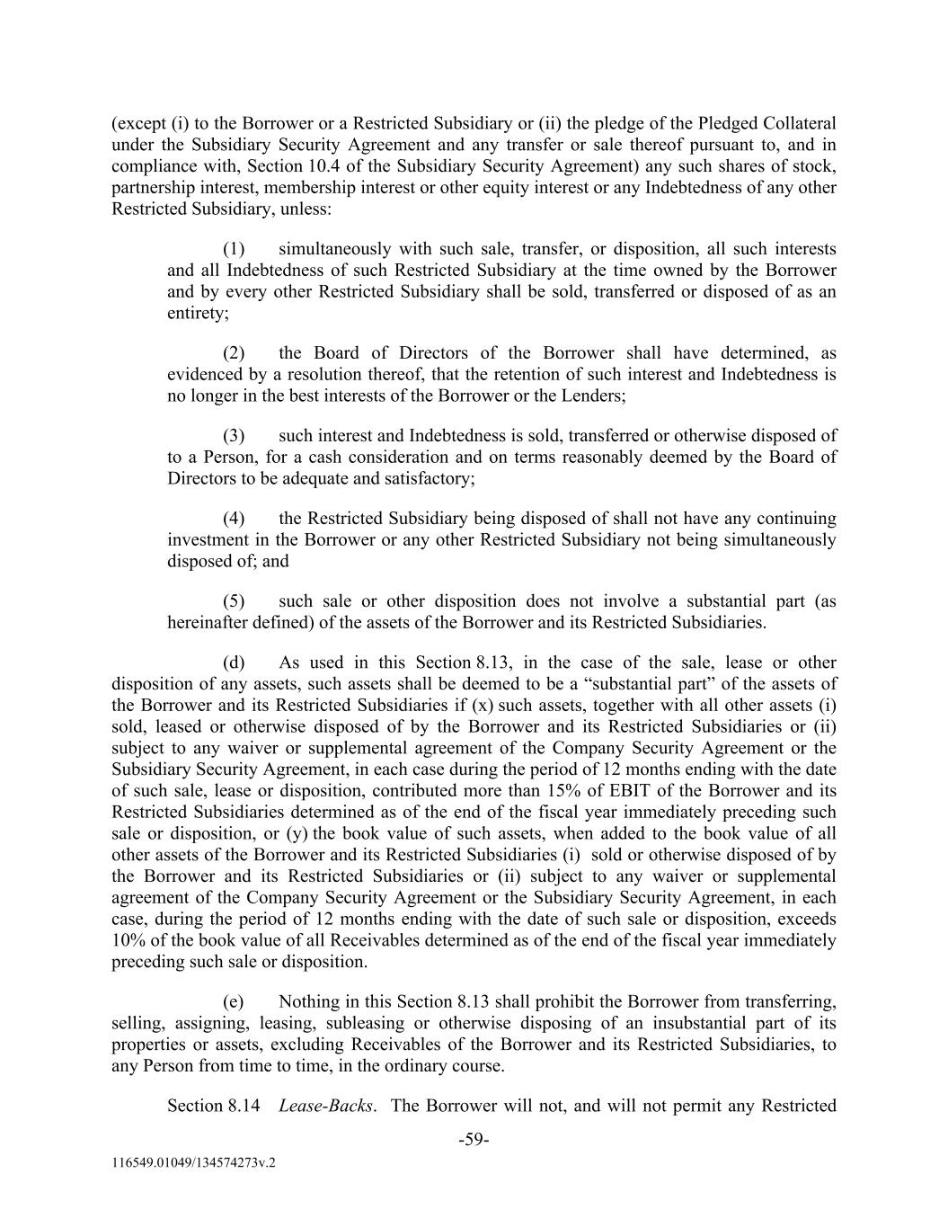 -59- 116549.01049/134574273v.2 (except (i) to the Borrower or a Restricted Subsidiary or (ii) the pledge of the Pledged Collateral under the Subsidiary Security Agreement and any transfer or sale thereof pursuant to, and in compliance with, Section 10.4 of the Subsidiary Security Agreement) any such shares of stock, partnership interest, membership interest or other equity interest or any Indebtedness of any other Restricted Subsidiary, unless: (1) simultaneously with such sale, transfer, or disposition, all such interests and all Indebtedness of such Restricted Subsidiary at the time owned by the Borrower and by every other Restricted Subsidiary shall be sold, transferred or disposed of as an entirety; (2) the Board of Directors of the Borrower shall have determined, as evidenced by a resolution thereof, that the retention of such interest and Indebtedness is no longer in the best interests of the Borrower or the Lenders; (3) such interest and Indebtedness is sold, transferred or otherwise disposed of to a Person, for a cash consideration and on terms reasonably deemed by the Board of Directors to be adequate and satisfactory; (4) the Restricted Subsidiary being disposed of shall not have any continuing investment in the Borrower or any other Restricted Subsidiary not being simultaneously disposed of; and (5) such sale or other disposition does not involve a substantial part (as hereinafter defined) of the assets of the Borrower and its Restricted Subsidiaries. (d) As used in this Section 8.13, in the case of the sale, lease or other disposition of any assets, such assets shall be deemed to be a “substantial part” of the assets of the Borrower and its Restricted Subsidiaries if (x) such assets, together with all other assets (i) sold, leased or otherwise disposed of by the Borrower and its Restricted Subsidiaries or (ii) subject to any waiver or supplemental agreement of the Company Security Agreement or the Subsidiary Security Agreement, in each case during the period of 12 months ending with the date of such sale, lease or disposition, contributed more than 15% of EBIT of the Borrower and its Restricted Subsidiaries determined as of the end of the fiscal year immediately preceding such sale or disposition, or (y) the book value of such assets, when added to the book value of all other assets of the Borrower and its Restricted Subsidiaries (i) sold or otherwise disposed of by the Borrower and its Restricted Subsidiaries or (ii) subject to any waiver or supplemental agreement of the Company Security Agreement or the Subsidiary Security Agreement, in each case, during the period of 12 months ending with the date of such sale or disposition, exceeds 10% of the book value of all Receivables determined as of the end of the fiscal year immediately preceding such sale or disposition. (e) Nothing in this Section 8.13 shall prohibit the Borrower from transferring, selling, assigning, leasing, subleasing or otherwise disposing of an insubstantial part of its properties or assets, excluding Receivables of the Borrower and its Restricted Subsidiaries, to any Person from time to time, in the ordinary course. Section 8.14 Lease-Backs. The Borrower will not, and will not permit any Restricted