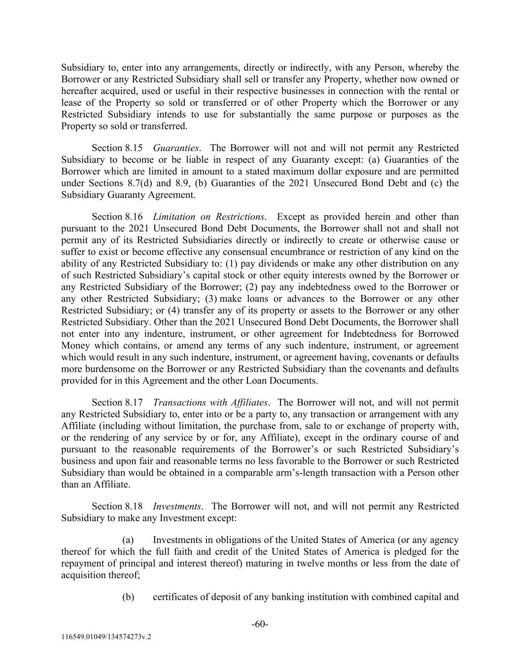 -60- 116549.01049/134574273v.2 Subsidiary to, enter into any arrangements, directly or indirectly, with any Person, whereby the Borrower or any Restricted Subsidiary shall sell or transfer any Property, whether now owned or hereafter acquired, used or useful in their respective businesses in connection with the rental or lease of the Property so sold or transferred or of other Property which the Borrower or any Restricted Subsidiary intends to use for substantially the same purpose or purposes as the Property so sold or transferred. Section 8.15 Guaranties. The Borrower will not and will not permit any Restricted Subsidiary to become or be liable in respect of any Guaranty except: (a) Guaranties of the Borrower which are limited in amount to a stated maximum dollar exposure and are permitted under Sections 8.7(d) and 8.9, (b) Guaranties of the 2021 Unsecured Bond Debt and (c) the Subsidiary Guaranty Agreement. Section 8.16 Limitation on Restrictions. Except as provided herein and other than pursuant to the 2021 Unsecured Bond Debt Documents, the Borrower shall not and shall not permit any of its Restricted Subsidiaries directly or indirectly to create or otherwise cause or suffer to exist or become effective any consensual encumbrance or restriction of any kind on the ability of any Restricted Subsidiary to: (1) pay dividends or make any other distribution on any of such Restricted Subsidiary’s capital stock or other equity interests owned by the Borrower or any Restricted Subsidiary of the Borrower; (2) pay any indebtedness owed to the Borrower or any other Restricted Subsidiary; (3) make loans or advances to the Borrower or any other Restricted Subsidiary; or (4) transfer any of its property or assets to the Borrower or any other Restricted Subsidiary. Other than the 2021 Unsecured Bond Debt Documents, the Borrower shall not enter into any indenture, instrument, or other agreement for Indebtedness for Borrowed Money which contains, or amend any terms of any such indenture, instrument, or agreement which would result in any such indenture, instrument, or agreement having, covenants or defaults more burdensome on the Borrower or any Restricted Subsidiary than the covenants and defaults provided for in this Agreement and the other Loan Documents. Section 8.17 Transactions with Affiliates. The Borrower will not, and will not permit any Restricted Subsidiary to, enter into or be a party to, any transaction or arrangement with any Affiliate (including without limitation, the purchase from, sale to or exchange of property with, or the rendering of any service by or for, any Affiliate), except in the ordinary course of and pursuant to the reasonable requirements of the Borrower’s or such Restricted Subsidiary’s business and upon fair and reasonable terms no less favorable to the Borrower or such Restricted Subsidiary than would be obtained in a comparable arm’s-length transaction with a Person other than an Affiliate. Section 8.18 Investments. The Borrower will not, and will not permit any Restricted Subsidiary to make any Investment except: (a) Investments in obligations of the United States of America (or any agency thereof for which the full faith and credit of the United States of America is pledged for the repayment of principal and interest thereof) maturing in twelve months or less from the date of acquisition thereof; (b) certificates of deposit of any banking institution with combined capital and