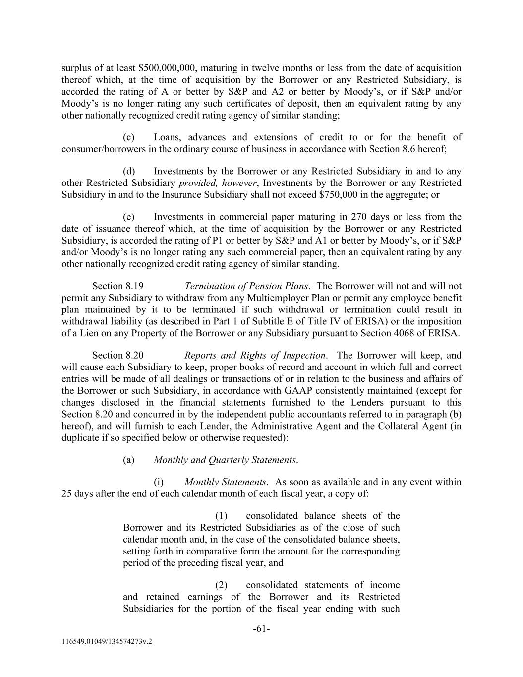 -61- 116549.01049/134574273v.2 surplus of at least $500,000,000, maturing in twelve months or less from the date of acquisition thereof which, at the time of acquisition by the Borrower or any Restricted Subsidiary, is accorded the rating of A or better by S&P and A2 or better by Moody’s, or if S&P and/or Moody’s is no longer rating any such certificates of deposit, then an equivalent rating by any other nationally recognized credit rating agency of similar standing; (c) Loans, advances and extensions of credit to or for the benefit of consumer/borrowers in the ordinary course of business in accordance with Section 8.6 hereof; (d) Investments by the Borrower or any Restricted Subsidiary in and to any other Restricted Subsidiary provided, however, Investments by the Borrower or any Restricted Subsidiary in and to the Insurance Subsidiary shall not exceed $750,000 in the aggregate; or (e) Investments in commercial paper maturing in 270 days or less from the date of issuance thereof which, at the time of acquisition by the Borrower or any Restricted Subsidiary, is accorded the rating of P1 or better by S&P and A1 or better by Moody’s, or if S&P and/or Moody’s is no longer rating any such commercial paper, then an equivalent rating by any other nationally recognized credit rating agency of similar standing. Section 8.19 Termination of Pension Plans. The Borrower will not and will not permit any Subsidiary to withdraw from any Multiemployer Plan or permit any employee benefit plan maintained by it to be terminated if such withdrawal or termination could result in withdrawal liability (as described in Part 1 of Subtitle E of Title IV of ERISA) or the imposition of a Lien on any Property of the Borrower or any Subsidiary pursuant to Section 4068 of ERISA. Section 8.20 Reports and Rights of Inspection. The Borrower will keep, and will cause each Subsidiary to keep, proper books of record and account in which full and correct entries will be made of all dealings or transactions of or in relation to the business and affairs of the Borrower or such Subsidiary, in accordance with GAAP consistently maintained (except for changes disclosed in the financial statements furnished to the Lenders pursuant to this Section 8.20 and concurred in by the independent public accountants referred to in paragraph (b) hereof), and will furnish to each Lender, the Administrative Agent and the Collateral Agent (in duplicate if so specified below or otherwise requested): (a) Monthly and Quarterly Statements. (i) Monthly Statements. As soon as available and in any event within 25 days after the end of each calendar month of each fiscal year, a copy of: (1) consolidated balance sheets of the Borrower and its Restricted Subsidiaries as of the close of such calendar month and, in the case of the consolidated balance sheets, setting forth in comparative form the amount for the corresponding period of the preceding fiscal year, and (2) consolidated statements of income and retained earnings of the Borrower and its Restricted Subsidiaries for the portion of the fiscal year ending with such