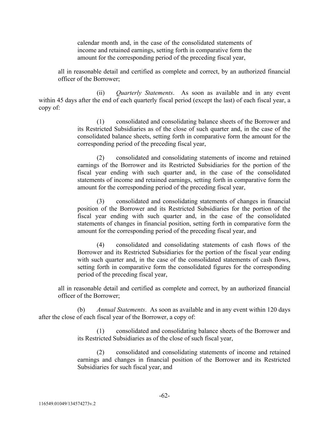 -62- 116549.01049/134574273v.2 calendar month and, in the case of the consolidated statements of income and retained earnings, setting forth in comparative form the amount for the corresponding period of the preceding fiscal year, all in reasonable detail and certified as complete and correct, by an authorized financial officer of the Borrower; (ii) Quarterly Statements. As soon as available and in any event within 45 days after the end of each quarterly fiscal period (except the last) of each fiscal year, a copy of: (1) consolidated and consolidating balance sheets of the Borrower and its Restricted Subsidiaries as of the close of such quarter and, in the case of the consolidated balance sheets, setting forth in comparative form the amount for the corresponding period of the preceding fiscal year, (2) consolidated and consolidating statements of income and retained earnings of the Borrower and its Restricted Subsidiaries for the portion of the fiscal year ending with such quarter and, in the case of the consolidated statements of income and retained earnings, setting forth in comparative form the amount for the corresponding period of the preceding fiscal year, (3) consolidated and consolidating statements of changes in financial position of the Borrower and its Restricted Subsidiaries for the portion of the fiscal year ending with such quarter and, in the case of the consolidated statements of changes in financial position, setting forth in comparative form the amount for the corresponding period of the preceding fiscal year, and (4) consolidated and consolidating statements of cash flows of the Borrower and its Restricted Subsidiaries for the portion of the fiscal year ending with such quarter and, in the case of the consolidated statements of cash flows, setting forth in comparative form the consolidated figures for the corresponding period of the preceding fiscal year, all in reasonable detail and certified as complete and correct, by an authorized financial officer of the Borrower; (b) Annual Statements. As soon as available and in any event within 120 days after the close of each fiscal year of the Borrower, a copy of: (1) consolidated and consolidating balance sheets of the Borrower and its Restricted Subsidiaries as of the close of such fiscal year, (2) consolidated and consolidating statements of income and retained earnings and changes in financial position of the Borrower and its Restricted Subsidiaries for such fiscal year, and