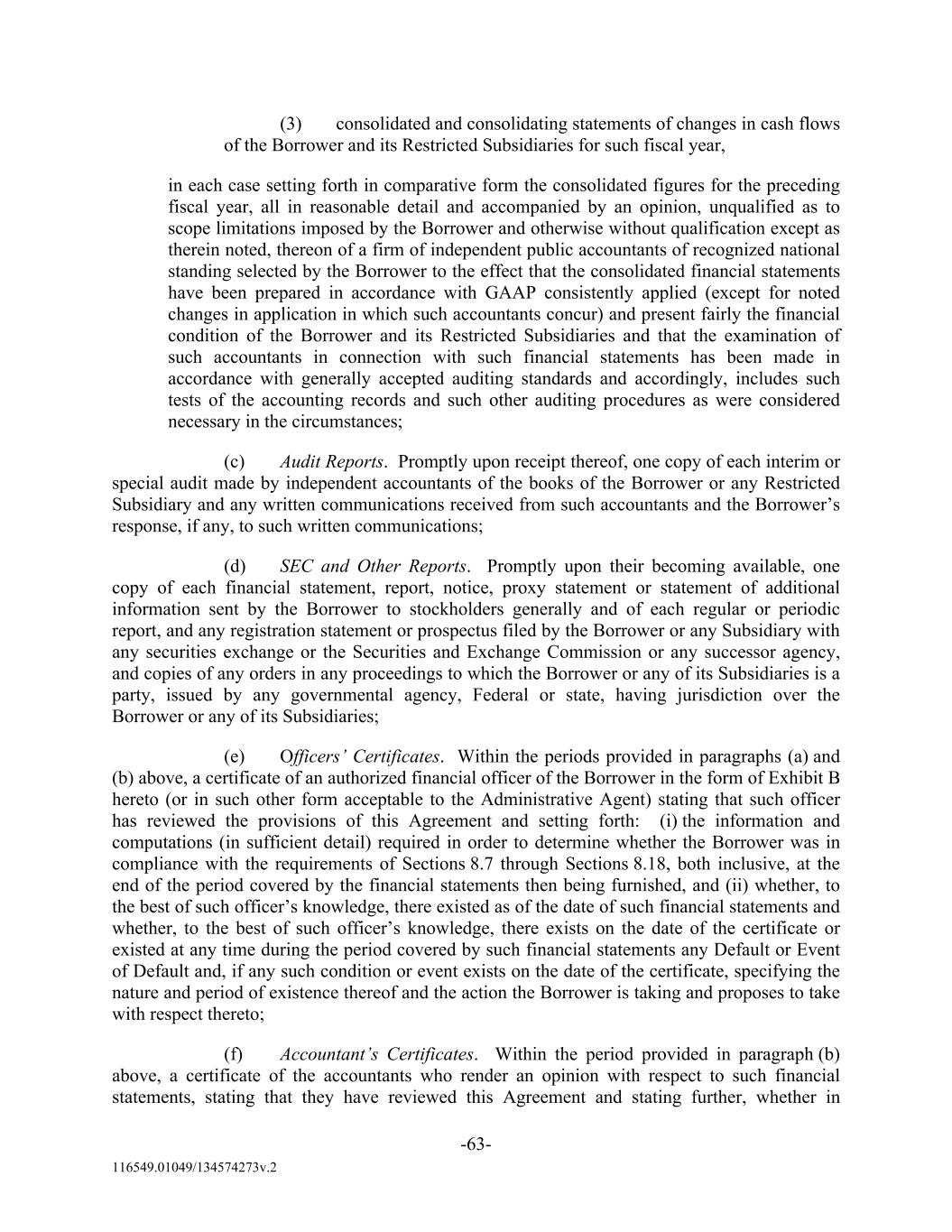 -63- 116549.01049/134574273v.2 (3) consolidated and consolidating statements of changes in cash flows of the Borrower and its Restricted Subsidiaries for such fiscal year, in each case setting forth in comparative form the consolidated figures for the preceding fiscal year, all in reasonable detail and accompanied by an opinion, unqualified as to scope limitations imposed by the Borrower and otherwise without qualification except as therein noted, thereon of a firm of independent public accountants of recognized national standing selected by the Borrower to the effect that the consolidated financial statements have been prepared in accordance with GAAP consistently applied (except for noted changes in application in which such accountants concur) and present fairly the financial condition of the Borrower and its Restricted Subsidiaries and that the examination of such accountants in connection with such financial statements has been made in accordance with generally accepted auditing standards and accordingly, includes such tests of the accounting records and such other auditing procedures as were considered necessary in the circumstances; (c) Audit Reports. Promptly upon receipt thereof, one copy of each interim or special audit made by independent accountants of the books of the Borrower or any Restricted Subsidiary and any written communications received from such accountants and the Borrower’s response, if any, to such written communications; (d) SEC and Other Reports. Promptly upon their becoming available, one copy of each financial statement, report, notice, proxy statement or statement of additional information sent by the Borrower to stockholders generally and of each regular or periodic report, and any registration statement or prospectus filed by the Borrower or any Subsidiary with any securities exchange or the Securities and Exchange Commission or any successor agency, and copies of any orders in any proceedings to which the Borrower or any of its Subsidiaries is a party, issued by any governmental agency, Federal or state, having jurisdiction over the Borrower or any of its Subsidiaries; (e) Officers’ Certificates. Within the periods provided in paragraphs (a) and (b) above, a certificate of an authorized financial officer of the Borrower in the form of Exhibit B hereto (or in such other form acceptable to the Administrative Agent) stating that such officer has reviewed the provisions of this Agreement and setting forth: (i) the information and computations (in sufficient detail) required in order to determine whether the Borrower was in compliance with the requirements of Sections 8.7 through Sections 8.18, both inclusive, at the end of the period covered by the financial statements then being furnished, and (ii) whether, to the best of such officer’s knowledge, there existed as of the date of such financial statements and whether, to the best of such officer’s knowledge, there exists on the date of the certificate or existed at any time during the period covered by such financial statements any Default or Event of Default and, if any such condition or event exists on the date of the certificate, specifying the nature and period of existence thereof and the action the Borrower is taking and proposes to take with respect thereto; (f) Accountant’s Certificates. Within the period provided in paragraph (b) above, a certificate of the accountants who render an opinion with respect to such financial statements, stating that they have reviewed this Agreement and stating further, whether in