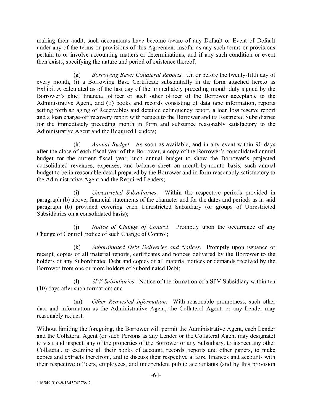 -64- 116549.01049/134574273v.2 making their audit, such accountants have become aware of any Default or Event of Default under any of the terms or provisions of this Agreement insofar as any such terms or provisions pertain to or involve accounting matters or determinations, and if any such condition or event then exists, specifying the nature and period of existence thereof; (g) Borrowing Base; Collateral Reports. On or before the twenty-fifth day of every month, (i) a Borrowing Base Certificate substantially in the form attached hereto as Exhibit A calculated as of the last day of the immediately preceding month duly signed by the Borrower’s chief financial officer or such other officer of the Borrower acceptable to the Administrative Agent, and (ii) books and records consisting of data tape information, reports setting forth an aging of Receivables and detailed delinquency report, a loan loss reserve report and a loan charge-off recovery report with respect to the Borrower and its Restricted Subsidiaries for the immediately preceding month in form and substance reasonably satisfactory to the Administrative Agent and the Required Lenders; (h) Annual Budget. As soon as available, and in any event within 90 days after the close of each fiscal year of the Borrower, a copy of the Borrower’s consolidated annual budget for the current fiscal year, such annual budget to show the Borrower’s projected consolidated revenues, expenses, and balance sheet on month-by-month basis, such annual budget to be in reasonable detail prepared by the Borrower and in form reasonably satisfactory to the Administrative Agent and the Required Lenders; (i) Unrestricted Subsidiaries. Within the respective periods provided in paragraph (b) above, financial statements of the character and for the dates and periods as in said paragraph (b) provided covering each Unrestricted Subsidiary (or groups of Unrestricted Subsidiaries on a consolidated basis); (j) Notice of Change of Control. Promptly upon the occurrence of any Change of Control, notice of such Change of Control; (k) Subordinated Debt Deliveries and Notices. Promptly upon issuance or receipt, copies of all material reports, certificates and notices delivered by the Borrower to the holders of any Subordinated Debt and copies of all material notices or demands received by the Borrower from one or more holders of Subordinated Debt; (l) SPV Subsidiaries. Notice of the formation of a SPV Subsidiary within ten (10) days after such formation; and (m) Other Requested Information. With reasonable promptness, such other data and information as the Administrative Agent, the Collateral Agent, or any Lender may reasonably request. Without limiting the foregoing, the Borrower will permit the Administrative Agent, each Lender and the Collateral Agent (or such Persons as any Lender or the Collateral Agent may designate) to visit and inspect, any of the properties of the Borrower or any Subsidiary, to inspect any other Collateral, to examine all their books of account, records, reports and other papers, to make copies and extracts therefrom, and to discuss their respective affairs, finances and accounts with their respective officers, employees, and independent public accountants (and by this provision
