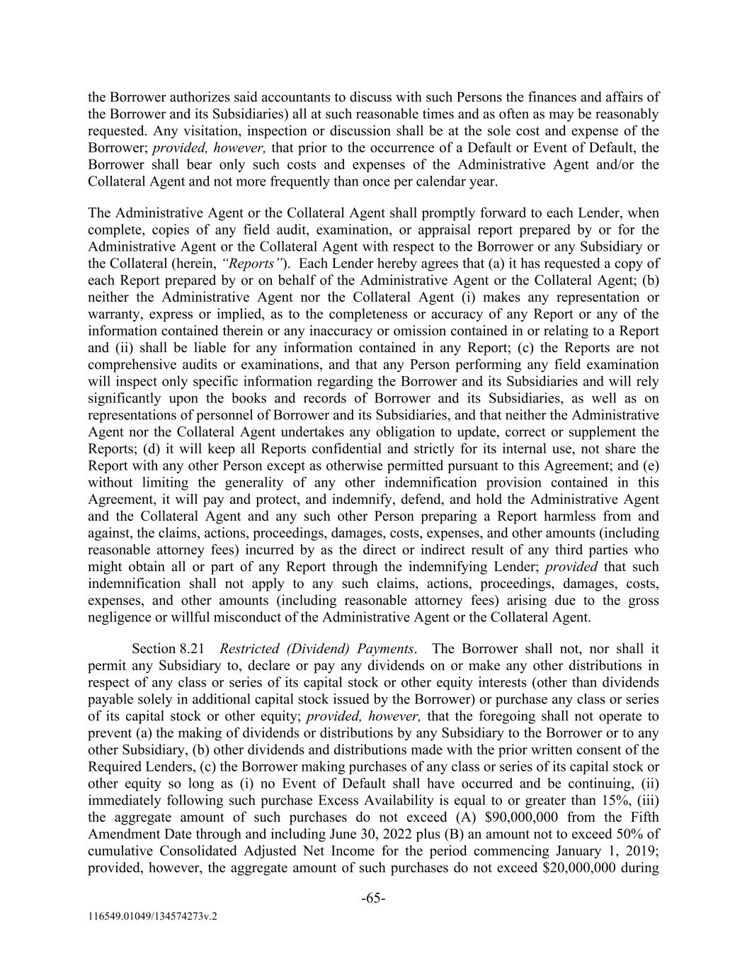 -65- 116549.01049/134574273v.2 the Borrower authorizes said accountants to discuss with such Persons the finances and affairs of the Borrower and its Subsidiaries) all at such reasonable times and as often as may be reasonably requested. Any visitation, inspection or discussion shall be at the sole cost and expense of the Borrower; provided, however, that prior to the occurrence of a Default or Event of Default, the Borrower shall bear only such costs and expenses of the Administrative Agent and/or the Collateral Agent and not more frequently than once per calendar year. The Administrative Agent or the Collateral Agent shall promptly forward to each Lender, when complete, copies of any field audit, examination, or appraisal report prepared by or for the Administrative Agent or the Collateral Agent with respect to the Borrower or any Subsidiary or the Collateral (herein, “Reports”). Each Lender hereby agrees that (a) it has requested a copy of each Report prepared by or on behalf of the Administrative Agent or the Collateral Agent; (b) neither the Administrative Agent nor the Collateral Agent (i) makes any representation or warranty, express or implied, as to the completeness or accuracy of any Report or any of the information contained therein or any inaccuracy or omission contained in or relating to a Report and (ii) shall be liable for any information contained in any Report; (c) the Reports are not comprehensive audits or examinations, and that any Person performing any field examination will inspect only specific information regarding the Borrower and its Subsidiaries and will rely significantly upon the books and records of Borrower and its Subsidiaries, as well as on representations of personnel of Borrower and its Subsidiaries, and that neither the Administrative Agent nor the Collateral Agent undertakes any obligation to update, correct or supplement the Reports; (d) it will keep all Reports confidential and strictly for its internal use, not share the Report with any other Person except as otherwise permitted pursuant to this Agreement; and (e) without limiting the generality of any other indemnification provision contained in this Agreement, it will pay and protect, and indemnify, defend, and hold the Administrative Agent and the Collateral Agent and any such other Person preparing a Report harmless from and against, the claims, actions, proceedings, damages, costs, expenses, and other amounts (including reasonable attorney fees) incurred by as the direct or indirect result of any third parties who might obtain all or part of any Report through the indemnifying Lender; provided that such indemnification shall not apply to any such claims, actions, proceedings, damages, costs, expenses, and other amounts (including reasonable attorney fees) arising due to the gross negligence or willful misconduct of the Administrative Agent or the Collateral Agent. Section 8.21 Restricted (Dividend) Payments. The Borrower shall not, nor shall it permit any Subsidiary to, declare or pay any dividends on or make any other distributions in respect of any class or series of its capital stock or other equity interests (other than dividends payable solely in additional capital stock issued by the Borrower) or purchase any class or series of its capital stock or other equity; provided, however, that the foregoing shall not operate to prevent (a) the making of dividends or distributions by any Subsidiary to the Borrower or to any other Subsidiary, (b) other dividends and distributions made with the prior written consent of the Required Lenders, (c) the Borrower making purchases of any class or series of its capital stock or other equity so long as (i) no Event of Default shall have occurred and be continuing, (ii) immediately following such purchase Excess Availability is equal to or greater than 15%, (iii) the aggregate amount of such purchases do not exceed (A) $90,000,000 from the Fifth Amendment Date through and including June 30, 2022 plus (B) an amount not to exceed 50% of cumulative Consolidated Adjusted Net Income for the period commencing January 1, 2019; provided, however, the aggregate amount of such purchases do not exceed $20,000,000 during