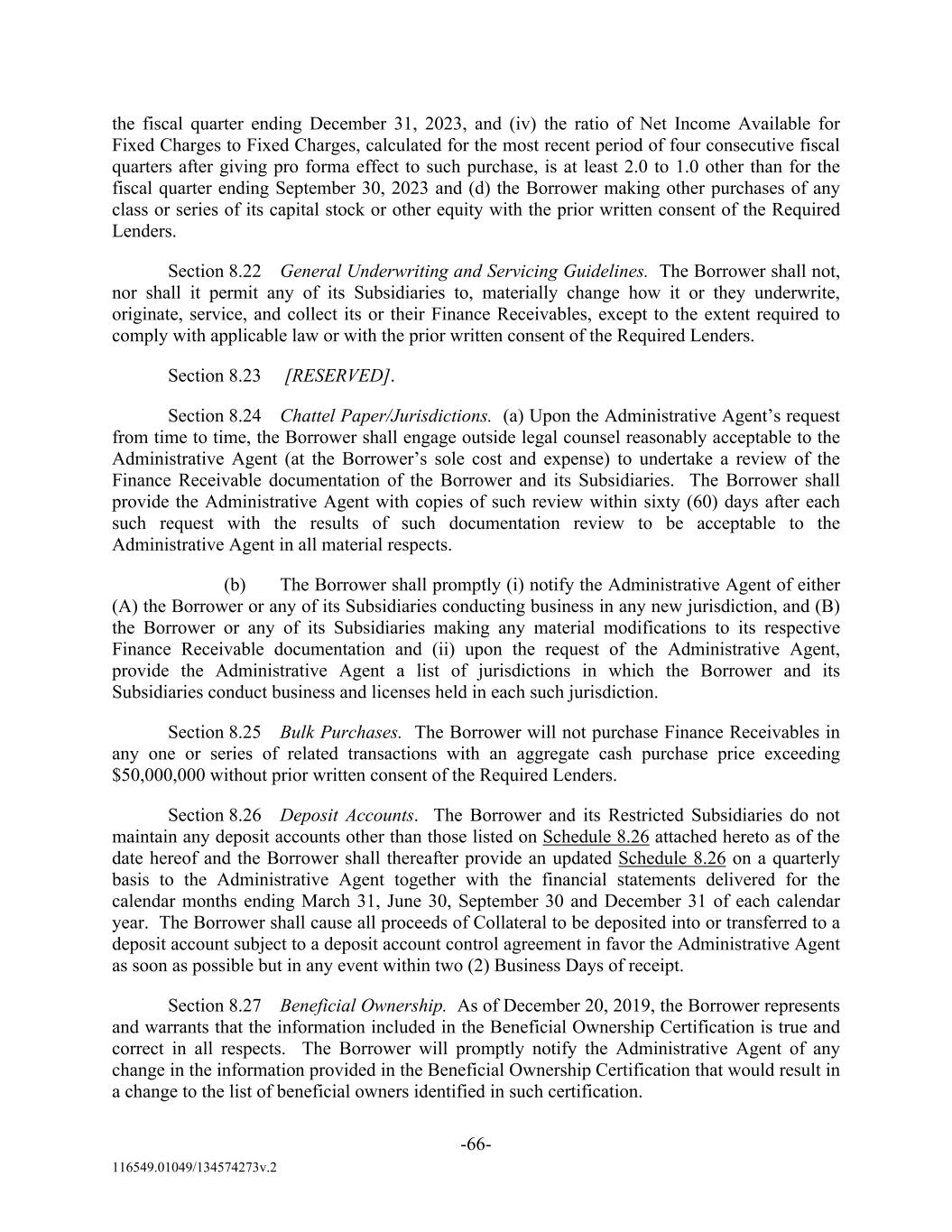 -66- 116549.01049/134574273v.2 the fiscal quarter ending December 31, 2023, and (iv) the ratio of Net Income Available for Fixed Charges to Fixed Charges, calculated for the most recent period of four consecutive fiscal quarters after giving pro forma effect to such purchase, is at least 2.0 to 1.0 other than for the fiscal quarter ending September 30, 2023 and (d) the Borrower making other purchases of any class or series of its capital stock or other equity with the prior written consent of the Required Lenders. Section 8.22 General Underwriting and Servicing Guidelines. The Borrower shall not, nor shall it permit any of its Subsidiaries to, materially change how it or they underwrite, originate, service, and collect its or their Finance Receivables, except to the extent required to comply with applicable law or with the prior written consent of the Required Lenders. Section 8.23 [RESERVED]. Section 8.24 Chattel Paper/Jurisdictions. (a) Upon the Administrative Agent’s request from time to time, the Borrower shall engage outside legal counsel reasonably acceptable to the Administrative Agent (at the Borrower’s sole cost and expense) to undertake a review of the Finance Receivable documentation of the Borrower and its Subsidiaries. The Borrower shall provide the Administrative Agent with copies of such review within sixty (60) days after each such request with the results of such documentation review to be acceptable to the Administrative Agent in all material respects. (b) The Borrower shall promptly (i) notify the Administrative Agent of either (A) the Borrower or any of its Subsidiaries conducting business in any new jurisdiction, and (B) the Borrower or any of its Subsidiaries making any material modifications to its respective Finance Receivable documentation and (ii) upon the request of the Administrative Agent, provide the Administrative Agent a list of jurisdictions in which the Borrower and its Subsidiaries conduct business and licenses held in each such jurisdiction. Section 8.25 Bulk Purchases. The Borrower will not purchase Finance Receivables in any one or series of related transactions with an aggregate cash purchase price exceeding $50,000,000 without prior written consent of the Required Lenders. Section 8.26 Deposit Accounts. The Borrower and its Restricted Subsidiaries do not maintain any deposit accounts other than those listed on Schedule 8.26 attached hereto as of the date hereof and the Borrower shall thereafter provide an updated Schedule 8.26 on a quarterly basis to the Administrative Agent together with the financial statements delivered for the calendar months ending March 31, June 30, September 30 and December 31 of each calendar year. The Borrower shall cause all proceeds of Collateral to be deposited into or transferred to a deposit account subject to a deposit account control agreement in favor the Administrative Agent as soon as possible but in any event within two (2) Business Days of receipt. Section 8.27 Beneficial Ownership. As of December 20, 2019, the Borrower represents and warrants that the information included in the Beneficial Ownership Certification is true and correct in all respects. The Borrower will promptly notify the Administrative Agent of any change in the information provided in the Beneficial Ownership Certification that would result in a change to the list of beneficial owners identified in such certification.