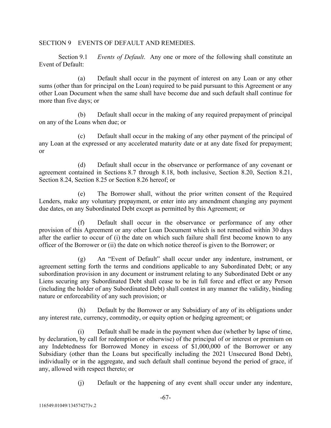 -67- 116549.01049/134574273v.2 SECTION 9 EVENTS OF DEFAULT AND REMEDIES. Section 9.1 Events of Default. Any one or more of the following shall constitute an Event of Default: (a) Default shall occur in the payment of interest on any Loan or any other sums (other than for principal on the Loan) required to be paid pursuant to this Agreement or any other Loan Document when the same shall have become due and such default shall continue for more than five days; or (b) Default shall occur in the making of any required prepayment of principal on any of the Loans when due; or (c) Default shall occur in the making of any other payment of the principal of any Loan at the expressed or any accelerated maturity date or at any date fixed for prepayment; or (d) Default shall occur in the observance or performance of any covenant or agreement contained in Sections 8.7 through 8.18, both inclusive, Section 8.20, Section 8.21, Section 8.24, Section 8.25 or Section 8.26 hereof; or (e) The Borrower shall, without the prior written consent of the Required Lenders, make any voluntary prepayment, or enter into any amendment changing any payment due dates, on any Subordinated Debt except as permitted by this Agreement; or (f) Default shall occur in the observance or performance of any other provision of this Agreement or any other Loan Document which is not remedied within 30 days after the earlier to occur of (i) the date on which such failure shall first become known to any officer of the Borrower or (ii) the date on which notice thereof is given to the Borrower; or (g) An “Event of Default” shall occur under any indenture, instrument, or agreement setting forth the terms and conditions applicable to any Subordinated Debt; or any subordination provision in any document or instrument relating to any Subordinated Debt or any Liens securing any Subordinated Debt shall cease to be in full force and effect or any Person (including the holder of any Subordinated Debt) shall contest in any manner the validity, binding nature or enforceability of any such provision; or (h) Default by the Borrower or any Subsidiary of any of its obligations under any interest rate, currency, commodity, or equity option or hedging agreement; or (i) Default shall be made in the payment when due (whether by lapse of time, by declaration, by call for redemption or otherwise) of the principal of or interest or premium on any Indebtedness for Borrowed Money in excess of $1,000,000 of the Borrower or any Subsidiary (other than the Loans but specifically including the 2021 Unsecured Bond Debt), individually or in the aggregate, and such default shall continue beyond the period of grace, if any, allowed with respect thereto; or (j) Default or the happening of any event shall occur under any indenture,