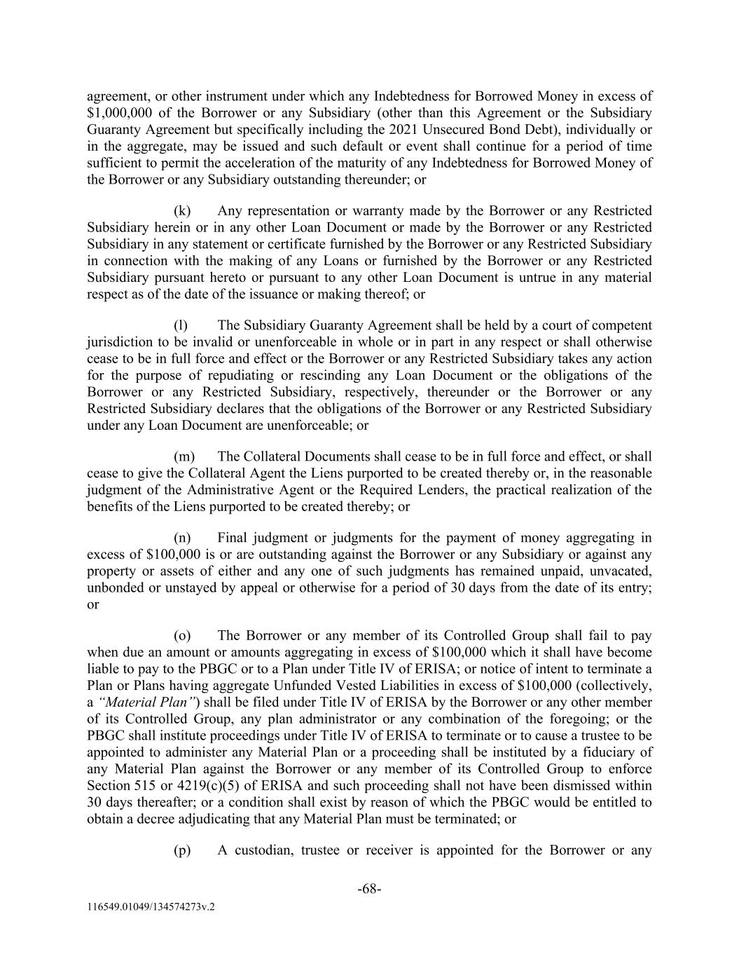 -68- 116549.01049/134574273v.2 agreement, or other instrument under which any Indebtedness for Borrowed Money in excess of $1,000,000 of the Borrower or any Subsidiary (other than this Agreement or the Subsidiary Guaranty Agreement but specifically including the 2021 Unsecured Bond Debt), individually or in the aggregate, may be issued and such default or event shall continue for a period of time sufficient to permit the acceleration of the maturity of any Indebtedness for Borrowed Money of the Borrower or any Subsidiary outstanding thereunder; or (k) Any representation or warranty made by the Borrower or any Restricted Subsidiary herein or in any other Loan Document or made by the Borrower or any Restricted Subsidiary in any statement or certificate furnished by the Borrower or any Restricted Subsidiary in connection with the making of any Loans or furnished by the Borrower or any Restricted Subsidiary pursuant hereto or pursuant to any other Loan Document is untrue in any material respect as of the date of the issuance or making thereof; or (l) The Subsidiary Guaranty Agreement shall be held by a court of competent jurisdiction to be invalid or unenforceable in whole or in part in any respect or shall otherwise cease to be in full force and effect or the Borrower or any Restricted Subsidiary takes any action for the purpose of repudiating or rescinding any Loan Document or the obligations of the Borrower or any Restricted Subsidiary, respectively, thereunder or the Borrower or any Restricted Subsidiary declares that the obligations of the Borrower or any Restricted Subsidiary under any Loan Document are unenforceable; or (m) The Collateral Documents shall cease to be in full force and effect, or shall cease to give the Collateral Agent the Liens purported to be created thereby or, in the reasonable judgment of the Administrative Agent or the Required Lenders, the practical realization of the benefits of the Liens purported to be created thereby; or (n) Final judgment or judgments for the payment of money aggregating in excess of $100,000 is or are outstanding against the Borrower or any Subsidiary or against any property or assets of either and any one of such judgments has remained unpaid, unvacated, unbonded or unstayed by appeal or otherwise for a period of 30 days from the date of its entry; or (o) The Borrower or any member of its Controlled Group shall fail to pay when due an amount or amounts aggregating in excess of $100,000 which it shall have become liable to pay to the PBGC or to a Plan under Title IV of ERISA; or notice of intent to terminate a Plan or Plans having aggregate Unfunded Vested Liabilities in excess of $100,000 (collectively, a “Material Plan”) shall be filed under Title IV of ERISA by the Borrower or any other member of its Controlled Group, any plan administrator or any combination of the foregoing; or the PBGC shall institute proceedings under Title IV of ERISA to terminate or to cause a trustee to be appointed to administer any Material Plan or a proceeding shall be instituted by a fiduciary of any Material Plan against the Borrower or any member of its Controlled Group to enforce Section 515 or 4219(c)(5) of ERISA and such proceeding shall not have been dismissed within 30 days thereafter; or a condition shall exist by reason of which the PBGC would be entitled to obtain a decree adjudicating that any Material Plan must be terminated; or (p) A custodian, trustee or receiver is appointed for the Borrower or any