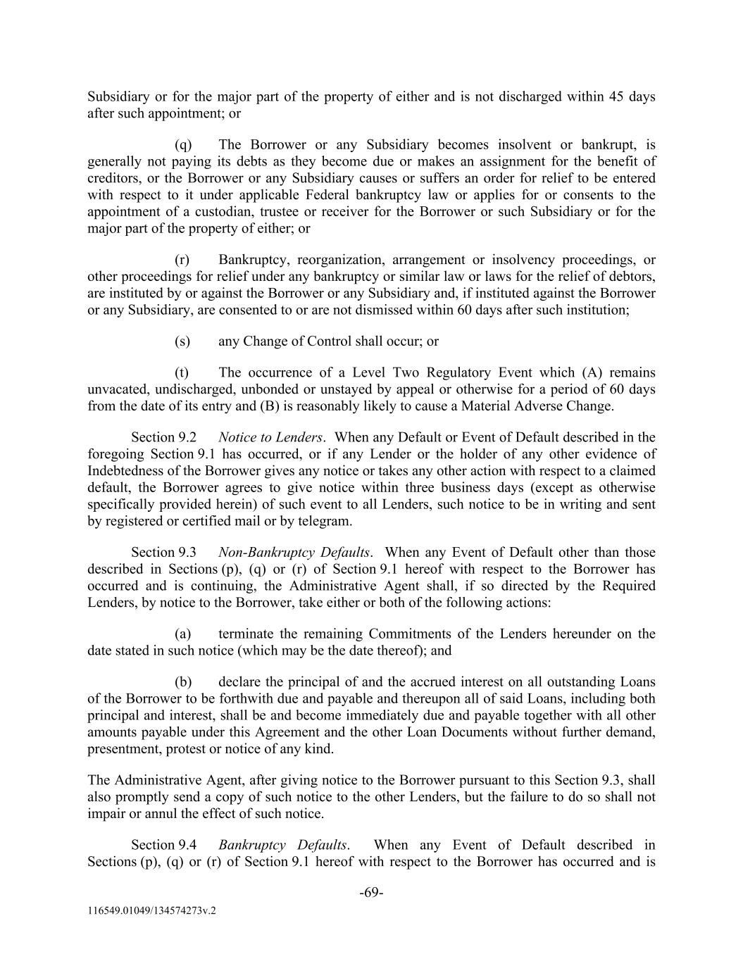 -69- 116549.01049/134574273v.2 Subsidiary or for the major part of the property of either and is not discharged within 45 days after such appointment; or (q) The Borrower or any Subsidiary becomes insolvent or bankrupt, is generally not paying its debts as they become due or makes an assignment for the benefit of creditors, or the Borrower or any Subsidiary causes or suffers an order for relief to be entered with respect to it under applicable Federal bankruptcy law or applies for or consents to the appointment of a custodian, trustee or receiver for the Borrower or such Subsidiary or for the major part of the property of either; or (r) Bankruptcy, reorganization, arrangement or insolvency proceedings, or other proceedings for relief under any bankruptcy or similar law or laws for the relief of debtors, are instituted by or against the Borrower or any Subsidiary and, if instituted against the Borrower or any Subsidiary, are consented to or are not dismissed within 60 days after such institution; (s) any Change of Control shall occur; or (t) The occurrence of a Level Two Regulatory Event which (A) remains unvacated, undischarged, unbonded or unstayed by appeal or otherwise for a period of 60 days from the date of its entry and (B) is reasonably likely to cause a Material Adverse Change. Section 9.2 Notice to Lenders. When any Default or Event of Default described in the foregoing Section 9.1 has occurred, or if any Lender or the holder of any other evidence of Indebtedness of the Borrower gives any notice or takes any other action with respect to a claimed default, the Borrower agrees to give notice within three business days (except as otherwise specifically provided herein) of such event to all Lenders, such notice to be in writing and sent by registered or certified mail or by telegram. Section 9.3 Non-Bankruptcy Defaults. When any Event of Default other than those described in Sections (p), (q) or (r) of Section 9.1 hereof with respect to the Borrower has occurred and is continuing, the Administrative Agent shall, if so directed by the Required Lenders, by notice to the Borrower, take either or both of the following actions: (a) terminate the remaining Commitments of the Lenders hereunder on the date stated in such notice (which may be the date thereof); and (b) declare the principal of and the accrued interest on all outstanding Loans of the Borrower to be forthwith due and payable and thereupon all of said Loans, including both principal and interest, shall be and become immediately due and payable together with all other amounts payable under this Agreement and the other Loan Documents without further demand, presentment, protest or notice of any kind. The Administrative Agent, after giving notice to the Borrower pursuant to this Section 9.3, shall also promptly send a copy of such notice to the other Lenders, but the failure to do so shall not impair or annul the effect of such notice. Section 9.4 Bankruptcy Defaults. When any Event of Default described in Sections (p), (q) or (r) of Section 9.1 hereof with respect to the Borrower has occurred and is