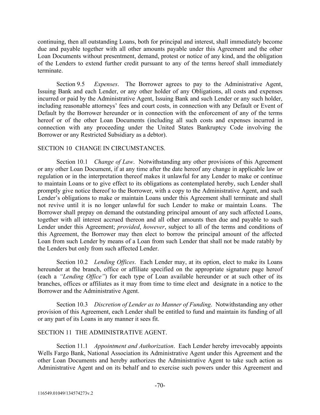 -70- 116549.01049/134574273v.2 continuing, then all outstanding Loans, both for principal and interest, shall immediately become due and payable together with all other amounts payable under this Agreement and the other Loan Documents without presentment, demand, protest or notice of any kind, and the obligation of the Lenders to extend further credit pursuant to any of the terms hereof shall immediately terminate. Section 9.5 Expenses. The Borrower agrees to pay to the Administrative Agent, Issuing Bank and each Lender, or any other holder of any Obligations, all costs and expenses incurred or paid by the Administrative Agent, Issuing Bank and such Lender or any such holder, including reasonable attorneys’ fees and court costs, in connection with any Default or Event of Default by the Borrower hereunder or in connection with the enforcement of any of the terms hereof or of the other Loan Documents (including all such costs and expenses incurred in connection with any proceeding under the United States Bankruptcy Code involving the Borrower or any Restricted Subsidiary as a debtor). SECTION 10 CHANGE IN CIRCUMSTANCES. Section 10.1 Change of Law. Notwithstanding any other provisions of this Agreement or any other Loan Document, if at any time after the date hereof any change in applicable law or regulation or in the interpretation thereof makes it unlawful for any Lender to make or continue to maintain Loans or to give effect to its obligations as contemplated hereby, such Lender shall promptly give notice thereof to the Borrower, with a copy to the Administrative Agent, and such Lender’s obligations to make or maintain Loans under this Agreement shall terminate and shall not revive until it is no longer unlawful for such Lender to make or maintain Loans. The Borrower shall prepay on demand the outstanding principal amount of any such affected Loans, together with all interest accrued thereon and all other amounts then due and payable to such Lender under this Agreement; provided, however, subject to all of the terms and conditions of this Agreement, the Borrower may then elect to borrow the principal amount of the affected Loan from such Lender by means of a Loan from such Lender that shall not be made ratably by the Lenders but only from such affected Lender. Section 10.2 Lending Offices. Each Lender may, at its option, elect to make its Loans hereunder at the branch, office or affiliate specified on the appropriate signature page hereof (each a “Lending Office”) for each type of Loan available hereunder or at such other of its branches, offices or affiliates as it may from time to time elect and designate in a notice to the Borrower and the Administrative Agent. Section 10.3 Discretion of Lender as to Manner of Funding. Notwithstanding any other provision of this Agreement, each Lender shall be entitled to fund and maintain its funding of all or any part of its Loans in any manner it sees fit. SECTION 11 THE ADMINISTRATIVE AGENT. Section 11.1 Appointment and Authorization. Each Lender hereby irrevocably appoints Wells Fargo Bank, National Association its Administrative Agent under this Agreement and the other Loan Documents and hereby authorizes the Administrative Agent to take such action as Administrative Agent and on its behalf and to exercise such powers under this Agreement and