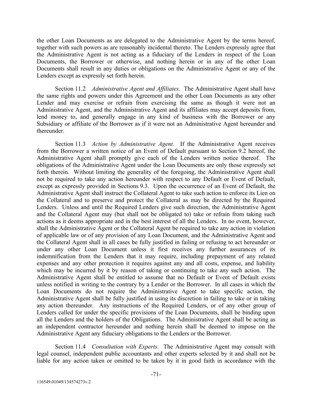 -71- 116549.01049/134574273v.2 the other Loan Documents as are delegated to the Administrative Agent by the terms hereof, together with such powers as are reasonably incidental thereto. The Lenders expressly agree that the Administrative Agent is not acting as a fiduciary of the Lenders in respect of the Loan Documents, the Borrower or otherwise, and nothing herein or in any of the other Loan Documents shall result in any duties or obligations on the Administrative Agent or any of the Lenders except as expressly set forth herein. Section 11.2 Administrative Agent and Affiliates. The Administrative Agent shall have the same rights and powers under this Agreement and the other Loan Documents as any other Lender and may exercise or refrain from exercising the same as though it were not an Administrative Agent, and the Administrative Agent and its affiliates may accept deposits from, lend money to, and generally engage in any kind of business with the Borrower or any Subsidiary or affiliate of the Borrower as if it were not an Administrative Agent hereunder and thereunder. Section 11.3 Action by Administrative Agent. If the Administrative Agent receives from the Borrower a written notice of an Event of Default pursuant to Section 9.2 hereof, the Administrative Agent shall promptly give each of the Lenders written notice thereof. The obligations of the Administrative Agent under the Loan Documents are only those expressly set forth therein. Without limiting the generality of the foregoing, the Administrative Agent shall not be required to take any action hereunder with respect to any Default or Event of Default, except as expressly provided in Sections 9.3. Upon the occurrence of an Event of Default, the Administrative Agent shall instruct the Collateral Agent to take such action to enforce its Lien on the Collateral and to preserve and protect the Collateral as may be directed by the Required Lenders. Unless and until the Required Lenders give such direction, the Administrative Agent and the Collateral Agent may (but shall not be obligated to) take or refrain from taking such actions as it deems appropriate and in the best interest of all the Lenders. In no event, however, shall the Administrative Agent or the Collateral Agent be required to take any action in violation of applicable law or of any provision of any Loan Document, and the Administrative Agent and the Collateral Agent shall in all cases be fully justified in failing or refusing to act hereunder or under any other Loan Document unless it first receives any further assurances of its indemnification from the Lenders that it may require, including prepayment of any related expenses and any other protection it requires against any and all costs, expense, and liability which may be incurred by it by reason of taking or continuing to take any such action. The Administrative Agent shall be entitled to assume that no Default or Event of Default exists unless notified in writing to the contrary by a Lender or the Borrower. In all cases in which the Loan Documents do not require the Administrative Agent to take specific action, the Administrative Agent shall be fully justified in using its discretion in failing to take or in taking any action thereunder. Any instructions of the Required Lenders, or of any other group of Lenders called for under the specific provisions of the Loan Documents, shall be binding upon all the Lenders and the holders of the Obligations. The Administrative Agent shall be acting as an independent contractor hereunder and nothing herein shall be deemed to impose on the Administrative Agent any fiduciary obligations to the Lenders or the Borrower. Section 11.4 Consultation with Experts. The Administrative Agent may consult with legal counsel, independent public accountants and other experts selected by it and shall not be liable for any action taken or omitted to be taken by it in good faith in accordance with the