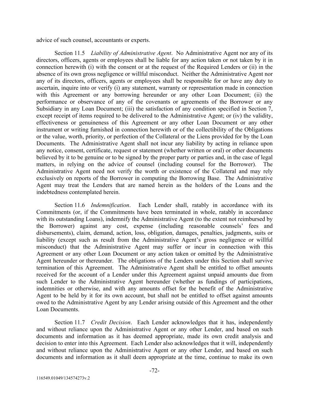 -72- 116549.01049/134574273v.2 advice of such counsel, accountants or experts. Section 11.5 Liability of Administrative Agent. No Administrative Agent nor any of its directors, officers, agents or employees shall be liable for any action taken or not taken by it in connection herewith (i) with the consent or at the request of the Required Lenders or (ii) in the absence of its own gross negligence or willful misconduct. Neither the Administrative Agent nor any of its directors, officers, agents or employees shall be responsible for or have any duty to ascertain, inquire into or verify (i) any statement, warranty or representation made in connection with this Agreement or any borrowing hereunder or any other Loan Document; (ii) the performance or observance of any of the covenants or agreements of the Borrower or any Subsidiary in any Loan Document; (iii) the satisfaction of any condition specified in Section 7, except receipt of items required to be delivered to the Administrative Agent; or (iv) the validity, effectiveness or genuineness of this Agreement or any other Loan Document or any other instrument or writing furnished in connection herewith or of the collectibility of the Obligations or the value, worth, priority, or perfection of the Collateral or the Liens provided for by the Loan Documents. The Administrative Agent shall not incur any liability by acting in reliance upon any notice, consent, certificate, request or statement (whether written or oral) or other documents believed by it to be genuine or to be signed by the proper party or parties and, in the case of legal matters, in relying on the advice of counsel (including counsel for the Borrower). The Administrative Agent need not verify the worth or existence of the Collateral and may rely exclusively on reports of the Borrower in computing the Borrowing Base. The Administrative Agent may treat the Lenders that are named herein as the holders of the Loans and the indebtedness contemplated herein. Section 11.6 Indemnification. Each Lender shall, ratably in accordance with its Commitments (or, if the Commitments have been terminated in whole, ratably in accordance with its outstanding Loans), indemnify the Administrative Agent (to the extent not reimbursed by the Borrower) against any cost, expense (including reasonable counsels’ fees and disbursements), claim, demand, action, loss, obligation, damages, penalties, judgments, suits or liability (except such as result from the Administrative Agent’s gross negligence or willful misconduct) that the Administrative Agent may suffer or incur in connection with this Agreement or any other Loan Document or any action taken or omitted by the Administrative Agent hereunder or thereunder. The obligations of the Lenders under this Section shall survive termination of this Agreement. The Administrative Agent shall be entitled to offset amounts received for the account of a Lender under this Agreement against unpaid amounts due from such Lender to the Administrative Agent hereunder (whether as fundings of participations, indemnities or otherwise, and with any amounts offset for the benefit of the Administrative Agent to be held by it for its own account, but shall not be entitled to offset against amounts owed to the Administrative Agent by any Lender arising outside of this Agreement and the other Loan Documents. Section 11.7 Credit Decision. Each Lender acknowledges that it has, independently and without reliance upon the Administrative Agent or any other Lender, and based on such documents and information as it has deemed appropriate, made its own credit analysis and decision to enter into this Agreement. Each Lender also acknowledges that it will, independently and without reliance upon the Administrative Agent or any other Lender, and based on such documents and information as it shall deem appropriate at the time, continue to make its own