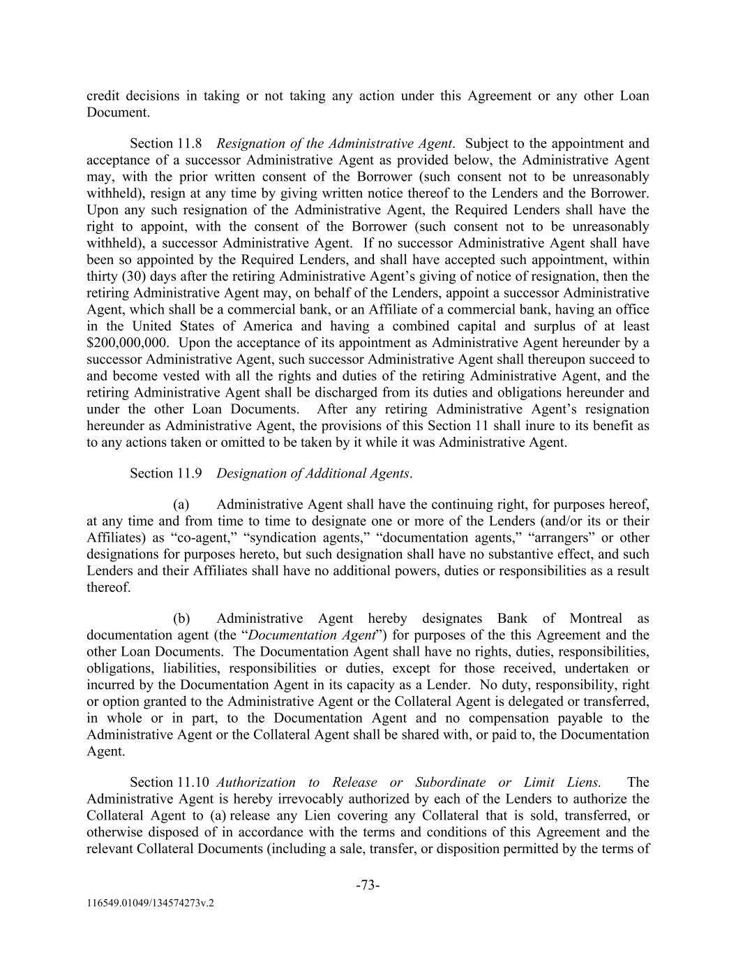 -73- 116549.01049/134574273v.2 credit decisions in taking or not taking any action under this Agreement or any other Loan Document. Section 11.8 Resignation of the Administrative Agent. Subject to the appointment and acceptance of a successor Administrative Agent as provided below, the Administrative Agent may, with the prior written consent of the Borrower (such consent not to be unreasonably withheld), resign at any time by giving written notice thereof to the Lenders and the Borrower. Upon any such resignation of the Administrative Agent, the Required Lenders shall have the right to appoint, with the consent of the Borrower (such consent not to be unreasonably withheld), a successor Administrative Agent. If no successor Administrative Agent shall have been so appointed by the Required Lenders, and shall have accepted such appointment, within thirty (30) days after the retiring Administrative Agent’s giving of notice of resignation, then the retiring Administrative Agent may, on behalf of the Lenders, appoint a successor Administrative Agent, which shall be a commercial bank, or an Affiliate of a commercial bank, having an office in the United States of America and having a combined capital and surplus of at least $200,000,000. Upon the acceptance of its appointment as Administrative Agent hereunder by a successor Administrative Agent, such successor Administrative Agent shall thereupon succeed to and become vested with all the rights and duties of the retiring Administrative Agent, and the retiring Administrative Agent shall be discharged from its duties and obligations hereunder and under the other Loan Documents. After any retiring Administrative Agent’s resignation hereunder as Administrative Agent, the provisions of this Section 11 shall inure to its benefit as to any actions taken or omitted to be taken by it while it was Administrative Agent. Section 11.9 Designation of Additional Agents. (a) Administrative Agent shall have the continuing right, for purposes hereof, at any time and from time to time to designate one or more of the Lenders (and/or its or their Affiliates) as “co-agent,” “syndication agents,” “documentation agents,” “arrangers” or other designations for purposes hereto, but such designation shall have no substantive effect, and such Lenders and their Affiliates shall have no additional powers, duties or responsibilities as a result thereof. (b) Administrative Agent hereby designates Bank of Montreal as documentation agent (the “Documentation Agent”) for purposes of the this Agreement and the other Loan Documents. The Documentation Agent shall have no rights, duties, responsibilities, obligations, liabilities, responsibilities or duties, except for those received, undertaken or incurred by the Documentation Agent in its capacity as a Lender. No duty, responsibility, right or option granted to the Administrative Agent or the Collateral Agent is delegated or transferred, in whole or in part, to the Documentation Agent and no compensation payable to the Administrative Agent or the Collateral Agent shall be shared with, or paid to, the Documentation Agent. Section 11.10 Authorization to Release or Subordinate or Limit Liens. The Administrative Agent is hereby irrevocably authorized by each of the Lenders to authorize the Collateral Agent to (a) release any Lien covering any Collateral that is sold, transferred, or otherwise disposed of in accordance with the terms and conditions of this Agreement and the relevant Collateral Documents (including a sale, transfer, or disposition permitted by the terms of