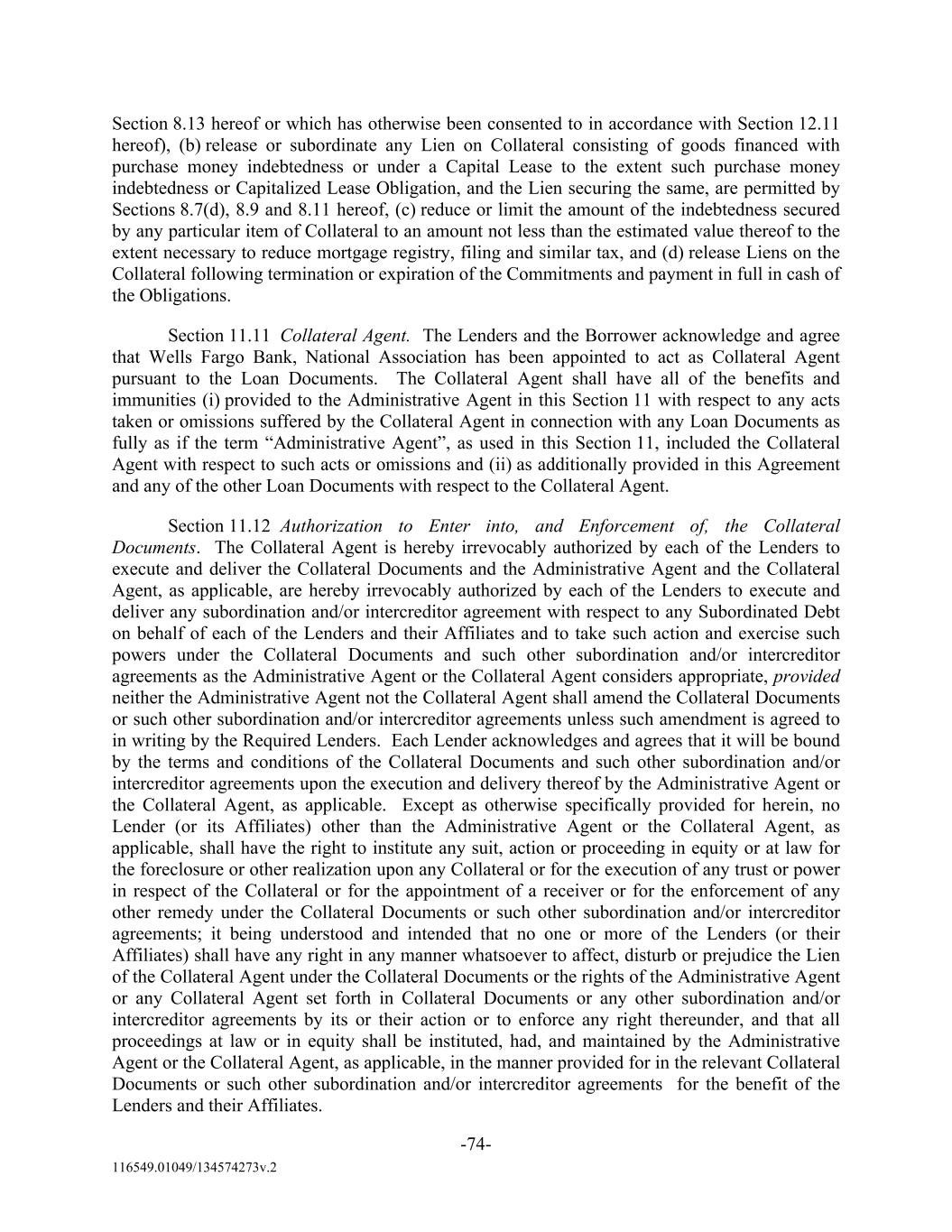 -74- 116549.01049/134574273v.2 Section 8.13 hereof or which has otherwise been consented to in accordance with Section 12.11 hereof), (b) release or subordinate any Lien on Collateral consisting of goods financed with purchase money indebtedness or under a Capital Lease to the extent such purchase money indebtedness or Capitalized Lease Obligation, and the Lien securing the same, are permitted by Sections 8.7(d), 8.9 and 8.11 hereof, (c) reduce or limit the amount of the indebtedness secured by any particular item of Collateral to an amount not less than the estimated value thereof to the extent necessary to reduce mortgage registry, filing and similar tax, and (d) release Liens on the Collateral following termination or expiration of the Commitments and payment in full in cash of the Obligations. Section 11.11 Collateral Agent. The Lenders and the Borrower acknowledge and agree that Wells Fargo Bank, National Association has been appointed to act as Collateral Agent pursuant to the Loan Documents. The Collateral Agent shall have all of the benefits and immunities (i) provided to the Administrative Agent in this Section 11 with respect to any acts taken or omissions suffered by the Collateral Agent in connection with any Loan Documents as fully as if the term “Administrative Agent”, as used in this Section 11, included the Collateral Agent with respect to such acts or omissions and (ii) as additionally provided in this Agreement and any of the other Loan Documents with respect to the Collateral Agent. Section 11.12 Authorization to Enter into, and Enforcement of, the Collateral Documents. The Collateral Agent is hereby irrevocably authorized by each of the Lenders to execute and deliver the Collateral Documents and the Administrative Agent and the Collateral Agent, as applicable, are hereby irrevocably authorized by each of the Lenders to execute and deliver any subordination and/or intercreditor agreement with respect to any Subordinated Debt on behalf of each of the Lenders and their Affiliates and to take such action and exercise such powers under the Collateral Documents and such other subordination and/or intercreditor agreements as the Administrative Agent or the Collateral Agent considers appropriate, provided neither the Administrative Agent not the Collateral Agent shall amend the Collateral Documents or such other subordination and/or intercreditor agreements unless such amendment is agreed to in writing by the Required Lenders. Each Lender acknowledges and agrees that it will be bound by the terms and conditions of the Collateral Documents and such other subordination and/or intercreditor agreements upon the execution and delivery thereof by the Administrative Agent or the Collateral Agent, as applicable. Except as otherwise specifically provided for herein, no Lender (or its Affiliates) other than the Administrative Agent or the Collateral Agent, as applicable, shall have the right to institute any suit, action or proceeding in equity or at law for the foreclosure or other realization upon any Collateral or for the execution of any trust or power in respect of the Collateral or for the appointment of a receiver or for the enforcement of any other remedy under the Collateral Documents or such other subordination and/or intercreditor agreements; it being understood and intended that no one or more of the Lenders (or their Affiliates) shall have any right in any manner whatsoever to affect, disturb or prejudice the Lien of the Collateral Agent under the Collateral Documents or the rights of the Administrative Agent or any Collateral Agent set forth in Collateral Documents or any other subordination and/or intercreditor agreements by its or their action or to enforce any right thereunder, and that all proceedings at law or in equity shall be instituted, had, and maintained by the Administrative Agent or the Collateral Agent, as applicable, in the manner provided for in the relevant Collateral Documents or such other subordination and/or intercreditor agreements for the benefit of the Lenders and their Affiliates.