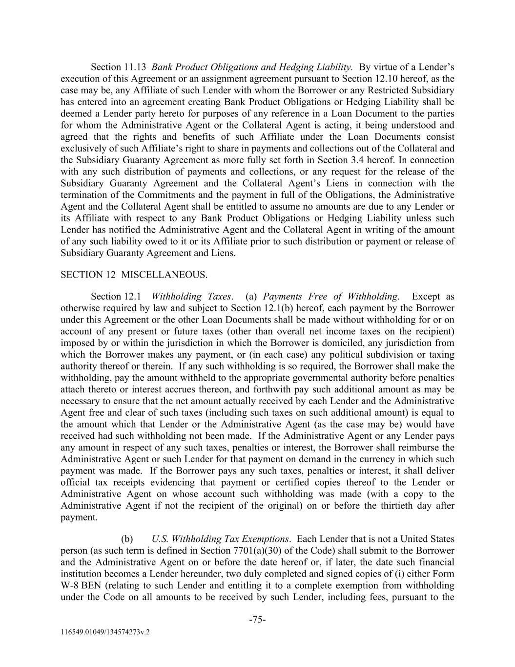 -75- 116549.01049/134574273v.2 Section 11.13 Bank Product Obligations and Hedging Liability. By virtue of a Lender’s execution of this Agreement or an assignment agreement pursuant to Section 12.10 hereof, as the case may be, any Affiliate of such Lender with whom the Borrower or any Restricted Subsidiary has entered into an agreement creating Bank Product Obligations or Hedging Liability shall be deemed a Lender party hereto for purposes of any reference in a Loan Document to the parties for whom the Administrative Agent or the Collateral Agent is acting, it being understood and agreed that the rights and benefits of such Affiliate under the Loan Documents consist exclusively of such Affiliate’s right to share in payments and collections out of the Collateral and the Subsidiary Guaranty Agreement as more fully set forth in Section 3.4 hereof. In connection with any such distribution of payments and collections, or any request for the release of the Subsidiary Guaranty Agreement and the Collateral Agent’s Liens in connection with the termination of the Commitments and the payment in full of the Obligations, the Administrative Agent and the Collateral Agent shall be entitled to assume no amounts are due to any Lender or its Affiliate with respect to any Bank Product Obligations or Hedging Liability unless such Lender has notified the Administrative Agent and the Collateral Agent in writing of the amount of any such liability owed to it or its Affiliate prior to such distribution or payment or release of Subsidiary Guaranty Agreement and Liens. SECTION 12 MISCELLANEOUS. Section 12.1 Withholding Taxes. (a) Payments Free of Withholding. Except as otherwise required by law and subject to Section 12.1(b) hereof, each payment by the Borrower under this Agreement or the other Loan Documents shall be made without withholding for or on account of any present or future taxes (other than overall net income taxes on the recipient) imposed by or within the jurisdiction in which the Borrower is domiciled, any jurisdiction from which the Borrower makes any payment, or (in each case) any political subdivision or taxing authority thereof or therein. If any such withholding is so required, the Borrower shall make the withholding, pay the amount withheld to the appropriate governmental authority before penalties attach thereto or interest accrues thereon, and forthwith pay such additional amount as may be necessary to ensure that the net amount actually received by each Lender and the Administrative Agent free and clear of such taxes (including such taxes on such additional amount) is equal to the amount which that Lender or the Administrative Agent (as the case may be) would have received had such withholding not been made. If the Administrative Agent or any Lender pays any amount in respect of any such taxes, penalties or interest, the Borrower shall reimburse the Administrative Agent or such Lender for that payment on demand in the currency in which such payment was made. If the Borrower pays any such taxes, penalties or interest, it shall deliver official tax receipts evidencing that payment or certified copies thereof to the Lender or Administrative Agent on whose account such withholding was made (with a copy to the Administrative Agent if not the recipient of the original) on or before the thirtieth day after payment. (b) U.S. Withholding Tax Exemptions. Each Lender that is not a United States person (as such term is defined in Section 7701(a)(30) of the Code) shall submit to the Borrower and the Administrative Agent on or before the date hereof or, if later, the date such financial institution becomes a Lender hereunder, two duly completed and signed copies of (i) either Form W-8 BEN (relating to such Lender and entitling it to a complete exemption from withholding under the Code on all amounts to be received by such Lender, including fees, pursuant to the