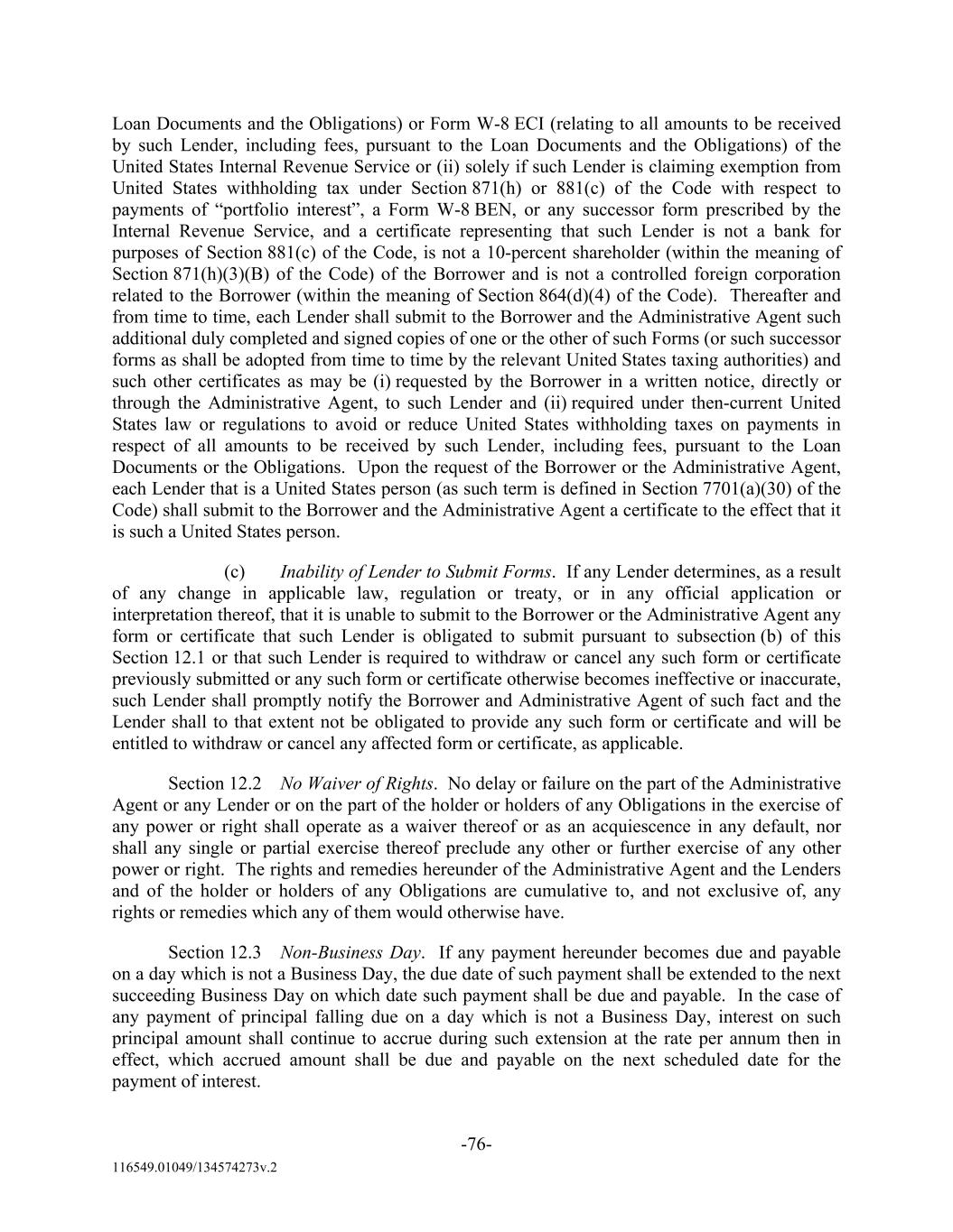-76- 116549.01049/134574273v.2 Loan Documents and the Obligations) or Form W-8 ECI (relating to all amounts to be received by such Lender, including fees, pursuant to the Loan Documents and the Obligations) of the United States Internal Revenue Service or (ii) solely if such Lender is claiming exemption from United States withholding tax under Section 871(h) or 881(c) of the Code with respect to payments of “portfolio interest”, a Form W-8 BEN, or any successor form prescribed by the Internal Revenue Service, and a certificate representing that such Lender is not a bank for purposes of Section 881(c) of the Code, is not a 10-percent shareholder (within the meaning of Section 871(h)(3)(B) of the Code) of the Borrower and is not a controlled foreign corporation related to the Borrower (within the meaning of Section 864(d)(4) of the Code). Thereafter and from time to time, each Lender shall submit to the Borrower and the Administrative Agent such additional duly completed and signed copies of one or the other of such Forms (or such successor forms as shall be adopted from time to time by the relevant United States taxing authorities) and such other certificates as may be (i) requested by the Borrower in a written notice, directly or through the Administrative Agent, to such Lender and (ii) required under then-current United States law or regulations to avoid or reduce United States withholding taxes on payments in respect of all amounts to be received by such Lender, including fees, pursuant to the Loan Documents or the Obligations. Upon the request of the Borrower or the Administrative Agent, each Lender that is a United States person (as such term is defined in Section 7701(a)(30) of the Code) shall submit to the Borrower and the Administrative Agent a certificate to the effect that it is such a United States person. (c) Inability of Lender to Submit Forms. If any Lender determines, as a result of any change in applicable law, regulation or treaty, or in any official application or interpretation thereof, that it is unable to submit to the Borrower or the Administrative Agent any form or certificate that such Lender is obligated to submit pursuant to subsection (b) of this Section 12.1 or that such Lender is required to withdraw or cancel any such form or certificate previously submitted or any such form or certificate otherwise becomes ineffective or inaccurate, such Lender shall promptly notify the Borrower and Administrative Agent of such fact and the Lender shall to that extent not be obligated to provide any such form or certificate and will be entitled to withdraw or cancel any affected form or certificate, as applicable. Section 12.2 No Waiver of Rights. No delay or failure on the part of the Administrative Agent or any Lender or on the part of the holder or holders of any Obligations in the exercise of any power or right shall operate as a waiver thereof or as an acquiescence in any default, nor shall any single or partial exercise thereof preclude any other or further exercise of any other power or right. The rights and remedies hereunder of the Administrative Agent and the Lenders and of the holder or holders of any Obligations are cumulative to, and not exclusive of, any rights or remedies which any of them would otherwise have. Section 12.3 Non-Business Day. If any payment hereunder becomes due and payable on a day which is not a Business Day, the due date of such payment shall be extended to the next succeeding Business Day on which date such payment shall be due and payable. In the case of any payment of principal falling due on a day which is not a Business Day, interest on such principal amount shall continue to accrue during such extension at the rate per annum then in effect, which accrued amount shall be due and payable on the next scheduled date for the payment of interest.