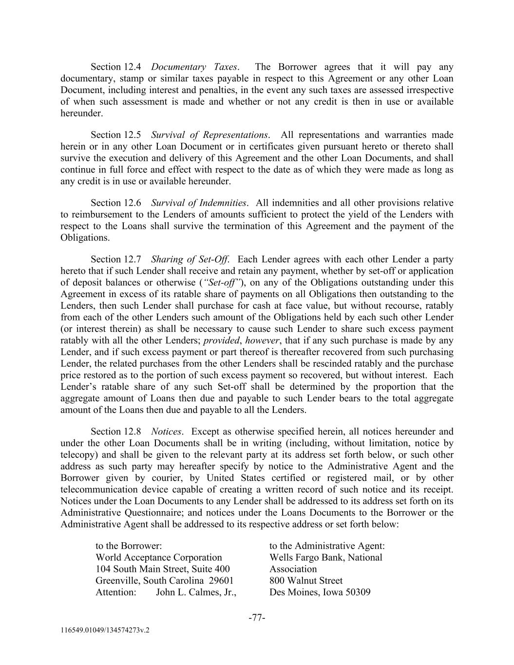 -77- 116549.01049/134574273v.2 Section 12.4 Documentary Taxes. The Borrower agrees that it will pay any documentary, stamp or similar taxes payable in respect to this Agreement or any other Loan Document, including interest and penalties, in the event any such taxes are assessed irrespective of when such assessment is made and whether or not any credit is then in use or available hereunder. Section 12.5 Survival of Representations. All representations and warranties made herein or in any other Loan Document or in certificates given pursuant hereto or thereto shall survive the execution and delivery of this Agreement and the other Loan Documents, and shall continue in full force and effect with respect to the date as of which they were made as long as any credit is in use or available hereunder. Section 12.6 Survival of Indemnities. All indemnities and all other provisions relative to reimbursement to the Lenders of amounts sufficient to protect the yield of the Lenders with respect to the Loans shall survive the termination of this Agreement and the payment of the Obligations. Section 12.7 Sharing of Set-Off. Each Lender agrees with each other Lender a party hereto that if such Lender shall receive and retain any payment, whether by set-off or application of deposit balances or otherwise (“Set-off”), on any of the Obligations outstanding under this Agreement in excess of its ratable share of payments on all Obligations then outstanding to the Lenders, then such Lender shall purchase for cash at face value, but without recourse, ratably from each of the other Lenders such amount of the Obligations held by each such other Lender (or interest therein) as shall be necessary to cause such Lender to share such excess payment ratably with all the other Lenders; provided, however, that if any such purchase is made by any Lender, and if such excess payment or part thereof is thereafter recovered from such purchasing Lender, the related purchases from the other Lenders shall be rescinded ratably and the purchase price restored as to the portion of such excess payment so recovered, but without interest. Each Lender’s ratable share of any such Set-off shall be determined by the proportion that the aggregate amount of Loans then due and payable to such Lender bears to the total aggregate amount of the Loans then due and payable to all the Lenders. Section 12.8 Notices. Except as otherwise specified herein, all notices hereunder and under the other Loan Documents shall be in writing (including, without limitation, notice by telecopy) and shall be given to the relevant party at its address set forth below, or such other address as such party may hereafter specify by notice to the Administrative Agent and the Borrower given by courier, by United States certified or registered mail, or by other telecommunication device capable of creating a written record of such notice and its receipt. Notices under the Loan Documents to any Lender shall be addressed to its address set forth on its Administrative Questionnaire; and notices under the Loans Documents to the Borrower or the Administrative Agent shall be addressed to its respective address or set forth below: to the Borrower: World Acceptance Corporation 104 South Main Street, Suite 400 Greenville, South Carolina 29601 Attention: John L. Calmes, Jr., to the Administrative Agent: Wells Fargo Bank, National Association 800 Walnut Street Des Moines, Iowa 50309