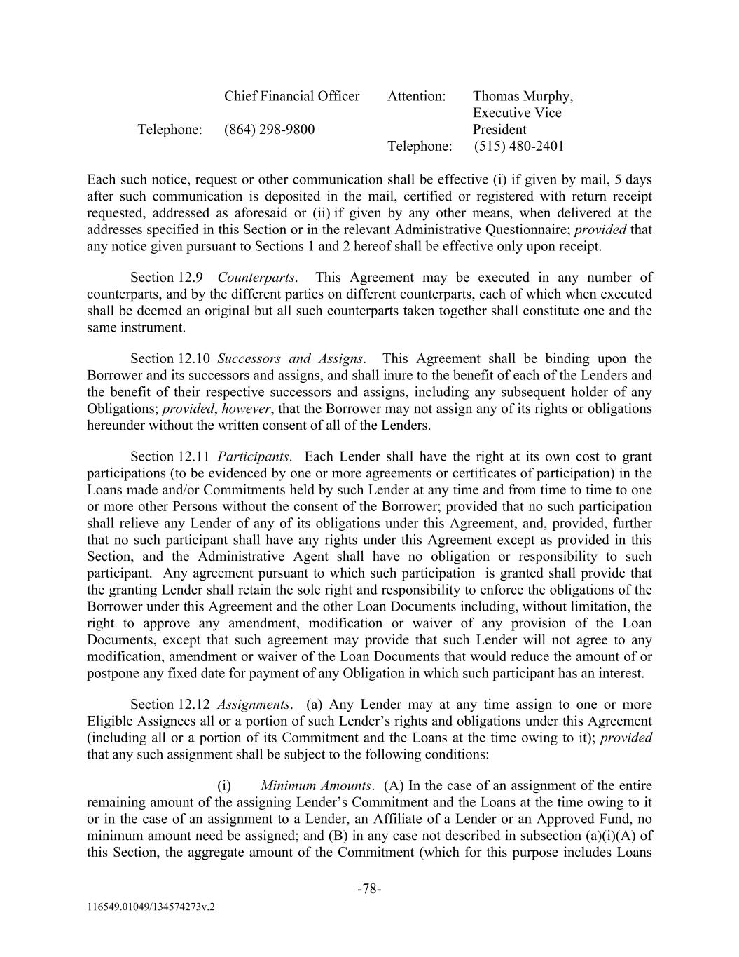 -78- 116549.01049/134574273v.2 Chief Financial Officer Telephone: (864) 298-9800 Attention: Thomas Murphy, Executive Vice President Telephone: (515) 480-2401 Each such notice, request or other communication shall be effective (i) if given by mail, 5 days after such communication is deposited in the mail, certified or registered with return receipt requested, addressed as aforesaid or (ii) if given by any other means, when delivered at the addresses specified in this Section or in the relevant Administrative Questionnaire; provided that any notice given pursuant to Sections 1 and 2 hereof shall be effective only upon receipt. Section 12.9 Counterparts. This Agreement may be executed in any number of counterparts, and by the different parties on different counterparts, each of which when executed shall be deemed an original but all such counterparts taken together shall constitute one and the same instrument. Section 12.10 Successors and Assigns. This Agreement shall be binding upon the Borrower and its successors and assigns, and shall inure to the benefit of each of the Lenders and the benefit of their respective successors and assigns, including any subsequent holder of any Obligations; provided, however, that the Borrower may not assign any of its rights or obligations hereunder without the written consent of all of the Lenders. Section 12.11 Participants. Each Lender shall have the right at its own cost to grant participations (to be evidenced by one or more agreements or certificates of participation) in the Loans made and/or Commitments held by such Lender at any time and from time to time to one or more other Persons without the consent of the Borrower; provided that no such participation shall relieve any Lender of any of its obligations under this Agreement, and, provided, further that no such participant shall have any rights under this Agreement except as provided in this Section, and the Administrative Agent shall have no obligation or responsibility to such participant. Any agreement pursuant to which such participation is granted shall provide that the granting Lender shall retain the sole right and responsibility to enforce the obligations of the Borrower under this Agreement and the other Loan Documents including, without limitation, the right to approve any amendment, modification or waiver of any provision of the Loan Documents, except that such agreement may provide that such Lender will not agree to any modification, amendment or waiver of the Loan Documents that would reduce the amount of or postpone any fixed date for payment of any Obligation in which such participant has an interest. Section 12.12 Assignments. (a) Any Lender may at any time assign to one or more Eligible Assignees all or a portion of such Lender’s rights and obligations under this Agreement (including all or a portion of its Commitment and the Loans at the time owing to it); provided that any such assignment shall be subject to the following conditions: (i) Minimum Amounts. (A) In the case of an assignment of the entire remaining amount of the assigning Lender’s Commitment and the Loans at the time owing to it or in the case of an assignment to a Lender, an Affiliate of a Lender or an Approved Fund, no minimum amount need be assigned; and (B) in any case not described in subsection (a)(i)(A) of this Section, the aggregate amount of the Commitment (which for this purpose includes Loans