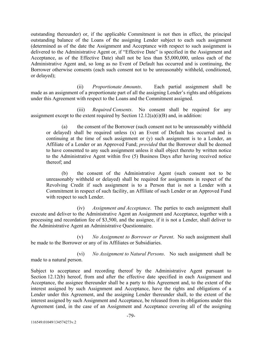 -79- 116549.01049/134574273v.2 outstanding thereunder) or, if the applicable Commitment is not then in effect, the principal outstanding balance of the Loans of the assigning Lender subject to each such assignment (determined as of the date the Assignment and Acceptance with respect to such assignment is delivered to the Administrative Agent or, if “Effective Date” is specified in the Assignment and Acceptance, as of the Effective Date) shall not be less than $5,000,000, unless each of the Administrative Agent and, so long as no Event of Default has occurred and is continuing, the Borrower otherwise consents (each such consent not to be unreasonably withheld, conditioned, or delayed); (ii) Proportionate Amounts. Each partial assignment shall be made as an assignment of a proportionate part of all the assigning Lender’s rights and obligations under this Agreement with respect to the Loans and the Commitment assigned. (iii) Required Consents. No consent shall be required for any assignment except to the extent required by Section 12.12(a)(i)(B) and, in addition: (a) the consent of the Borrower (such consent not to be unreasonably withheld or delayed) shall be required unless (x) an Event of Default has occurred and is continuing at the time of such assignment or (y) such assignment is to a Lender, an Affiliate of a Lender or an Approved Fund; provided that the Borrower shall be deemed to have consented to any such assignment unless it shall object thereto by written notice to the Administrative Agent within five (5) Business Days after having received notice thereof; and (b) the consent of the Administrative Agent (such consent not to be unreasonably withheld or delayed) shall be required for assignments in respect of the Revolving Credit if such assignment is to a Person that is not a Lender with a Commitment in respect of such facility, an Affiliate of such Lender or an Approved Fund with respect to such Lender. (iv) Assignment and Acceptance. The parties to each assignment shall execute and deliver to the Administrative Agent an Assignment and Acceptance, together with a processing and recordation fee of $3,500, and the assignee, if it is not a Lender, shall deliver to the Administrative Agent an Administrative Questionnaire. (v) No Assignment to Borrower or Parent. No such assignment shall be made to the Borrower or any of its Affiliates or Subsidiaries. (vi) No Assignment to Natural Persons. No such assignment shall be made to a natural person. Subject to acceptance and recording thereof by the Administrative Agent pursuant to Section 12.12(b) hereof, from and after the effective date specified in each Assignment and Acceptance, the assignee thereunder shall be a party to this Agreement and, to the extent of the interest assigned by such Assignment and Acceptance, have the rights and obligations of a Lender under this Agreement, and the assigning Lender thereunder shall, to the extent of the interest assigned by such Assignment and Acceptance, be released from its obligations under this Agreement (and, in the case of an Assignment and Acceptance covering all of the assigning