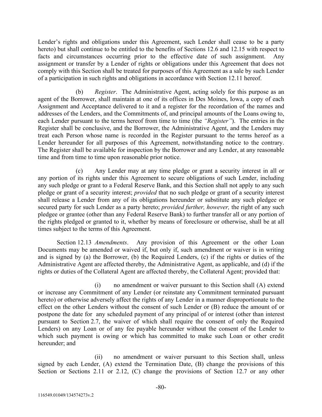 -80- 116549.01049/134574273v.2 Lender’s rights and obligations under this Agreement, such Lender shall cease to be a party hereto) but shall continue to be entitled to the benefits of Sections 12.6 and 12.15 with respect to facts and circumstances occurring prior to the effective date of such assignment. Any assignment or transfer by a Lender of rights or obligations under this Agreement that does not comply with this Section shall be treated for purposes of this Agreement as a sale by such Lender of a participation in such rights and obligations in accordance with Section 12.11 hereof. (b) Register. The Administrative Agent, acting solely for this purpose as an agent of the Borrower, shall maintain at one of its offices in Des Moines, Iowa, a copy of each Assignment and Acceptance delivered to it and a register for the recordation of the names and addresses of the Lenders, and the Commitments of, and principal amounts of the Loans owing to, each Lender pursuant to the terms hereof from time to time (the “Register”). The entries in the Register shall be conclusive, and the Borrower, the Administrative Agent, and the Lenders may treat each Person whose name is recorded in the Register pursuant to the terms hereof as a Lender hereunder for all purposes of this Agreement, notwithstanding notice to the contrary. The Register shall be available for inspection by the Borrower and any Lender, at any reasonable time and from time to time upon reasonable prior notice. (c) Any Lender may at any time pledge or grant a security interest in all or any portion of its rights under this Agreement to secure obligations of such Lender, including any such pledge or grant to a Federal Reserve Bank, and this Section shall not apply to any such pledge or grant of a security interest; provided that no such pledge or grant of a security interest shall release a Lender from any of its obligations hereunder or substitute any such pledgee or secured party for such Lender as a party hereto; provided further, however, the right of any such pledgee or grantee (other than any Federal Reserve Bank) to further transfer all or any portion of the rights pledged or granted to it, whether by means of foreclosure or otherwise, shall be at all times subject to the terms of this Agreement. Section 12.13 Amendments. Any provision of this Agreement or the other Loan Documents may be amended or waived if, but only if, such amendment or waiver is in writing and is signed by (a) the Borrower, (b) the Required Lenders, (c) if the rights or duties of the Administrative Agent are affected thereby, the Administrative Agent, as applicable, and (d) if the rights or duties of the Collateral Agent are affected thereby, the Collateral Agent; provided that: (i) no amendment or waiver pursuant to this Section shall (A) extend or increase any Commitment of any Lender (or reinstate any Commitment terminated pursuant hereto) or otherwise adversely affect the rights of any Lender in a manner disproportionate to the effect on the other Lenders without the consent of such Lender or (B) reduce the amount of or postpone the date for any scheduled payment of any principal of or interest (other than interest pursuant to Section 2.7, the waiver of which shall require the consent of only the Required Lenders) on any Loan or of any fee payable hereunder without the consent of the Lender to which such payment is owing or which has committed to make such Loan or other credit hereunder; and (ii) no amendment or waiver pursuant to this Section shall, unless signed by each Lender, (A) extend the Termination Date, (B) change the provisions of this Section or Sections 2.11 or 2.12, (C) change the provisions of Section 12.7 or any other