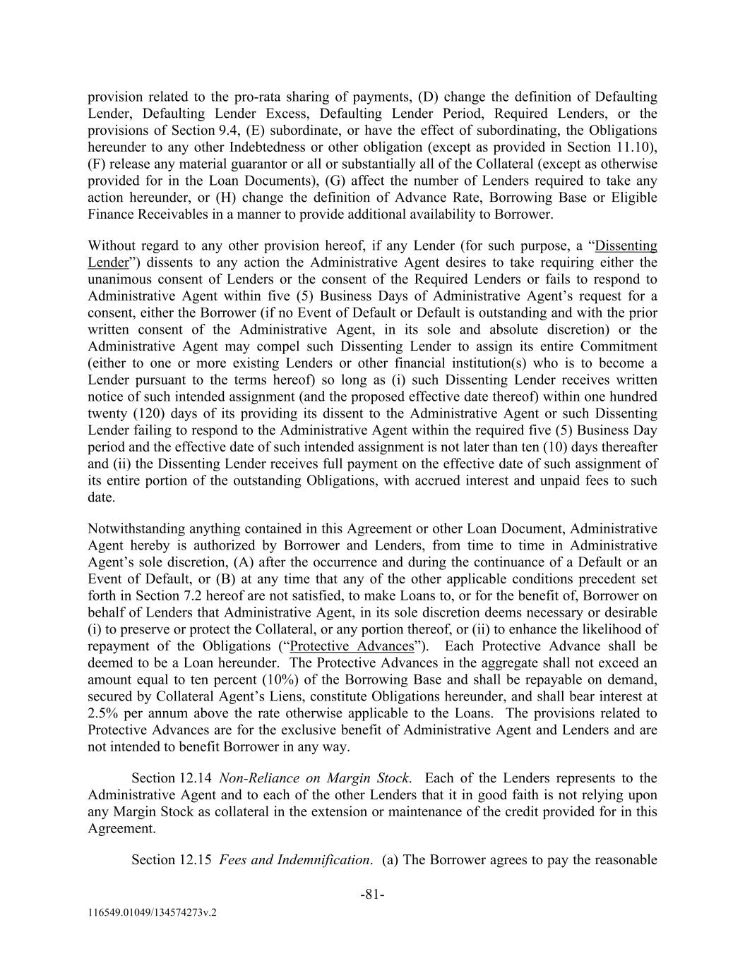 -81- 116549.01049/134574273v.2 provision related to the pro-rata sharing of payments, (D) change the definition of Defaulting Lender, Defaulting Lender Excess, Defaulting Lender Period, Required Lenders, or the provisions of Section 9.4, (E) subordinate, or have the effect of subordinating, the Obligations hereunder to any other Indebtedness or other obligation (except as provided in Section 11.10), (F) release any material guarantor or all or substantially all of the Collateral (except as otherwise provided for in the Loan Documents), (G) affect the number of Lenders required to take any action hereunder, or (H) change the definition of Advance Rate, Borrowing Base or Eligible Finance Receivables in a manner to provide additional availability to Borrower. Without regard to any other provision hereof, if any Lender (for such purpose, a “Dissenting Lender”) dissents to any action the Administrative Agent desires to take requiring either the unanimous consent of Lenders or the consent of the Required Lenders or fails to respond to Administrative Agent within five (5) Business Days of Administrative Agent’s request for a consent, either the Borrower (if no Event of Default or Default is outstanding and with the prior written consent of the Administrative Agent, in its sole and absolute discretion) or the Administrative Agent may compel such Dissenting Lender to assign its entire Commitment (either to one or more existing Lenders or other financial institution(s) who is to become a Lender pursuant to the terms hereof) so long as (i) such Dissenting Lender receives written notice of such intended assignment (and the proposed effective date thereof) within one hundred twenty (120) days of its providing its dissent to the Administrative Agent or such Dissenting Lender failing to respond to the Administrative Agent within the required five (5) Business Day period and the effective date of such intended assignment is not later than ten (10) days thereafter and (ii) the Dissenting Lender receives full payment on the effective date of such assignment of its entire portion of the outstanding Obligations, with accrued interest and unpaid fees to such date. Notwithstanding anything contained in this Agreement or other Loan Document, Administrative Agent hereby is authorized by Borrower and Lenders, from time to time in Administrative Agent’s sole discretion, (A) after the occurrence and during the continuance of a Default or an Event of Default, or (B) at any time that any of the other applicable conditions precedent set forth in Section 7.2 hereof are not satisfied, to make Loans to, or for the benefit of, Borrower on behalf of Lenders that Administrative Agent, in its sole discretion deems necessary or desirable (i) to preserve or protect the Collateral, or any portion thereof, or (ii) to enhance the likelihood of repayment of the Obligations (“Protective Advances”). Each Protective Advance shall be deemed to be a Loan hereunder. The Protective Advances in the aggregate shall not exceed an amount equal to ten percent (10%) of the Borrowing Base and shall be repayable on demand, secured by Collateral Agent’s Liens, constitute Obligations hereunder, and shall bear interest at 2.5% per annum above the rate otherwise applicable to the Loans. The provisions related to Protective Advances are for the exclusive benefit of Administrative Agent and Lenders and are not intended to benefit Borrower in any way. Section 12.14 Non-Reliance on Margin Stock. Each of the Lenders represents to the Administrative Agent and to each of the other Lenders that it in good faith is not relying upon any Margin Stock as collateral in the extension or maintenance of the credit provided for in this Agreement. Section 12.15 Fees and Indemnification. (a) The Borrower agrees to pay the reasonable