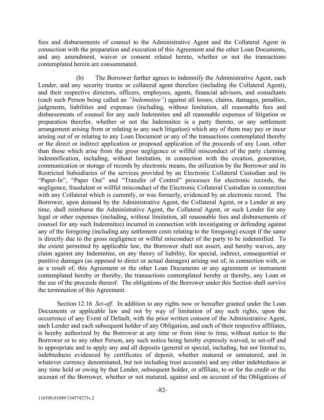 -82- 116549.01049/134574273v.2 fees and disbursements of counsel to the Administrative Agent and the Collateral Agent in connection with the preparation and execution of this Agreement and the other Loan Documents, and any amendment, waiver or consent related hereto, whether or not the transactions contemplated herein are consummated. (b) The Borrower further agrees to indemnify the Administrative Agent, each Lender, and any security trustee or collateral agent therefore (including the Collateral Agent), and their respective directors, officers, employees, agents, financial advisors, and consultants (each such Person being called an “Indemnitee”) against all losses, claims, damages, penalties, judgments, liabilities and expenses (including, without limitation, all reasonable fees and disbursements of counsel for any such Indemnitee and all reasonable expenses of litigation or preparation therefor, whether or not the Indemnitee is a party thereto, or any settlement arrangement arising from or relating to any such litigation) which any of them may pay or incur arising out of or relating to any Loan Document or any of the transactions contemplated thereby or the direct or indirect application or proposed application of the proceeds of any Loan, other than those which arise from the gross negligence or willful misconduct of the party claiming indemnification, including, without limitation, in connection with the creation, generation, communication or storage of records by electronic means, the utilization by the Borrower and its Restricted Subsidiaries of the services provided by an Electronic Collateral Custodian and its “Paper-In”, “Paper Out” and “Transfer of Control” processes for electronic records, the negligence, fraudulent or willful misconduct of the Electronic Collateral Custodian in connection with any Collateral which is currently, or was formerly, evidenced by an electronic record. The Borrower, upon demand by the Administrative Agent, the Collateral Agent, or a Lender at any time, shall reimburse the Administrative Agent, the Collateral Agent, or such Lender for any legal or other expenses (including, without limitation, all reasonable fees and disbursements of counsel for any such Indemnitee) incurred in connection with investigating or defending against any of the foregoing (including any settlement costs relating to the foregoing) except if the same is directly due to the gross negligence or willful misconduct of the party to be indemnified. To the extent permitted by applicable law, the Borrower shall not assert, and hereby waives, any claim against any Indemnitee, on any theory of liability, for special, indirect, consequential or punitive damages (as opposed to direct or actual damages) arising out of, in connection with, or as a result of, this Agreement or the other Loan Documents or any agreement or instrument contemplated hereby or thereby, the transactions contemplated hereby or thereby, any Loan or the use of the proceeds thereof. The obligations of the Borrower under this Section shall survive the termination of this Agreement. Section 12.16 Set-off. In addition to any rights now or hereafter granted under the Loan Documents or applicable law and not by way of limitation of any such rights, upon the occurrence of any Event of Default, with the prior written consent of the Administrative Agent, each Lender and each subsequent holder of any Obligation, and each of their respective affiliates, is hereby authorized by the Borrower at any time or from time to time, without notice to the Borrower or to any other Person, any such notice being hereby expressly waived, to set-off and to appropriate and to apply any and all deposits (general or special, including, but not limited to, indebtedness evidenced by certificates of deposit, whether matured or unmatured, and in whatever currency denominated, but not including trust accounts) and any other indebtedness at any time held or owing by that Lender, subsequent holder, or affiliate, to or for the credit or the account of the Borrower, whether or not matured, against and on account of the Obligations of