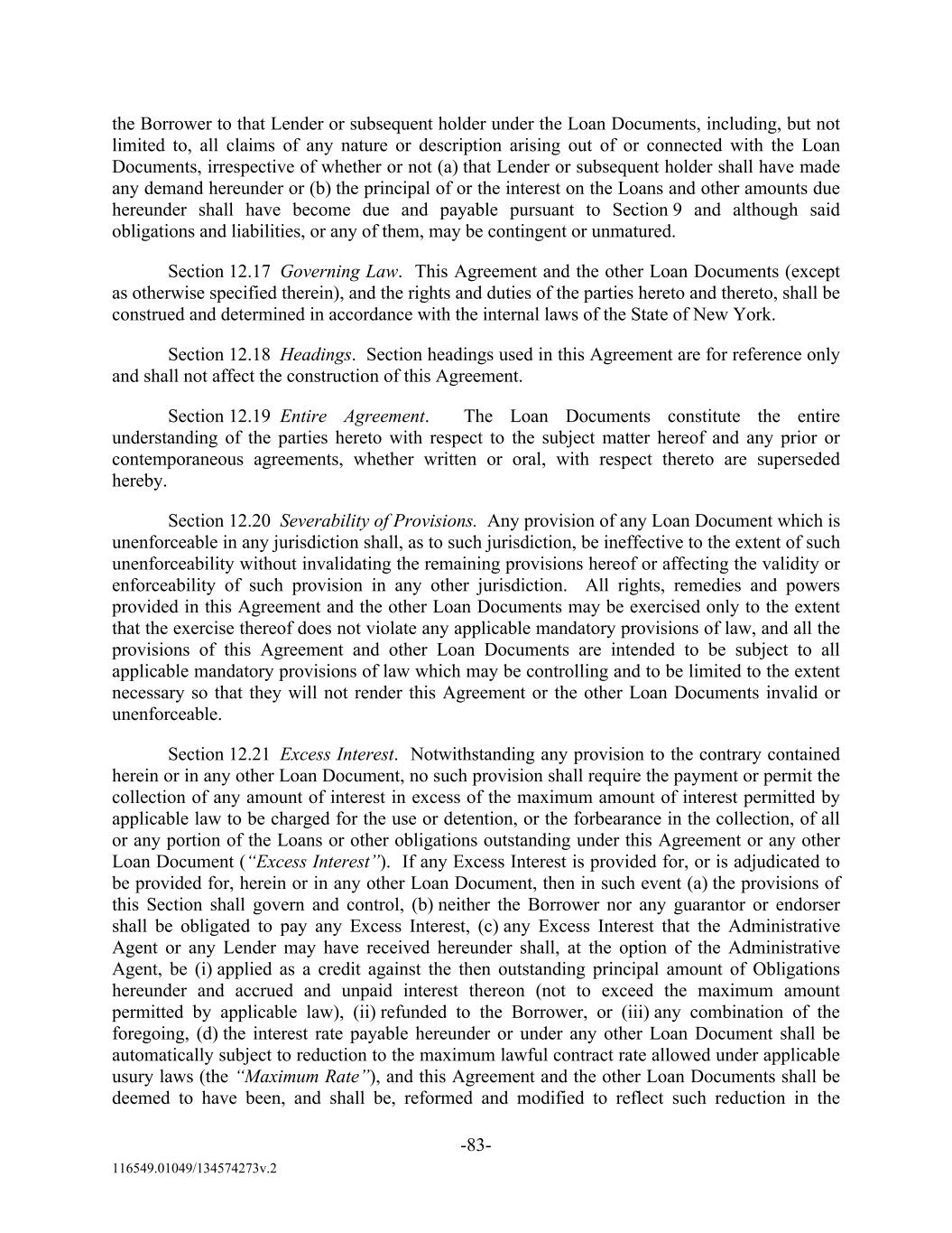 -83- 116549.01049/134574273v.2 the Borrower to that Lender or subsequent holder under the Loan Documents, including, but not limited to, all claims of any nature or description arising out of or connected with the Loan Documents, irrespective of whether or not (a) that Lender or subsequent holder shall have made any demand hereunder or (b) the principal of or the interest on the Loans and other amounts due hereunder shall have become due and payable pursuant to Section 9 and although said obligations and liabilities, or any of them, may be contingent or unmatured. Section 12.17 Governing Law. This Agreement and the other Loan Documents (except as otherwise specified therein), and the rights and duties of the parties hereto and thereto, shall be construed and determined in accordance with the internal laws of the State of New York. Section 12.18 Headings. Section headings used in this Agreement are for reference only and shall not affect the construction of this Agreement. Section 12.19 Entire Agreement. The Loan Documents constitute the entire understanding of the parties hereto with respect to the subject matter hereof and any prior or contemporaneous agreements, whether written or oral, with respect thereto are superseded hereby. Section 12.20 Severability of Provisions. Any provision of any Loan Document which is unenforceable in any jurisdiction shall, as to such jurisdiction, be ineffective to the extent of such unenforceability without invalidating the remaining provisions hereof or affecting the validity or enforceability of such provision in any other jurisdiction. All rights, remedies and powers provided in this Agreement and the other Loan Documents may be exercised only to the extent that the exercise thereof does not violate any applicable mandatory provisions of law, and all the provisions of this Agreement and other Loan Documents are intended to be subject to all applicable mandatory provisions of law which may be controlling and to be limited to the extent necessary so that they will not render this Agreement or the other Loan Documents invalid or unenforceable. Section 12.21 Excess Interest. Notwithstanding any provision to the contrary contained herein or in any other Loan Document, no such provision shall require the payment or permit the collection of any amount of interest in excess of the maximum amount of interest permitted by applicable law to be charged for the use or detention, or the forbearance in the collection, of all or any portion of the Loans or other obligations outstanding under this Agreement or any other Loan Document (“Excess Interest”). If any Excess Interest is provided for, or is adjudicated to be provided for, herein or in any other Loan Document, then in such event (a) the provisions of this Section shall govern and control, (b) neither the Borrower nor any guarantor or endorser shall be obligated to pay any Excess Interest, (c) any Excess Interest that the Administrative Agent or any Lender may have received hereunder shall, at the option of the Administrative Agent, be (i) applied as a credit against the then outstanding principal amount of Obligations hereunder and accrued and unpaid interest thereon (not to exceed the maximum amount permitted by applicable law), (ii) refunded to the Borrower, or (iii) any combination of the foregoing, (d) the interest rate payable hereunder or under any other Loan Document shall be automatically subject to reduction to the maximum lawful contract rate allowed under applicable usury laws (the “Maximum Rate”), and this Agreement and the other Loan Documents shall be deemed to have been, and shall be, reformed and modified to reflect such reduction in the