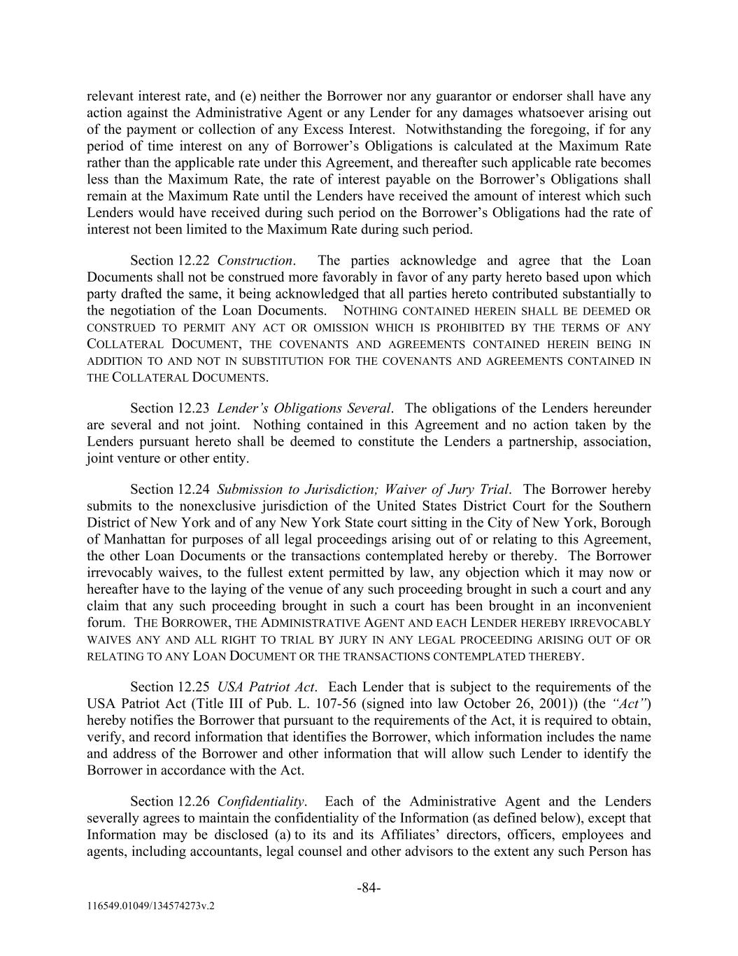 -84- 116549.01049/134574273v.2 relevant interest rate, and (e) neither the Borrower nor any guarantor or endorser shall have any action against the Administrative Agent or any Lender for any damages whatsoever arising out of the payment or collection of any Excess Interest. Notwithstanding the foregoing, if for any period of time interest on any of Borrower’s Obligations is calculated at the Maximum Rate rather than the applicable rate under this Agreement, and thereafter such applicable rate becomes less than the Maximum Rate, the rate of interest payable on the Borrower’s Obligations shall remain at the Maximum Rate until the Lenders have received the amount of interest which such Lenders would have received during such period on the Borrower’s Obligations had the rate of interest not been limited to the Maximum Rate during such period. Section 12.22 Construction. The parties acknowledge and agree that the Loan Documents shall not be construed more favorably in favor of any party hereto based upon which party drafted the same, it being acknowledged that all parties hereto contributed substantially to the negotiation of the Loan Documents. NOTHING CONTAINED HEREIN SHALL BE DEEMED OR CONSTRUED TO PERMIT ANY ACT OR OMISSION WHICH IS PROHIBITED BY THE TERMS OF ANY COLLATERAL DOCUMENT, THE COVENANTS AND AGREEMENTS CONTAINED HEREIN BEING IN ADDITION TO AND NOT IN SUBSTITUTION FOR THE COVENANTS AND AGREEMENTS CONTAINED IN THE COLLATERAL DOCUMENTS. Section 12.23 Lender’s Obligations Several. The obligations of the Lenders hereunder are several and not joint. Nothing contained in this Agreement and no action taken by the Lenders pursuant hereto shall be deemed to constitute the Lenders a partnership, association, joint venture or other entity. Section 12.24 Submission to Jurisdiction; Waiver of Jury Trial. The Borrower hereby submits to the nonexclusive jurisdiction of the United States District Court for the Southern District of New York and of any New York State court sitting in the City of New York, Borough of Manhattan for purposes of all legal proceedings arising out of or relating to this Agreement, the other Loan Documents or the transactions contemplated hereby or thereby. The Borrower irrevocably waives, to the fullest extent permitted by law, any objection which it may now or hereafter have to the laying of the venue of any such proceeding brought in such a court and any claim that any such proceeding brought in such a court has been brought in an inconvenient forum. THE BORROWER, THE ADMINISTRATIVE AGENT AND EACH LENDER HEREBY IRREVOCABLY WAIVES ANY AND ALL RIGHT TO TRIAL BY JURY IN ANY LEGAL PROCEEDING ARISING OUT OF OR RELATING TO ANY LOAN DOCUMENT OR THE TRANSACTIONS CONTEMPLATED THEREBY. Section 12.25 USA Patriot Act. Each Lender that is subject to the requirements of the USA Patriot Act (Title III of Pub. L. 107-56 (signed into law October 26, 2001)) (the “Act”) hereby notifies the Borrower that pursuant to the requirements of the Act, it is required to obtain, verify, and record information that identifies the Borrower, which information includes the name and address of the Borrower and other information that will allow such Lender to identify the Borrower in accordance with the Act. Section 12.26 Confidentiality. Each of the Administrative Agent and the Lenders severally agrees to maintain the confidentiality of the Information (as defined below), except that Information may be disclosed (a) to its and its Affiliates’ directors, officers, employees and agents, including accountants, legal counsel and other advisors to the extent any such Person has